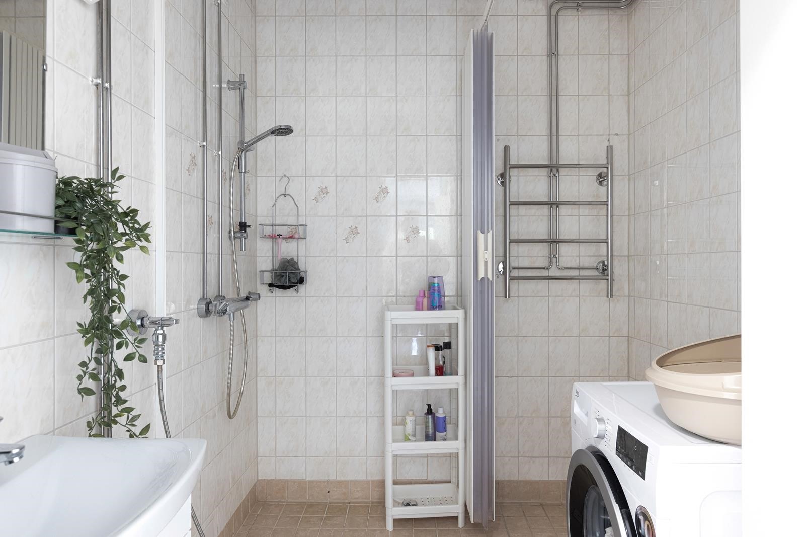 - Kylpyhuone, erillinen wc, suihku, suihkuseinä, peilit, allaskaappi, pesukoneliitäntä, lattialämmitys, kiinteät valaisimet.