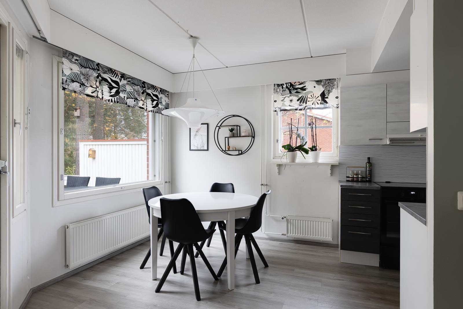 - Keittiö: maalia, vinyylilattia. Olohuone: maalia/tapettia, vinyylilattia. Makuuhuone 1: maalia/tapettia, vinyylilattia. Makuuhuone 2: maalia/tapettia, vinyylilattia. Makuuhuone 3: maalia,/tapettia, vinyylilattia. Kodinhoitohuone: maalia, laattaa. Sauna: paneelia, laattaa. Kylpyhuone: kaakelia, laattaa. Eteinen: maalia, vinyylilattia. Wc: maalia/kaakelia, vinyylilattia.