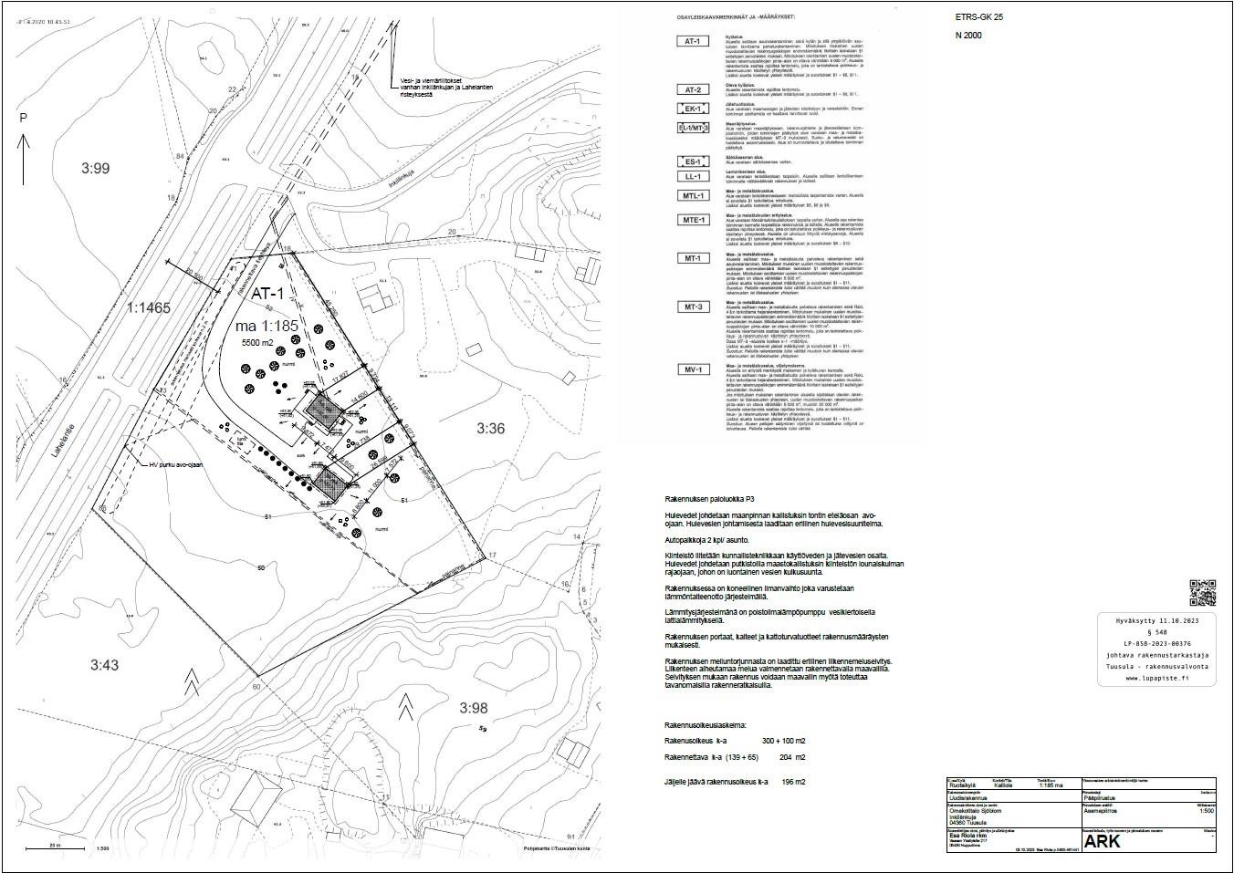 Luvalla haettu kerrosala on 211 m² ja rakennusoikeudellinen kerrosala on 205 m². 11.10.2021 myönteisen suunnittelutarveratkaisun (LP-858-2021-00805). Pientalo 146 k-m². Katoksia rakennuksessa on 4 m². Talousrakennus 65 k-m². Jäljelle jäävä rakennusoikeus k-a 195 m2. Rakennuslupa 25.10.2023. Lupatunnus LP-85-2023-00376. Pientalon, talousrakennuksen ja meluvallin rakentaminen. Rakennustyöt on aloitettava viimeistään 28.10.2026 ja saatettava loppuun 28.10.2028 mennessä. Lupa raukeaa, mikäli voimassaoloaikaa ei erityisestä syystä pidennetä. Luvan pääpiirustukset saatavissa välittäjältä.