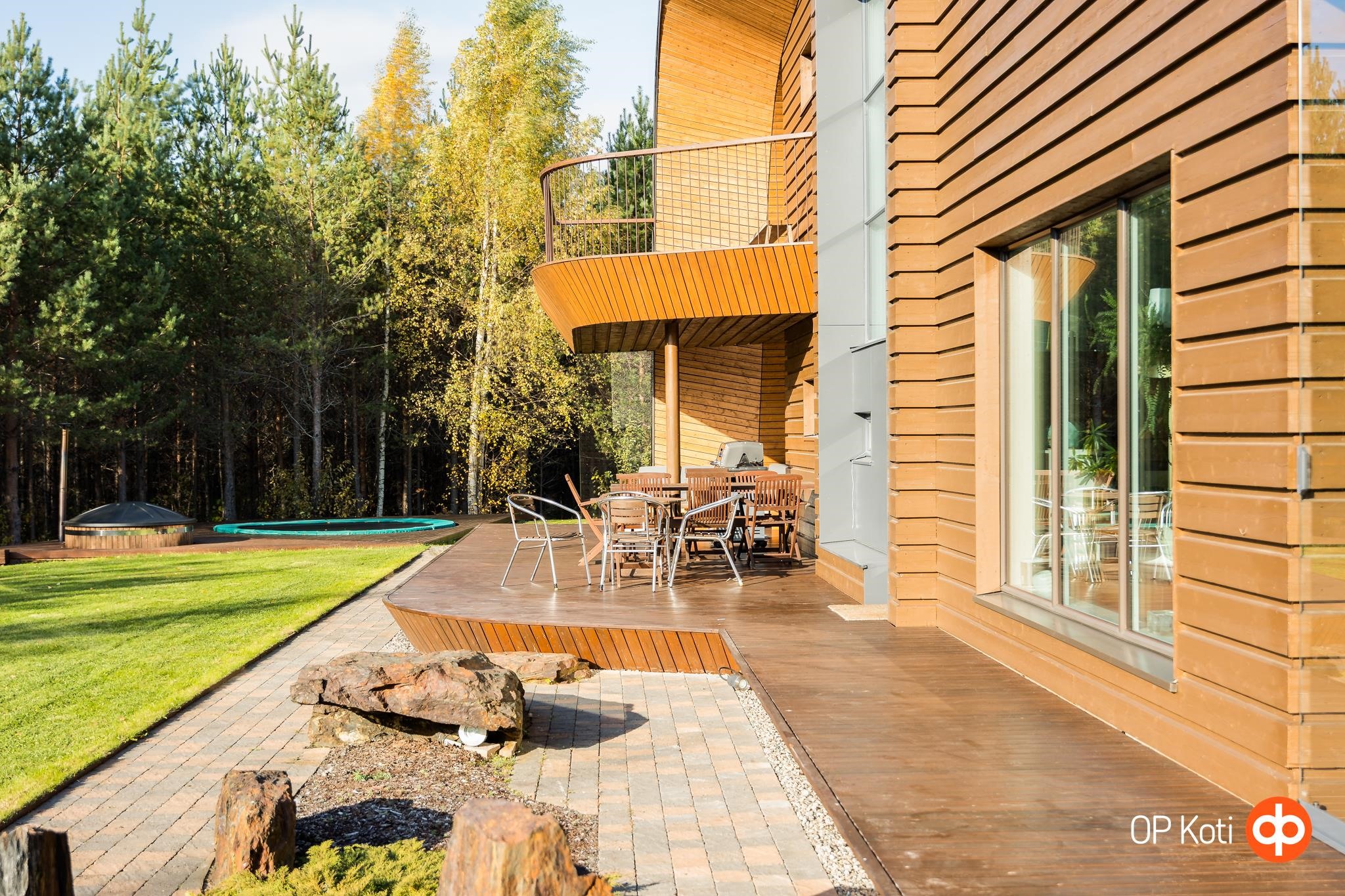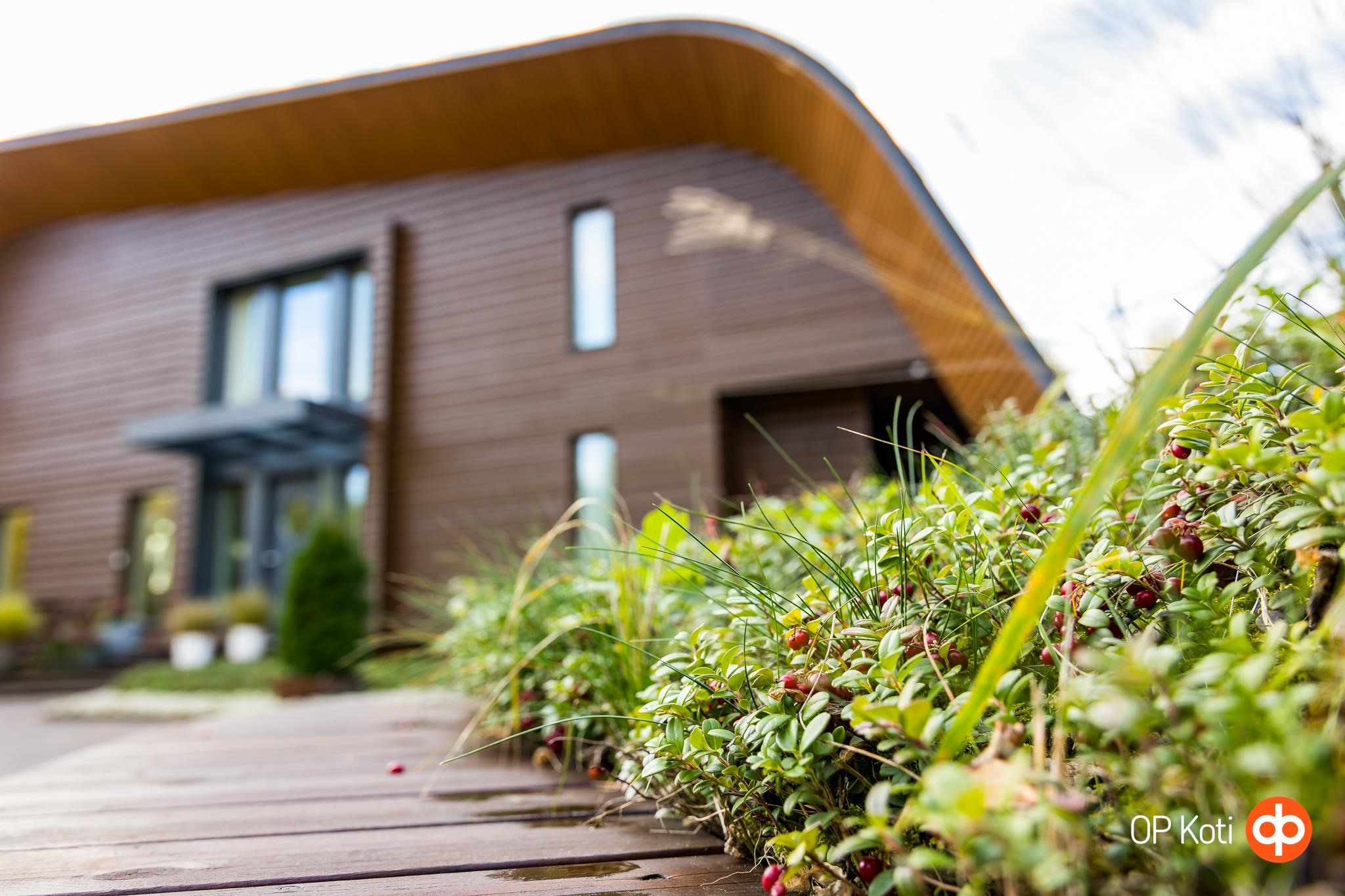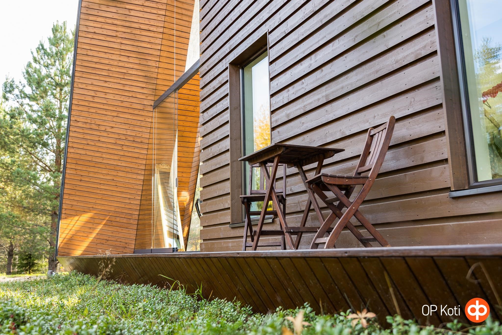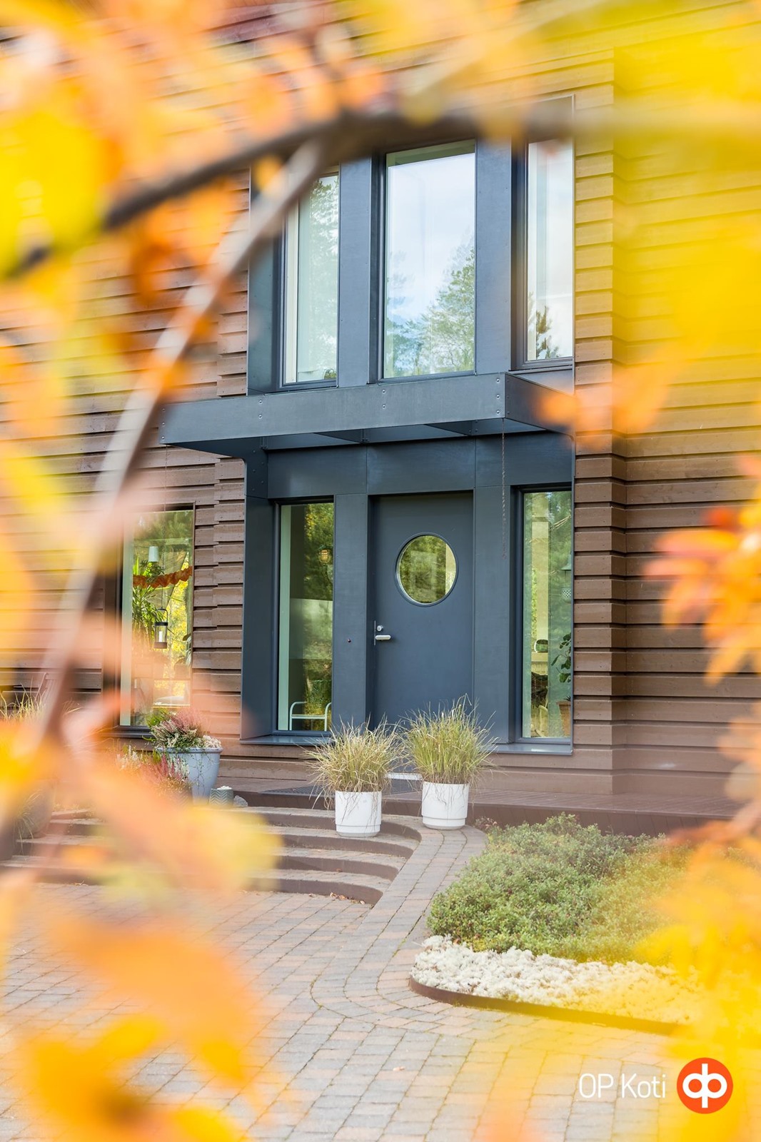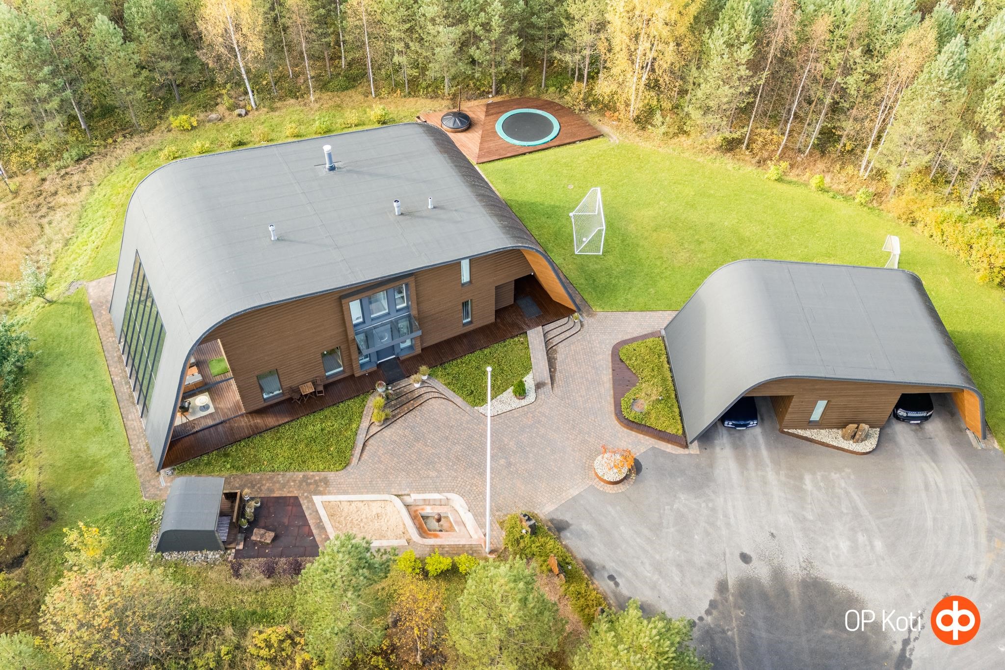 Rakennus on sijoitettu tontin korkeimmalle kohdalle kallion päälle, ja se on suunniteltu auringon kierron mukaan. Aamuaurinko valaisee keittiön, kun taas ilta-aurinko hellii parveketta ja paljuun johtavaa terassia. Helppohoitoinen pihapiiri on oma universuminsa, jossa on asfalttipiha lasten leikkeihin, maahan upotettu trampoliini, katettu grillinurkkaus ja robottiruohonleikkuri. Omenapuut ja marjapensaat tuovat satoa, ja pihametsikkö antaa suojaa. Autot saat suojaan kahden katoksen alle, joiden yhteydessä on lämmin varasto, työhuone ja kekseliäitä säilytysratkaisuja. Leikkimökki jatkaa talon muotokieltä ja tekee pihasta lasten seikkailupaikan.