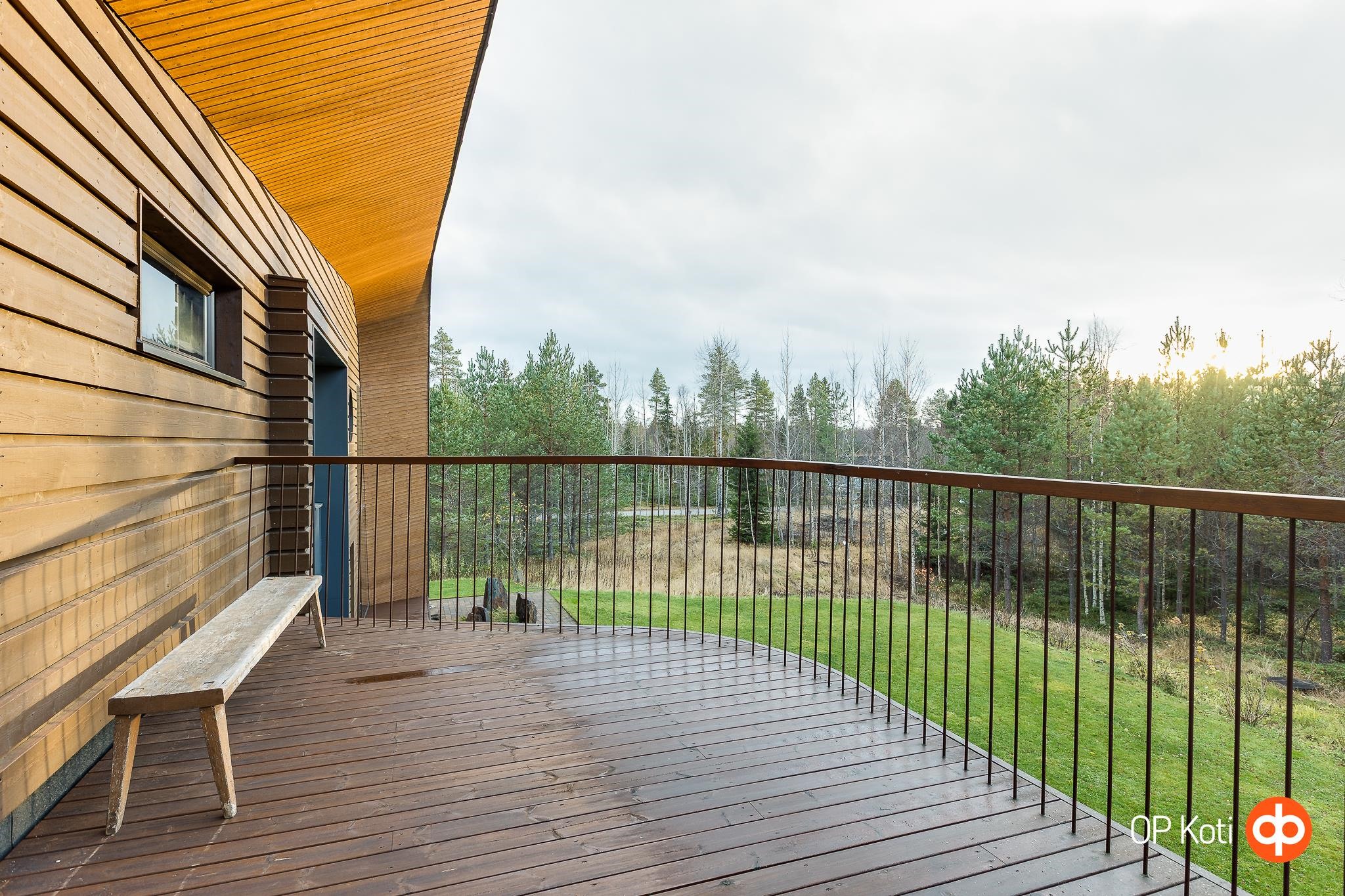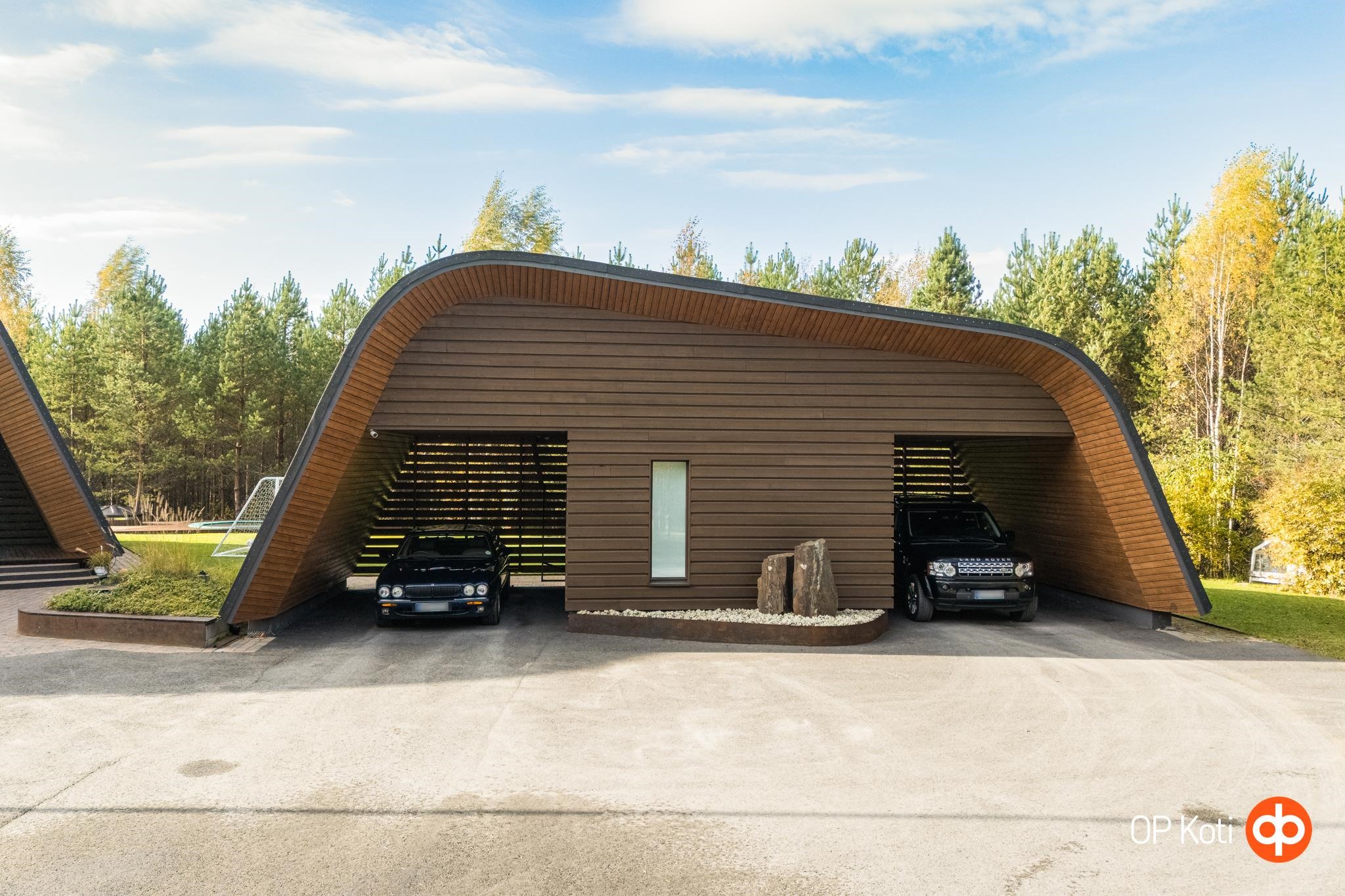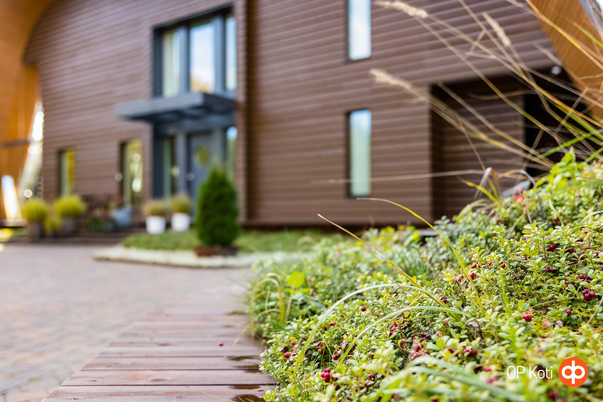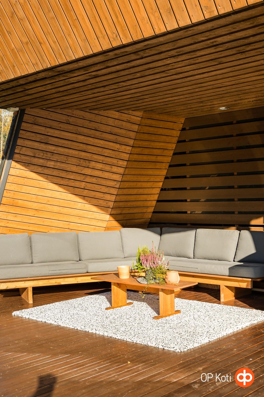 Rakennus on sijoitettu tontin korkeimmalle kohdalle kallion päälle, ja se on suunniteltu auringon kierron mukaan. Aamuaurinko valaisee keittiön, kun taas ilta-aurinko hellii parveketta ja paljuun johtavaa terassia. Helppohoitoinen pihapiiri on oma universuminsa, jossa on asfalttipiha lasten leikkeihin, maahan upotettu trampoliini, katettu grillinurkkaus ja robottiruohonleikkuri. Omenapuut ja marjapensaat tuovat satoa, ja pihametsikkö antaa suojaa. Autot saat suojaan kahden katoksen alle, joiden yhteydessä on lämmin varasto, työhuone ja kekseliäitä säilytysratkaisuja. Leikkimökki jatkaa talon muotokieltä ja tekee pihasta lasten seikkailupaikan.