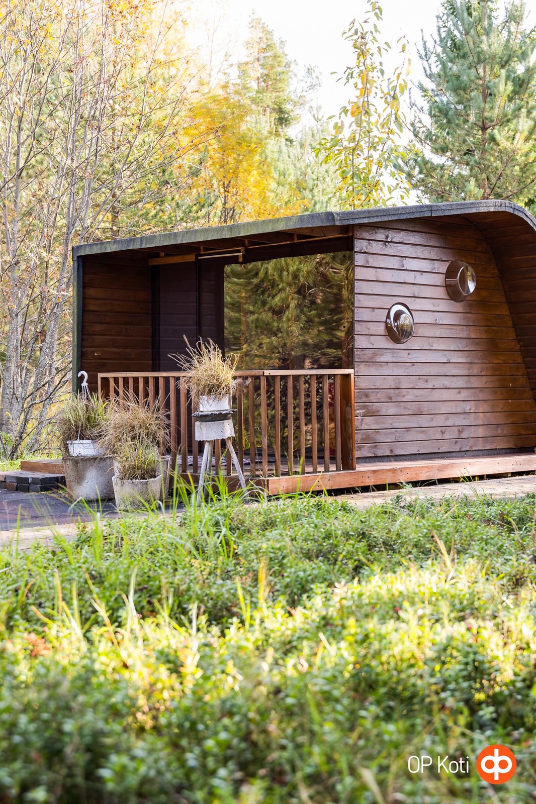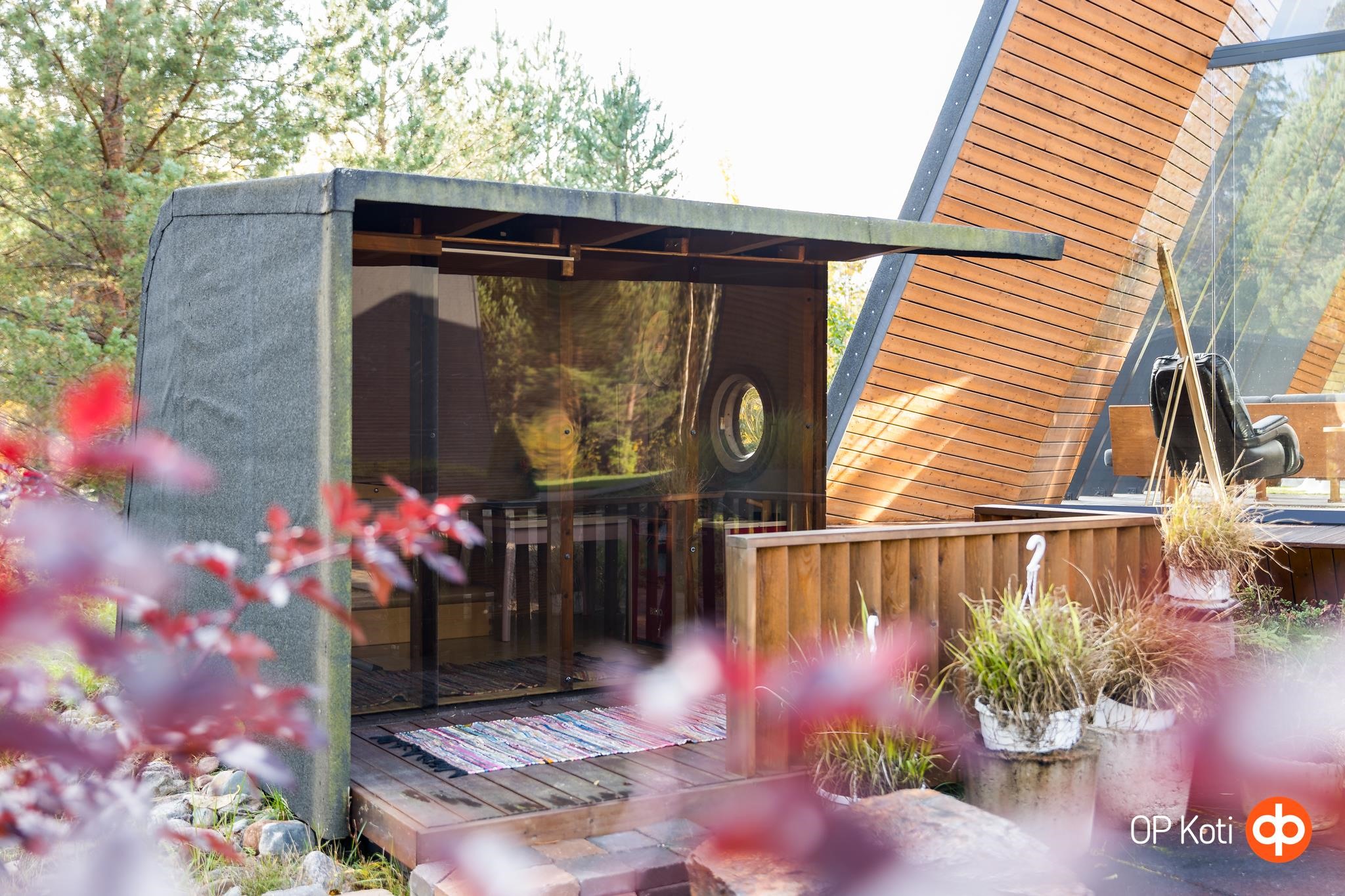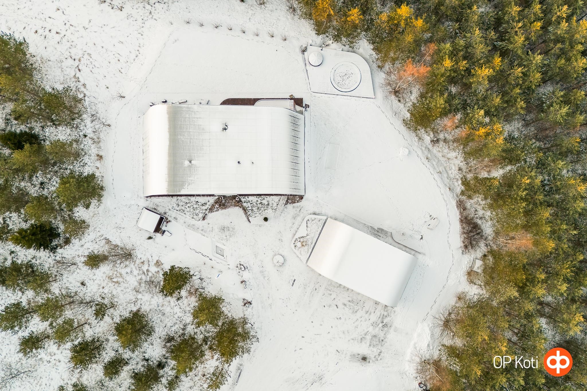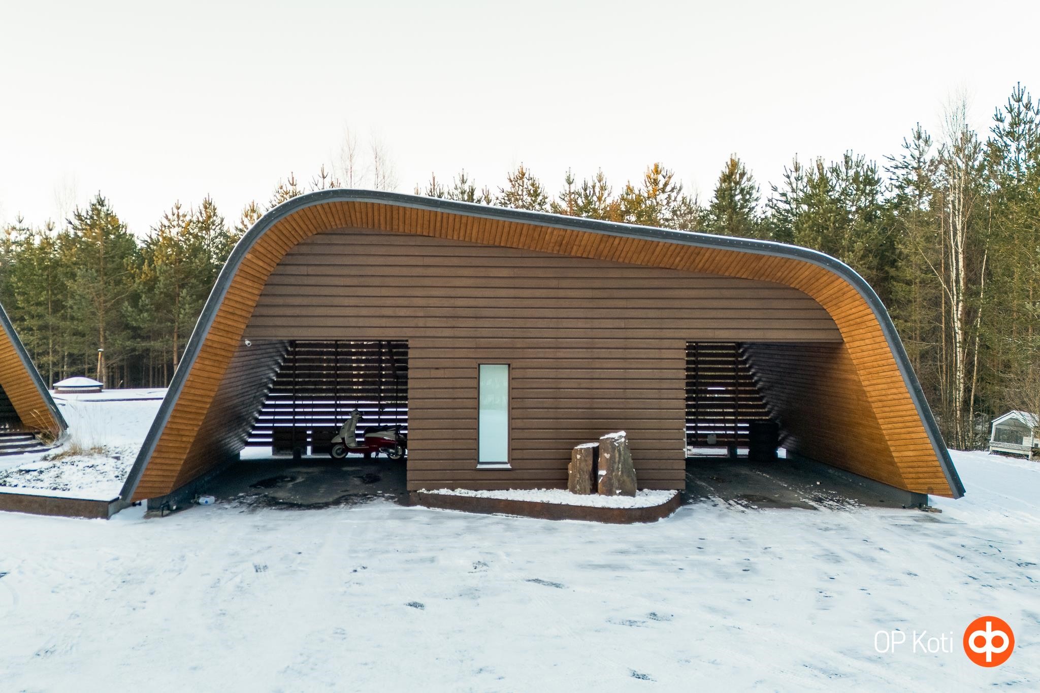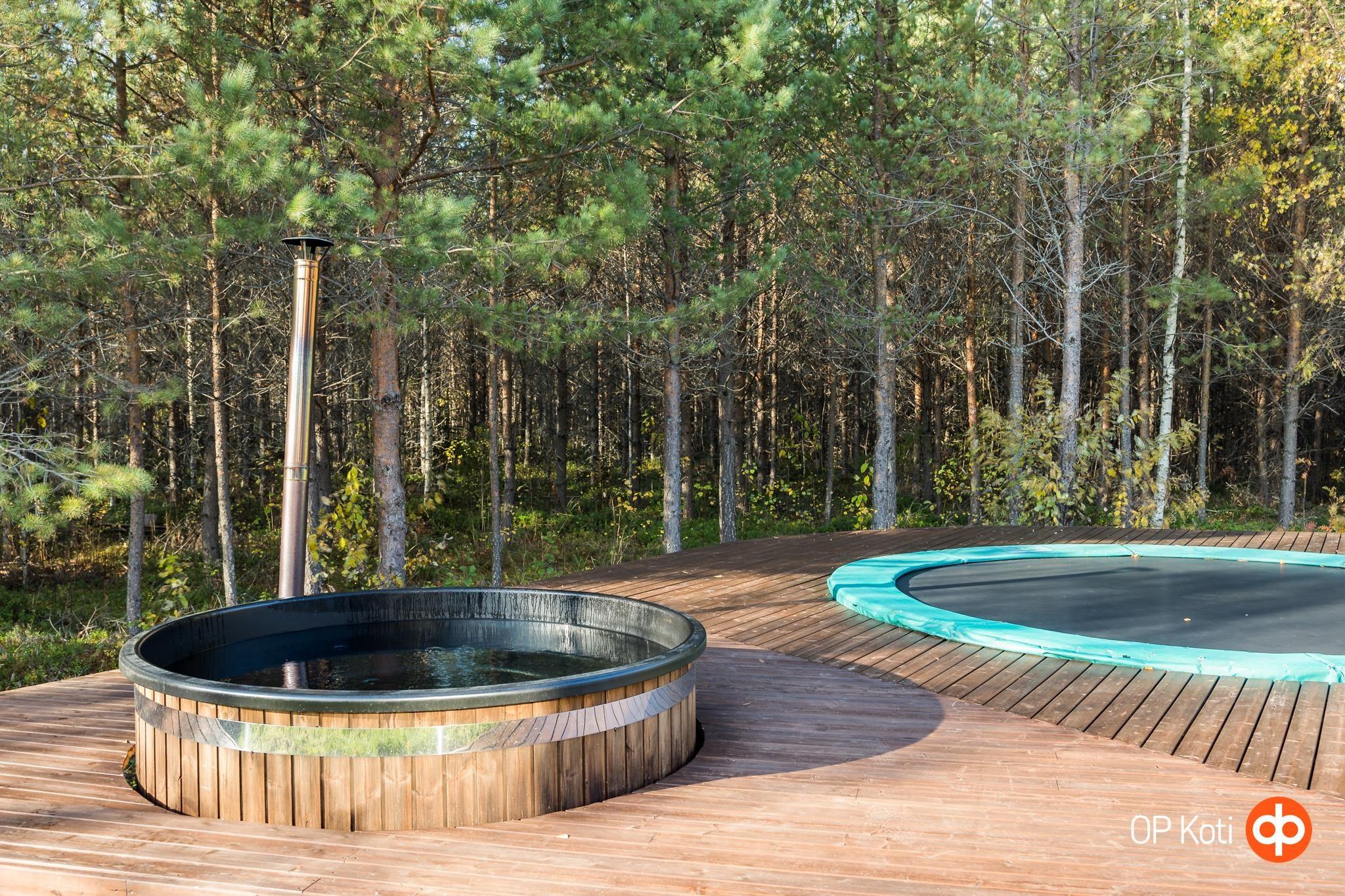 Rakennus on sijoitettu tontin korkeimmalle kohdalle kallion päälle, ja se on suunniteltu auringon kierron mukaan. Aamuaurinko valaisee keittiön, kun taas ilta-aurinko hellii parveketta ja paljuun johtavaa terassia. Helppohoitoinen pihapiiri on oma universuminsa, jossa on asfalttipiha lasten leikkeihin, maahan upotettu trampoliini, katettu grillinurkkaus ja robottiruohonleikkuri. Omenapuut ja marjapensaat tuovat satoa, ja pihametsikkö antaa suojaa. Autot saat suojaan kahden katoksen alle, joiden yhteydessä on lämmin varasto, työhuone ja kekseliäitä säilytysratkaisuja. Leikkimökki jatkaa talon muotokieltä ja tekee pihasta lasten seikkailupaikan.