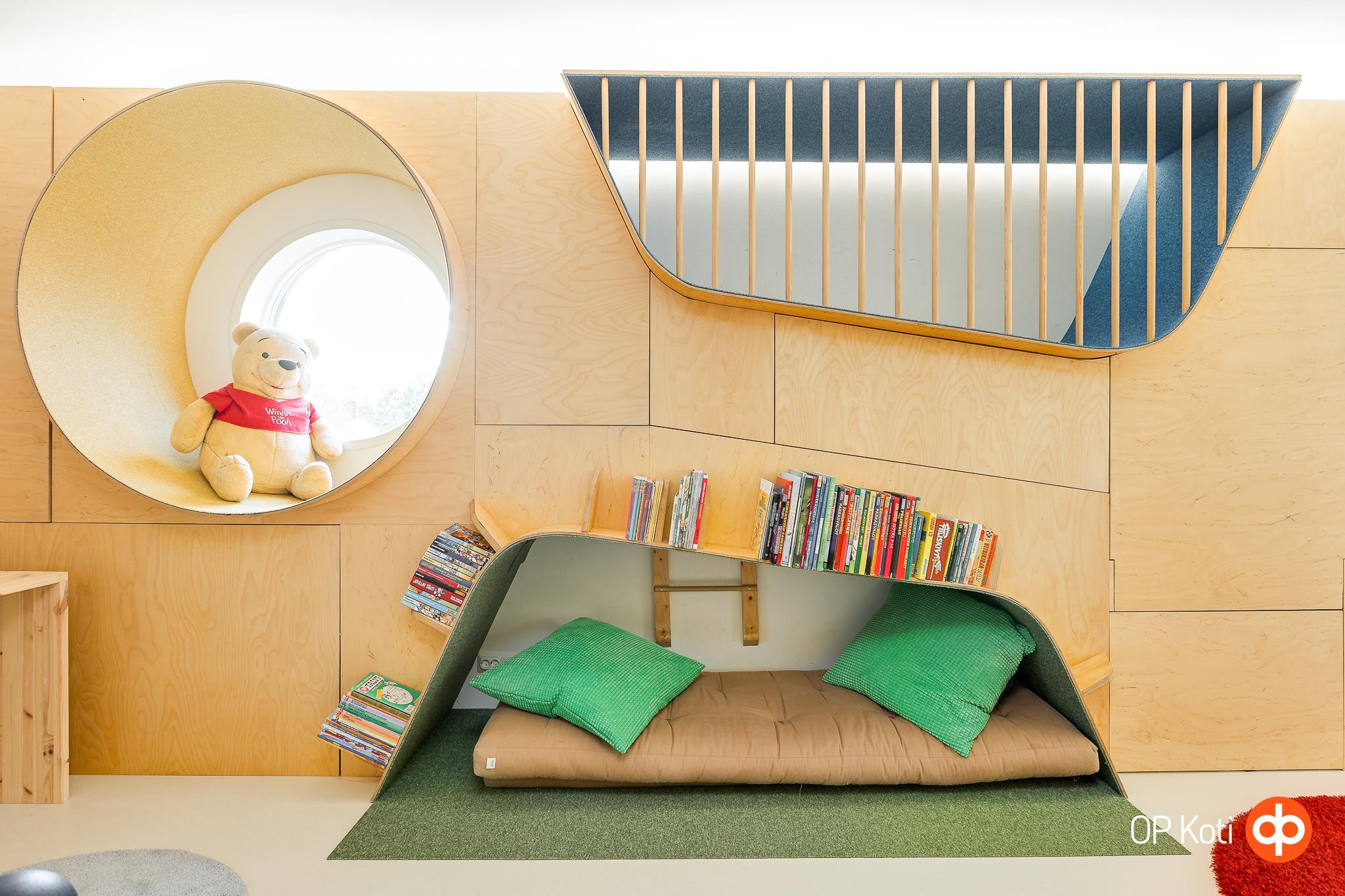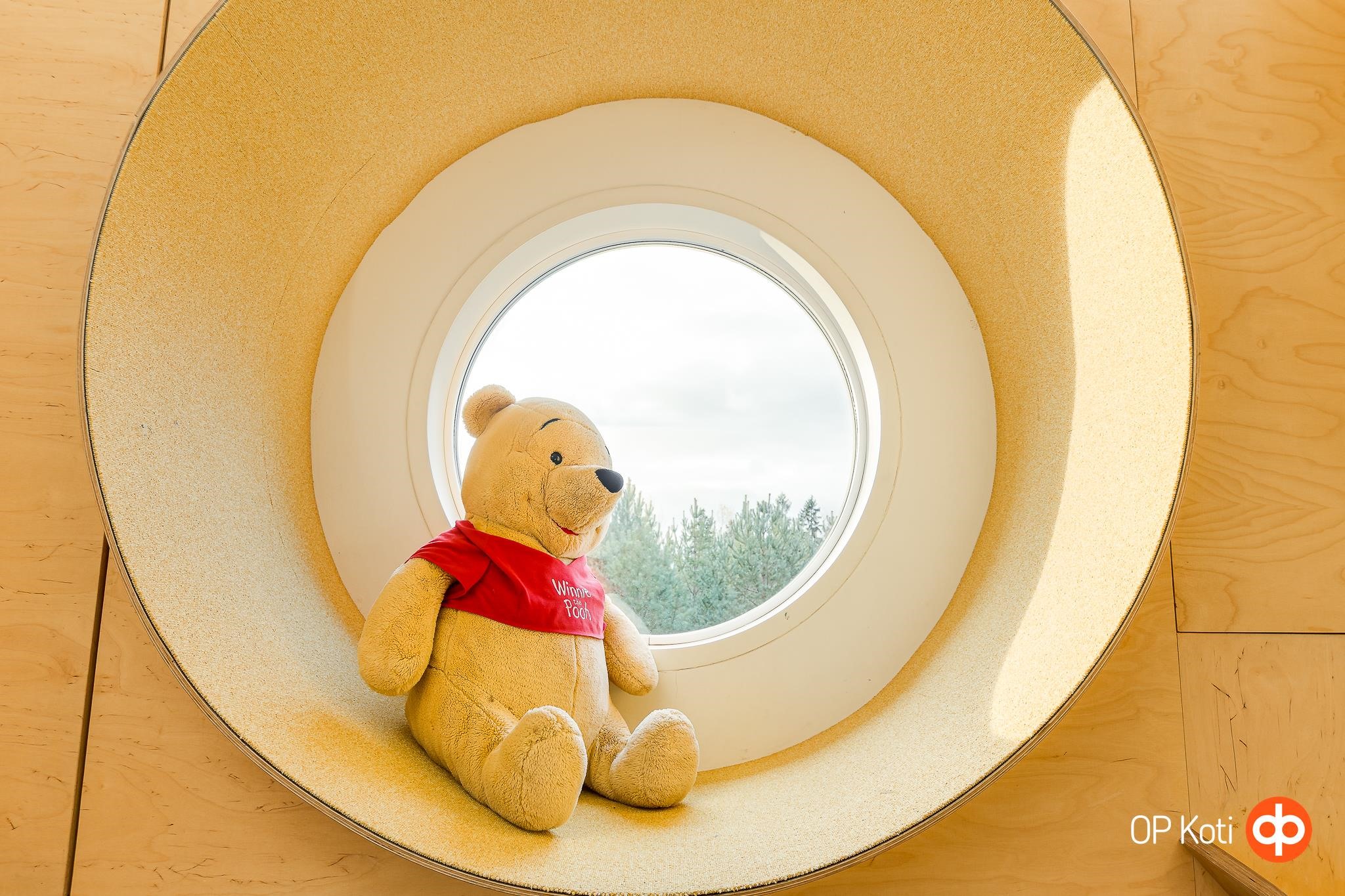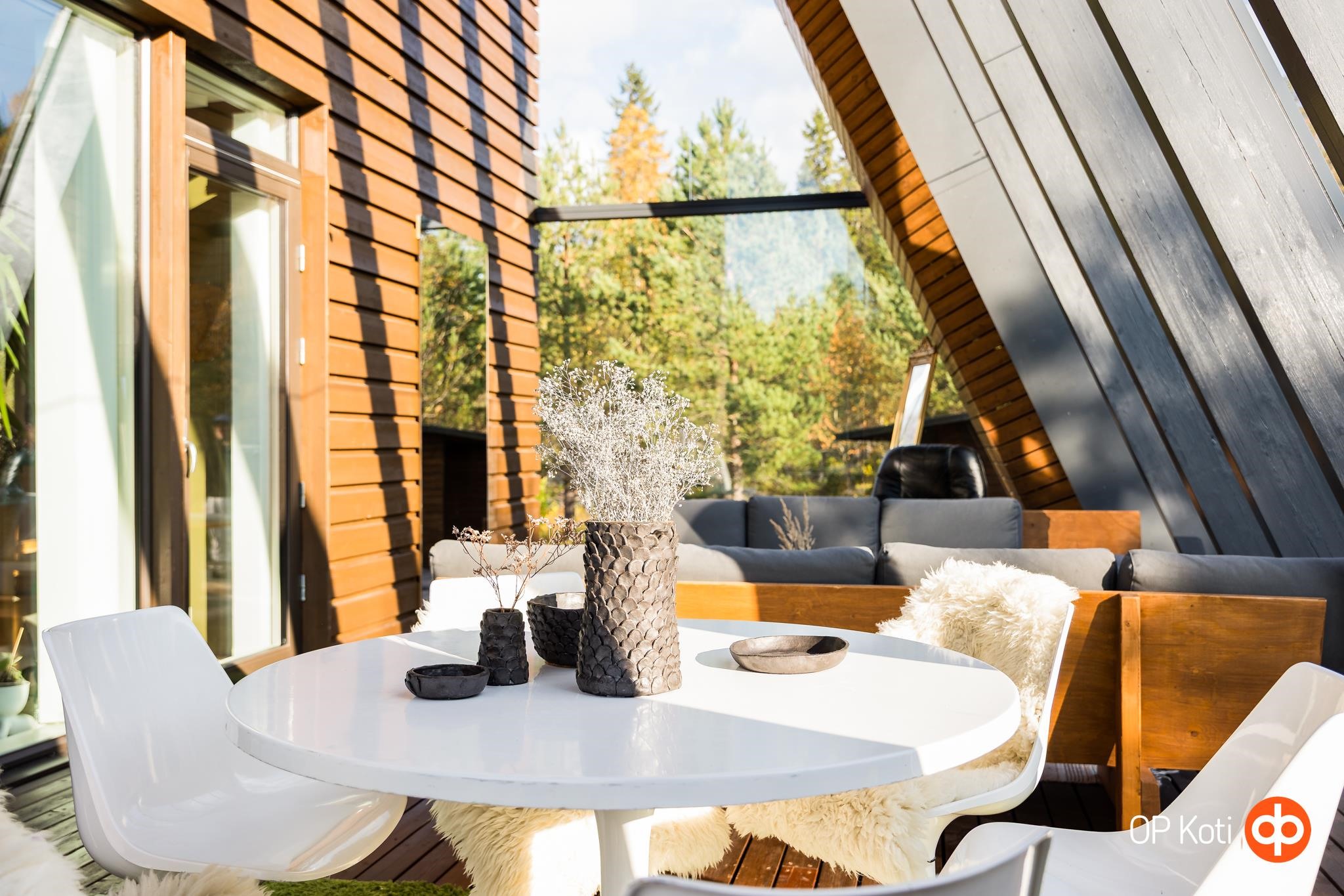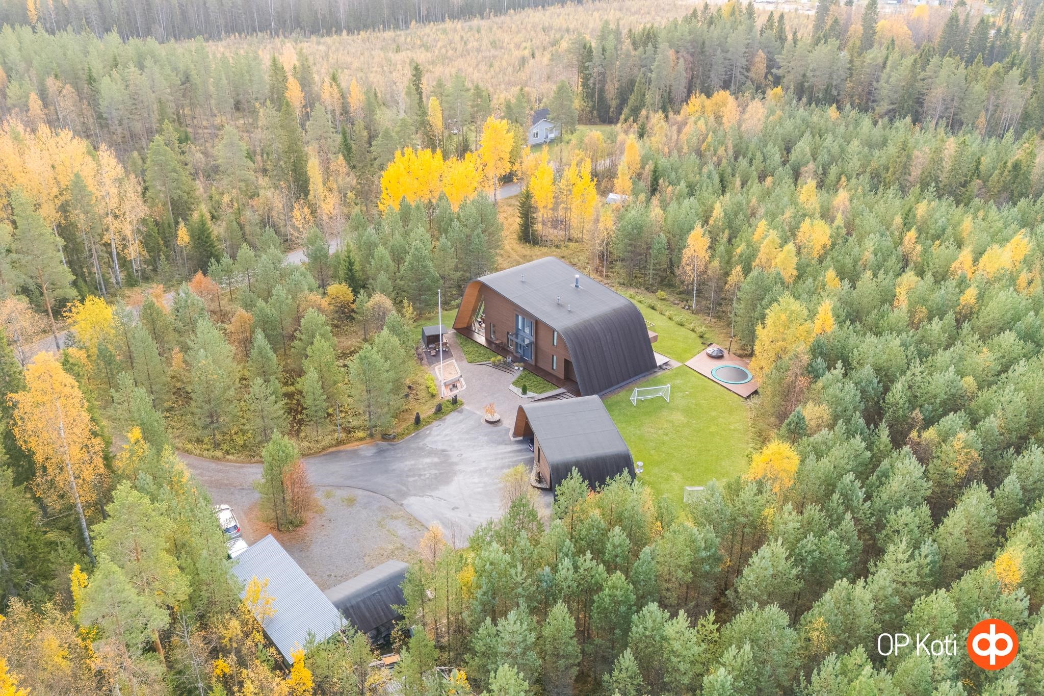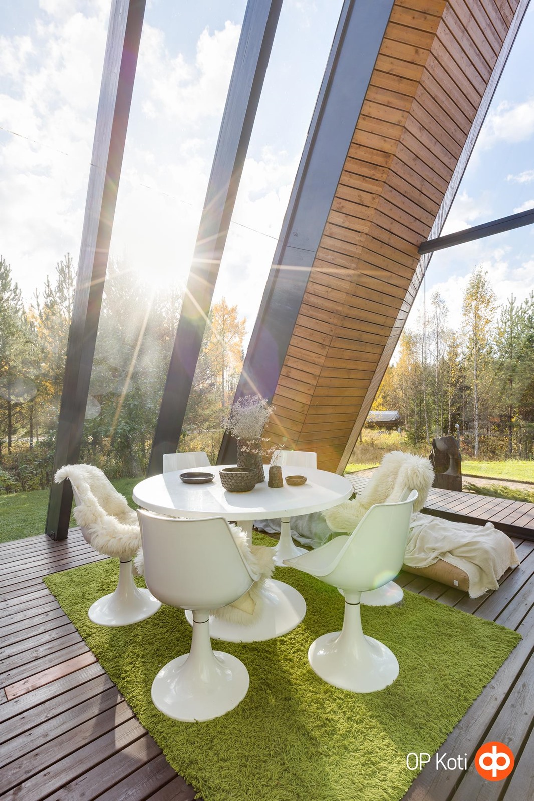 Rakennus on sijoitettu tontin korkeimmalle kohdalle kallion päälle, ja se on suunniteltu auringon kierron mukaan. Aamuaurinko valaisee keittiön, kun taas ilta-aurinko hellii parveketta ja paljuun johtavaa terassia. Helppohoitoinen pihapiiri on oma universuminsa, jossa on asfalttipiha lasten leikkeihin, maahan upotettu trampoliini, katettu grillinurkkaus ja robottiruohonleikkuri. Omenapuut ja marjapensaat tuovat satoa, ja pihametsikkö antaa suojaa. Autot saat suojaan kahden katoksen alle, joiden yhteydessä on lämmin varasto, työhuone ja kekseliäitä säilytysratkaisuja. Leikkimökki jatkaa talon muotokieltä ja tekee pihasta lasten seikkailupaikan.