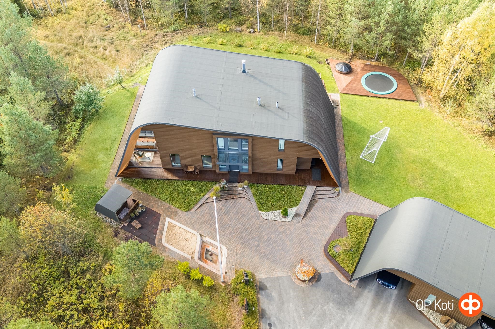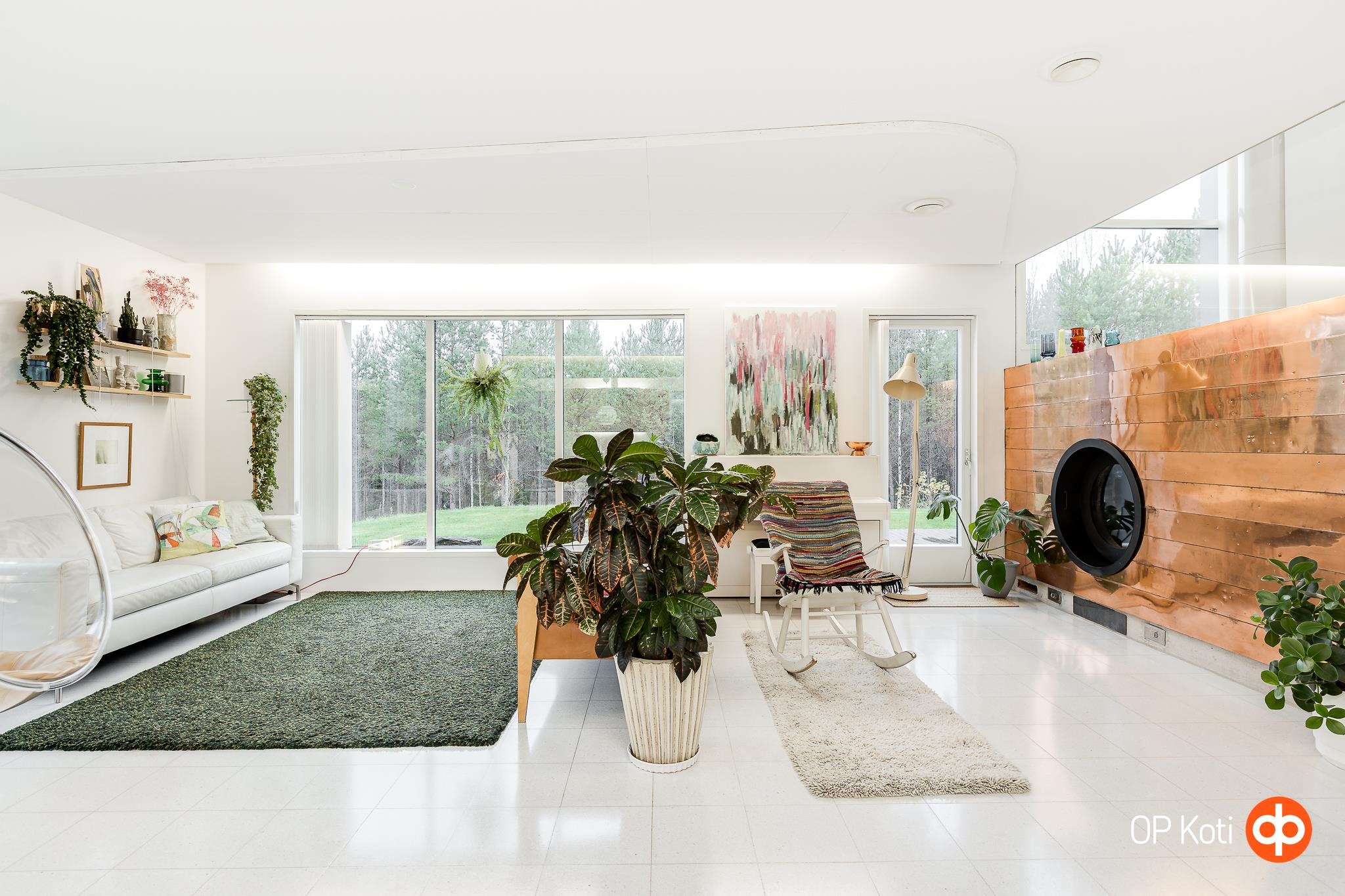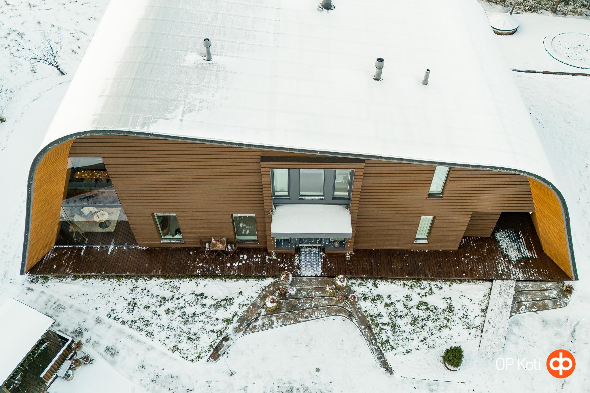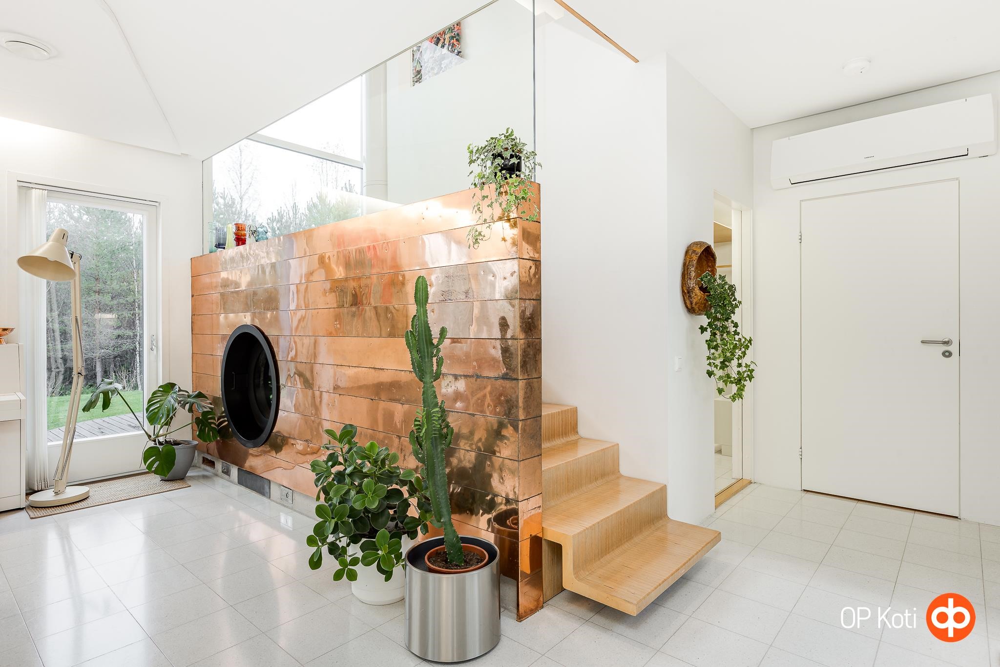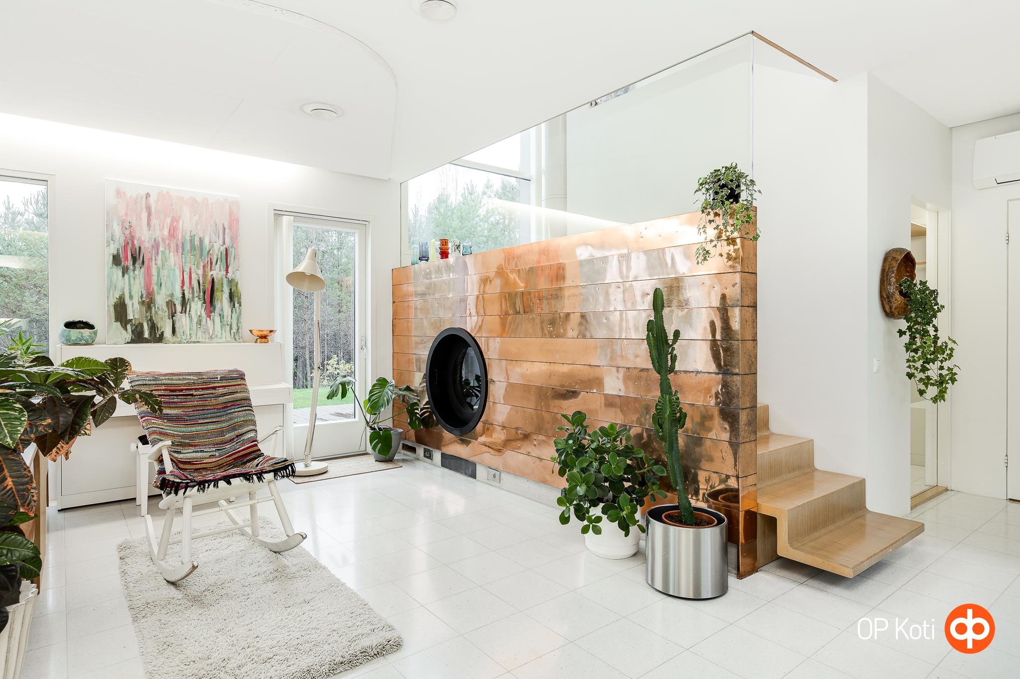 Kahteen kerrokseen sijoittuvat asuintilat ovat syntyneet rakkaudesta muotoiluun ja toimivuuteen. Kaareva katto, näyttävä kupariseinä ja yli 100 m² osin lasitettu terassi tekevät kodista arkkitehtonisen elämyksen. Puusepän valmistama massiivipuukeittiö valkobetonitasoineen on kuin veistos. Portaikko ja varaava takka yhdistävät insinööritarkkuuden ja taiteen.