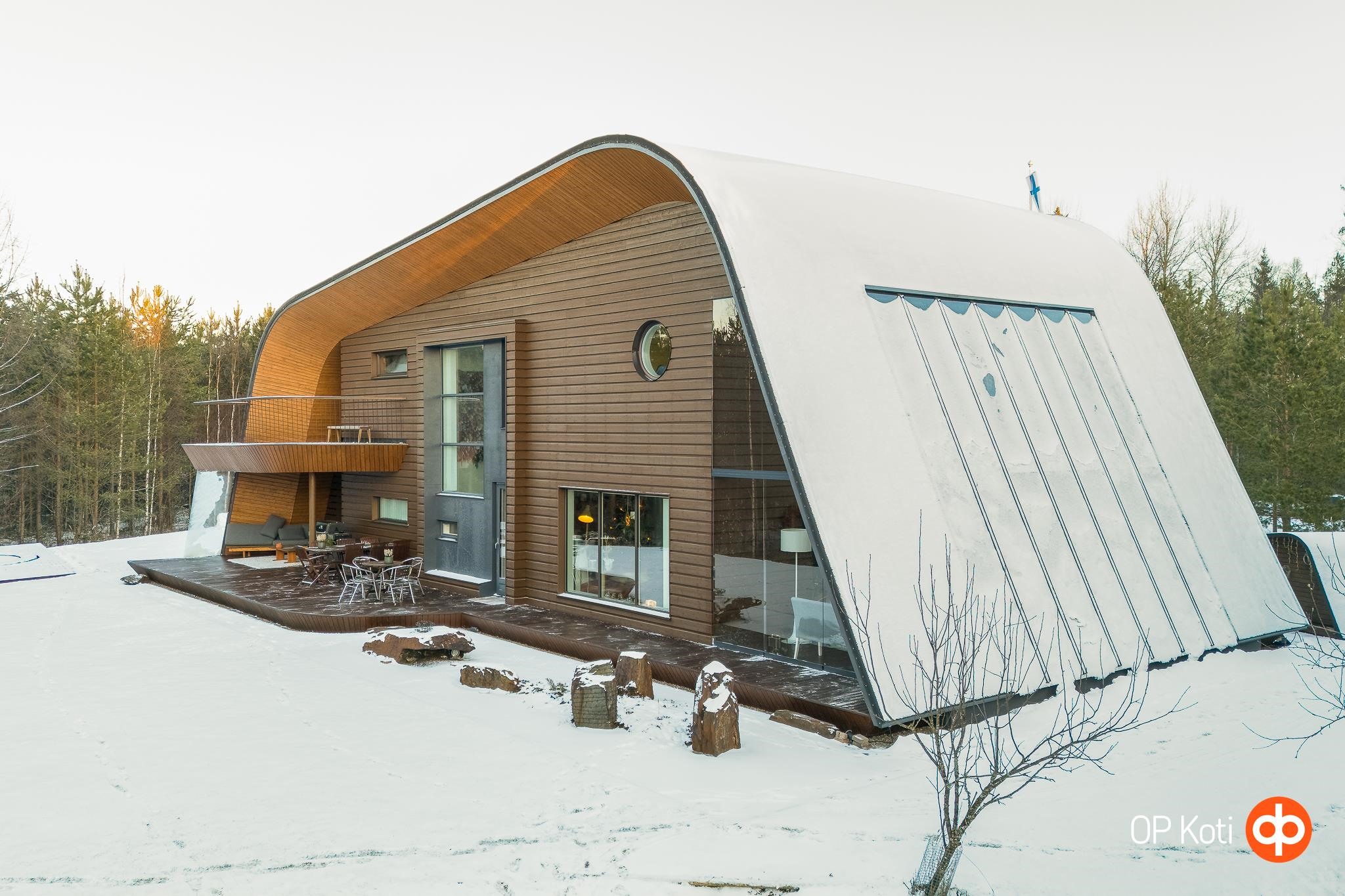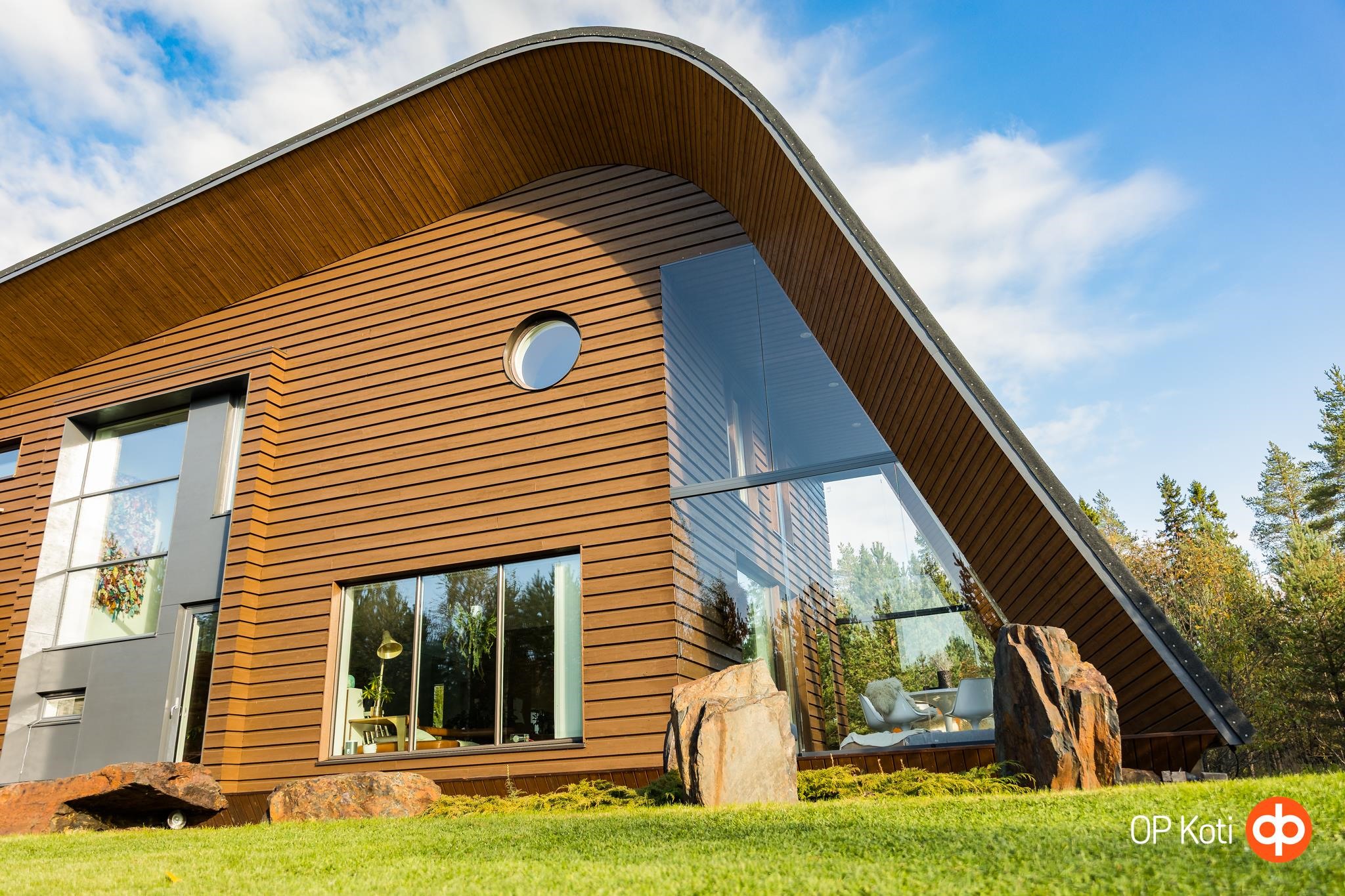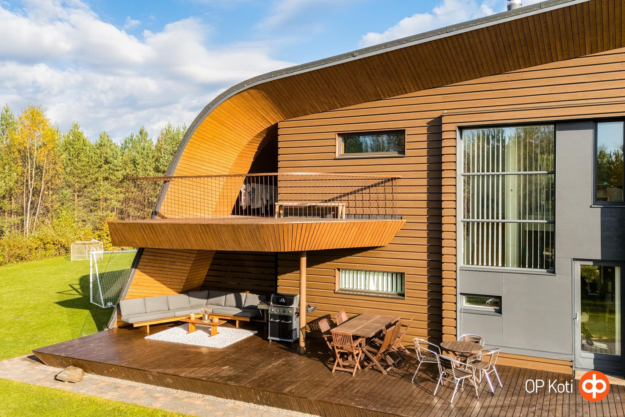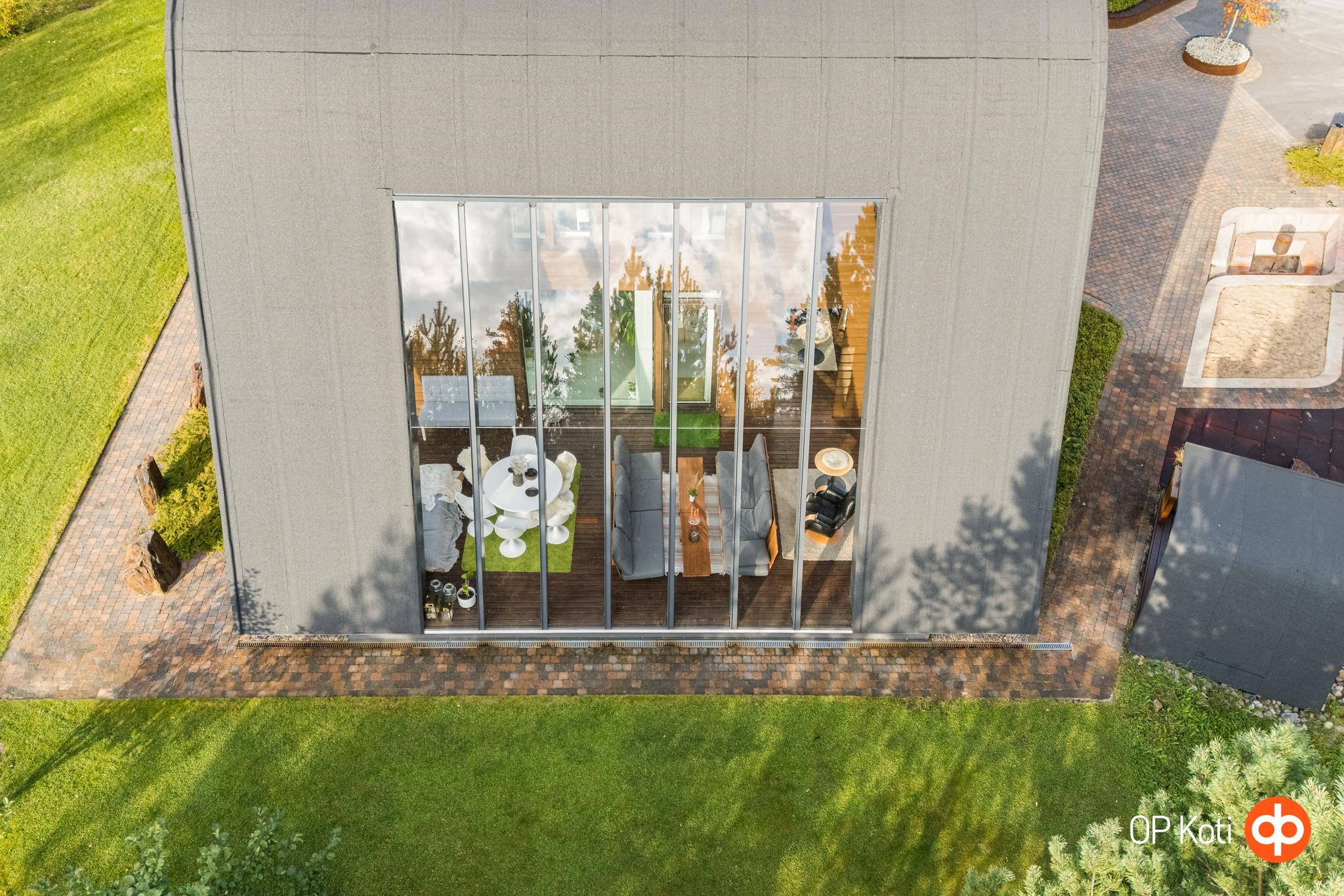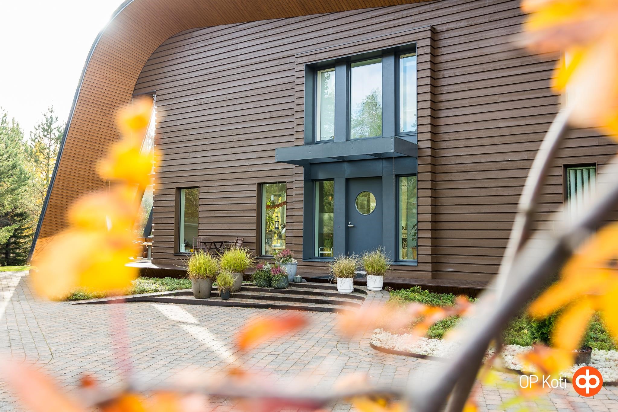 Kahteen kerrokseen sijoittuvat asuintilat ovat syntyneet rakkaudesta muotoiluun ja toimivuuteen. Kaareva katto, näyttävä kupariseinä ja yli 100 m² osin lasitettu terassi tekevät kodista arkkitehtonisen elämyksen. Puusepän valmistama massiivipuukeittiö valkobetonitasoineen on kuin veistos. Portaikko ja varaava takka yhdistävät insinööritarkkuuden ja taiteen.