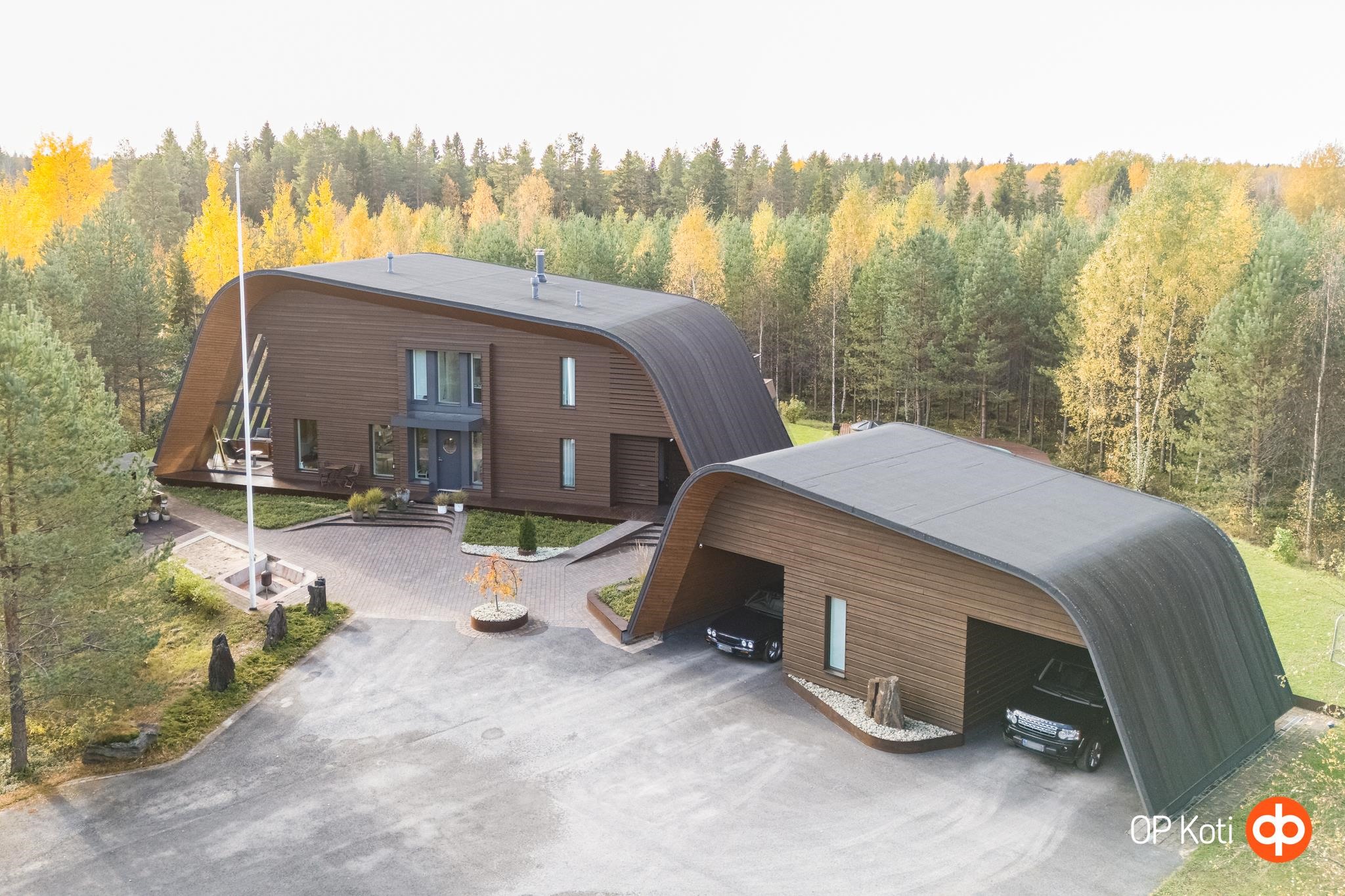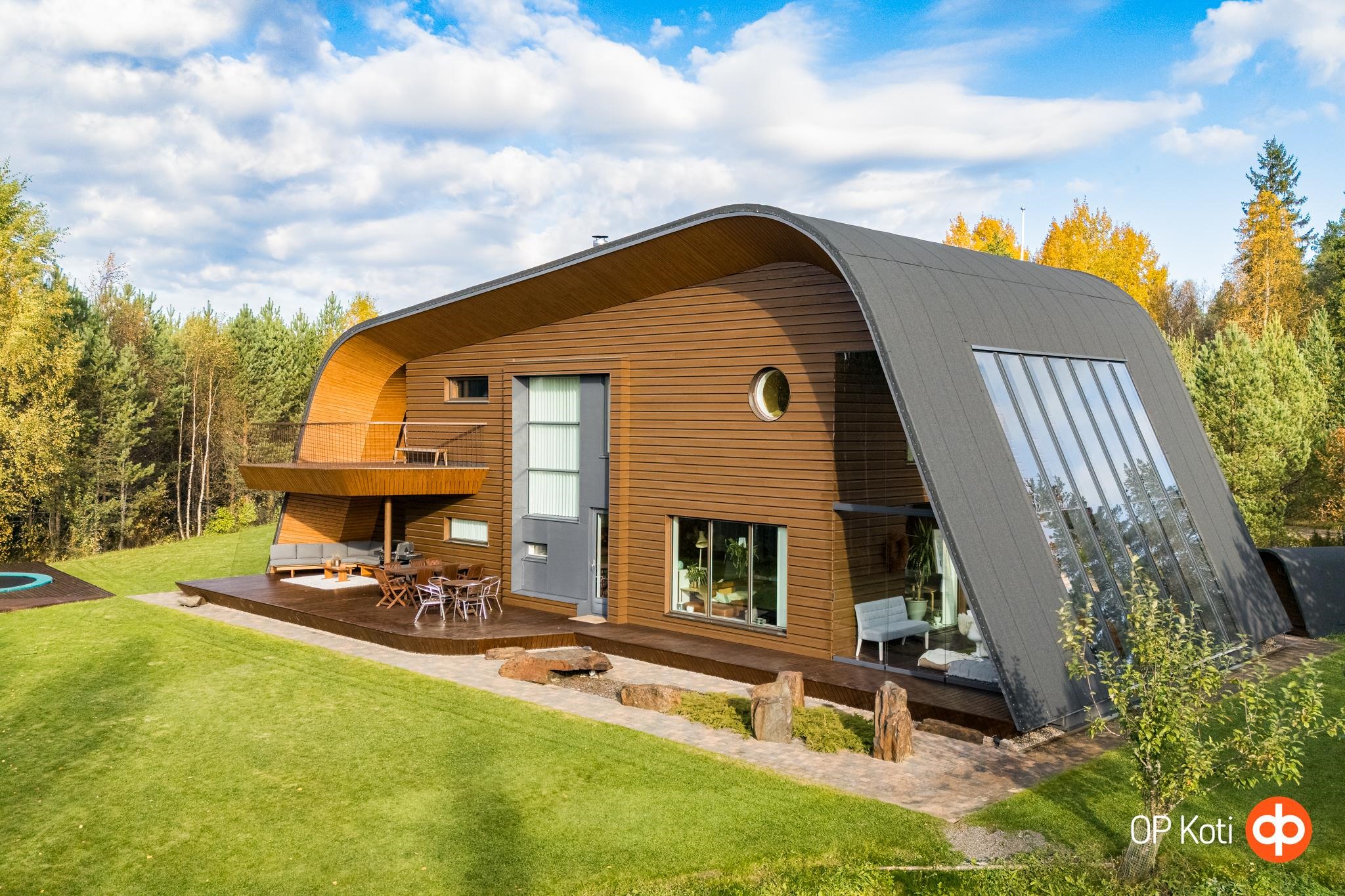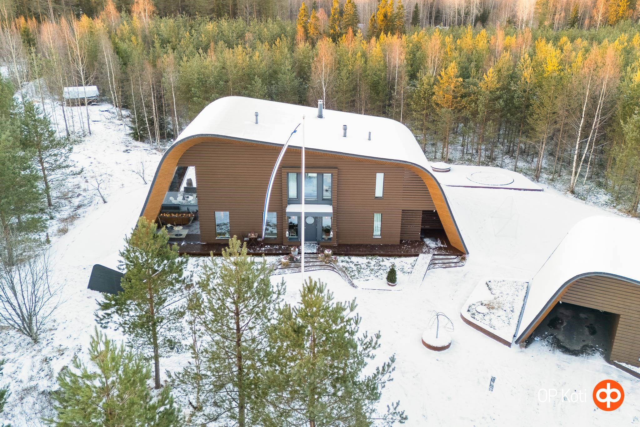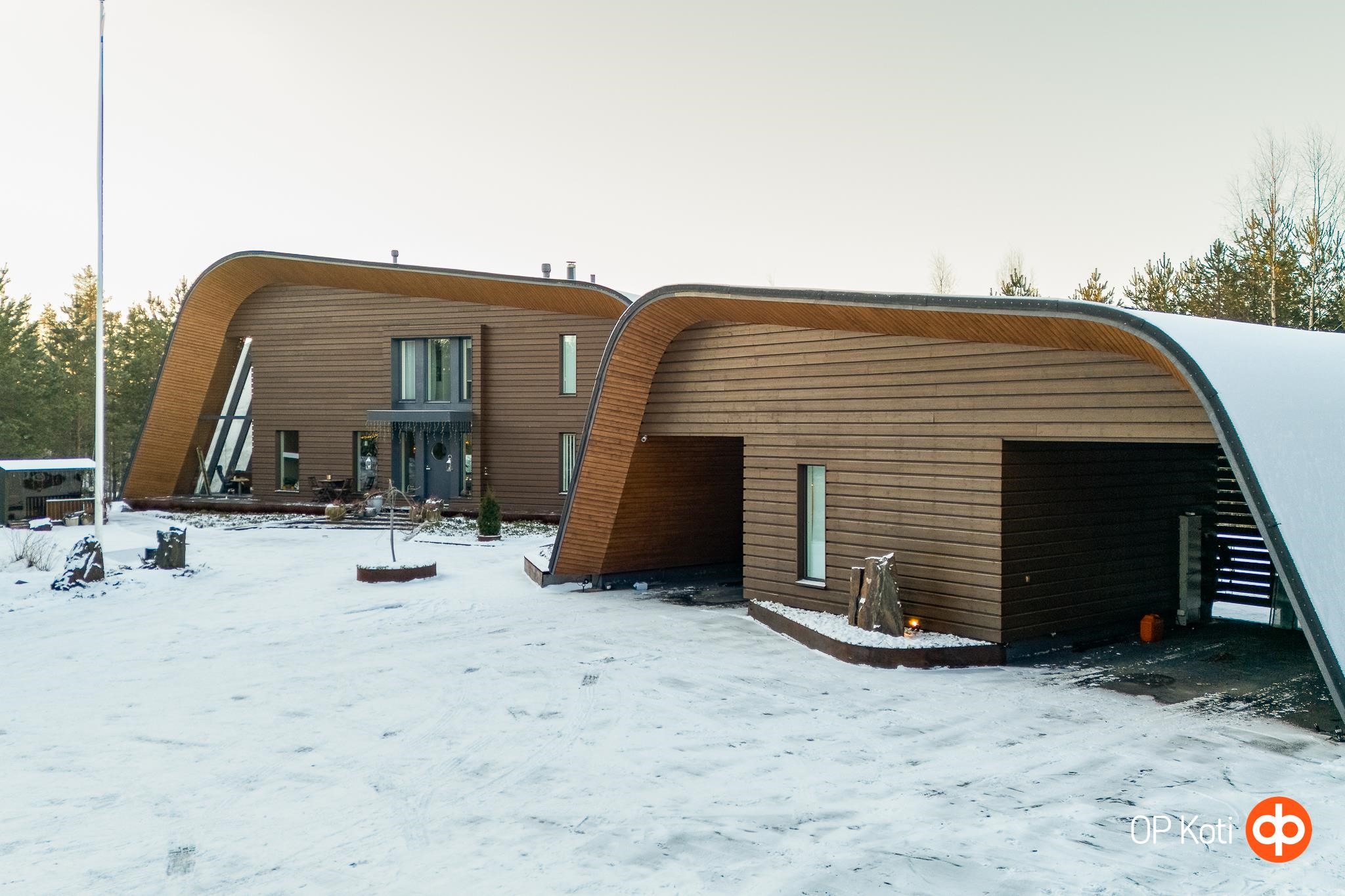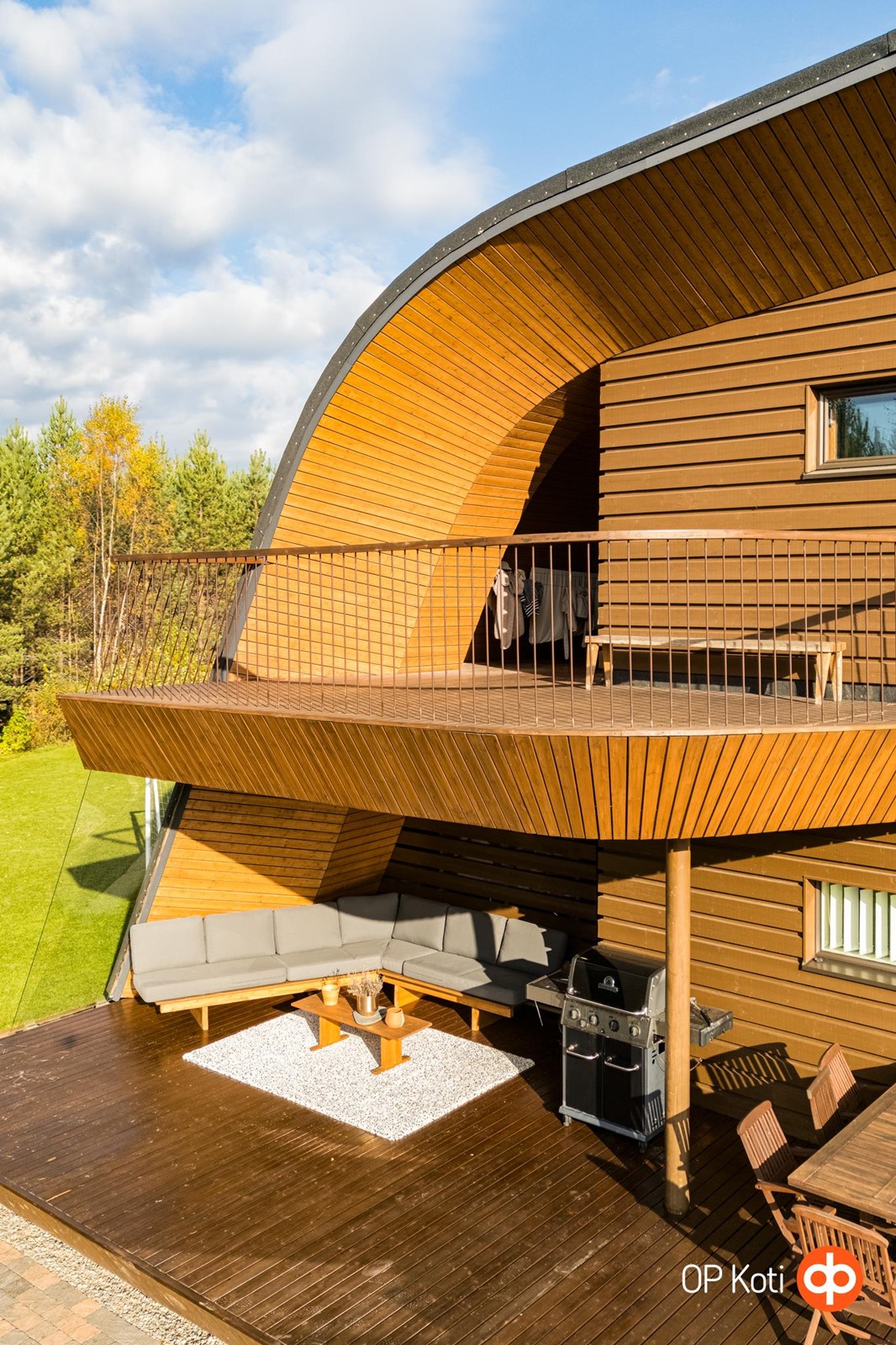 Kahteen kerrokseen sijoittuvat asuintilat ovat syntyneet rakkaudesta muotoiluun ja toimivuuteen. Kaareva katto, näyttävä kupariseinä ja yli 100 m² osin lasitettu terassi tekevät kodista arkkitehtonisen elämyksen. Puusepän valmistama massiivipuukeittiö valkobetonitasoineen on kuin veistos. Portaikko ja varaava takka yhdistävät insinööritarkkuuden ja taiteen.