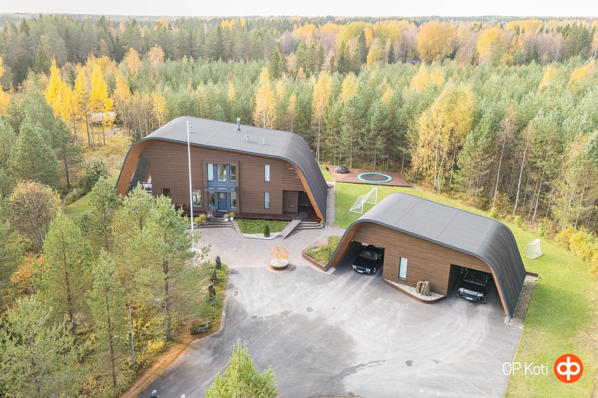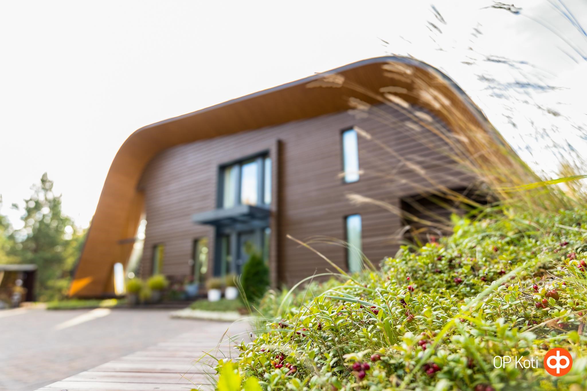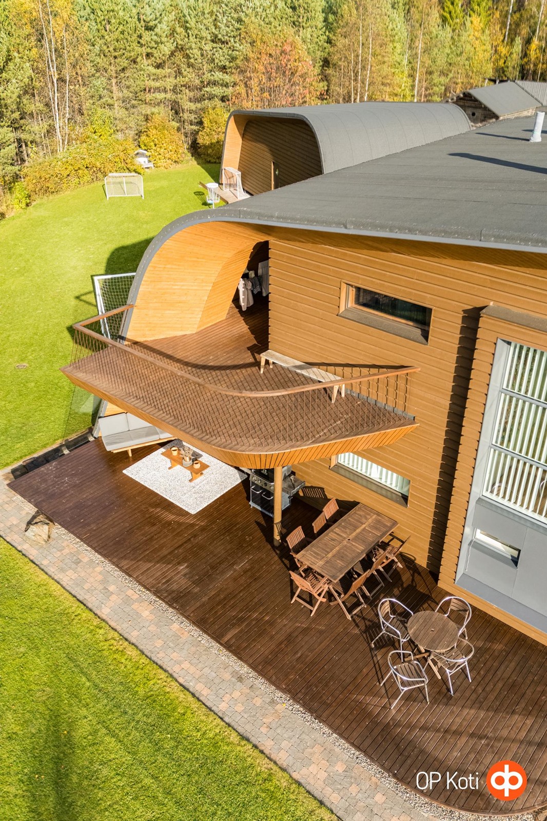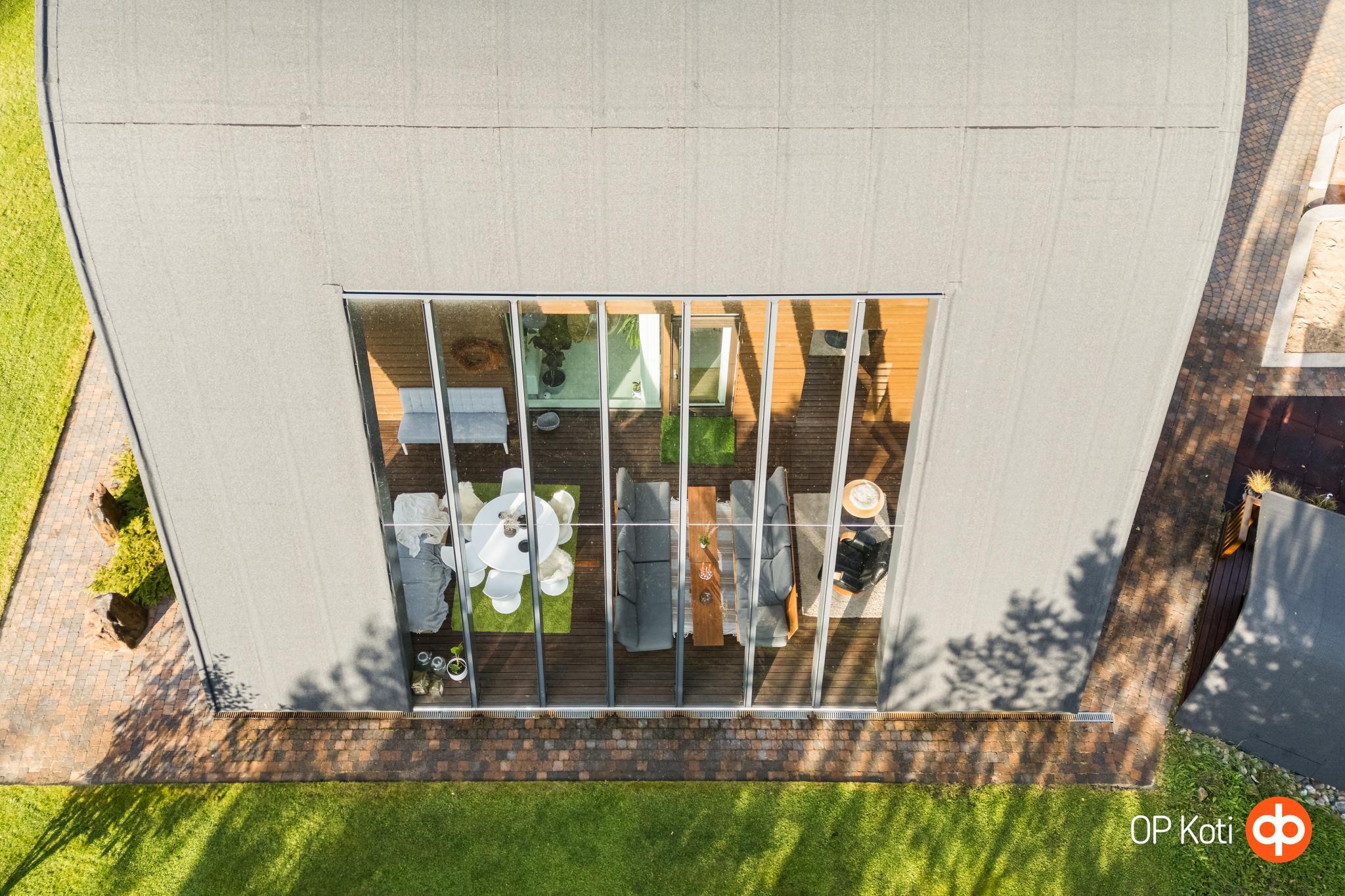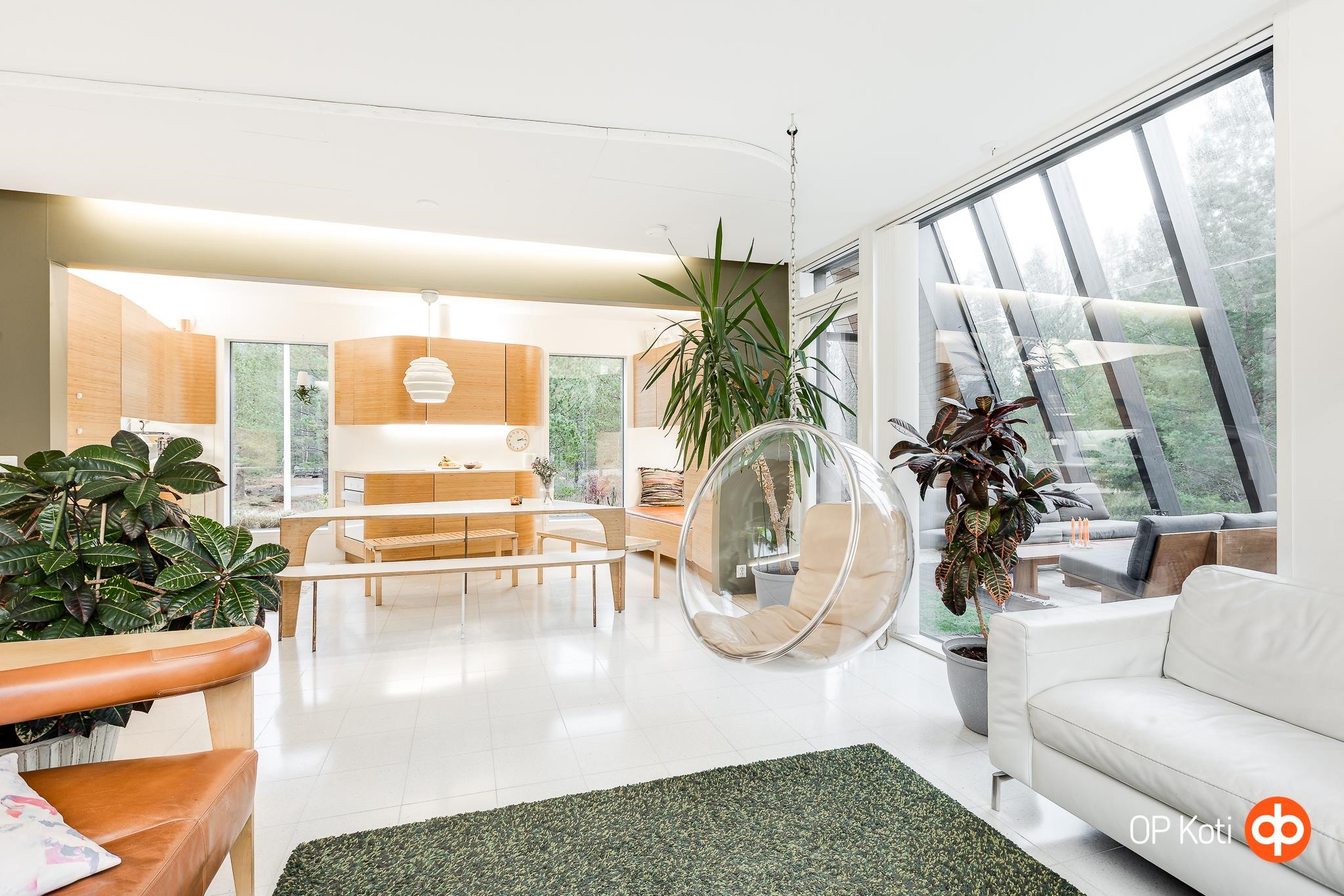 Kahteen kerrokseen sijoittuvat asuintilat ovat syntyneet rakkaudesta muotoiluun ja toimivuuteen. Kaareva katto, näyttävä kupariseinä ja yli 100 m² osin lasitettu terassi tekevät kodista arkkitehtonisen elämyksen. Puusepän valmistama massiivipuukeittiö valkobetonitasoineen on kuin veistos. Portaikko ja varaava takka yhdistävät insinööritarkkuuden ja taiteen.
