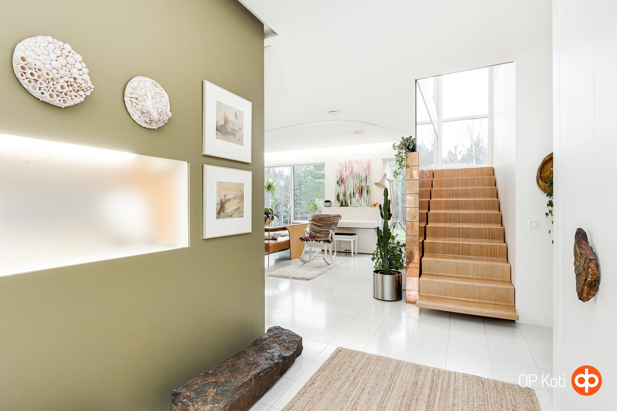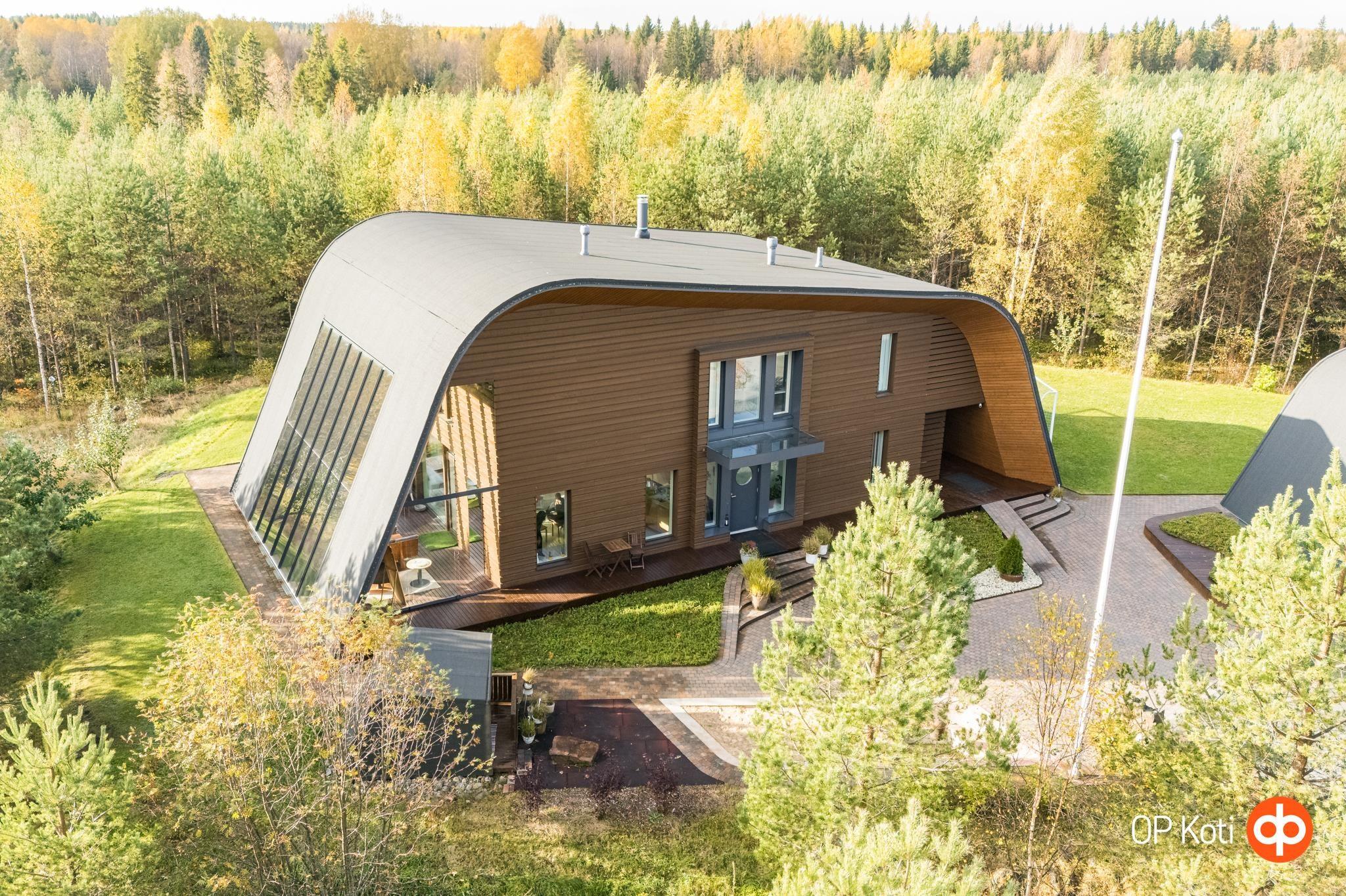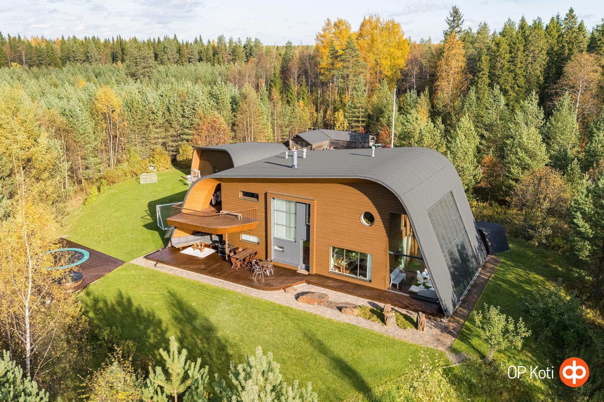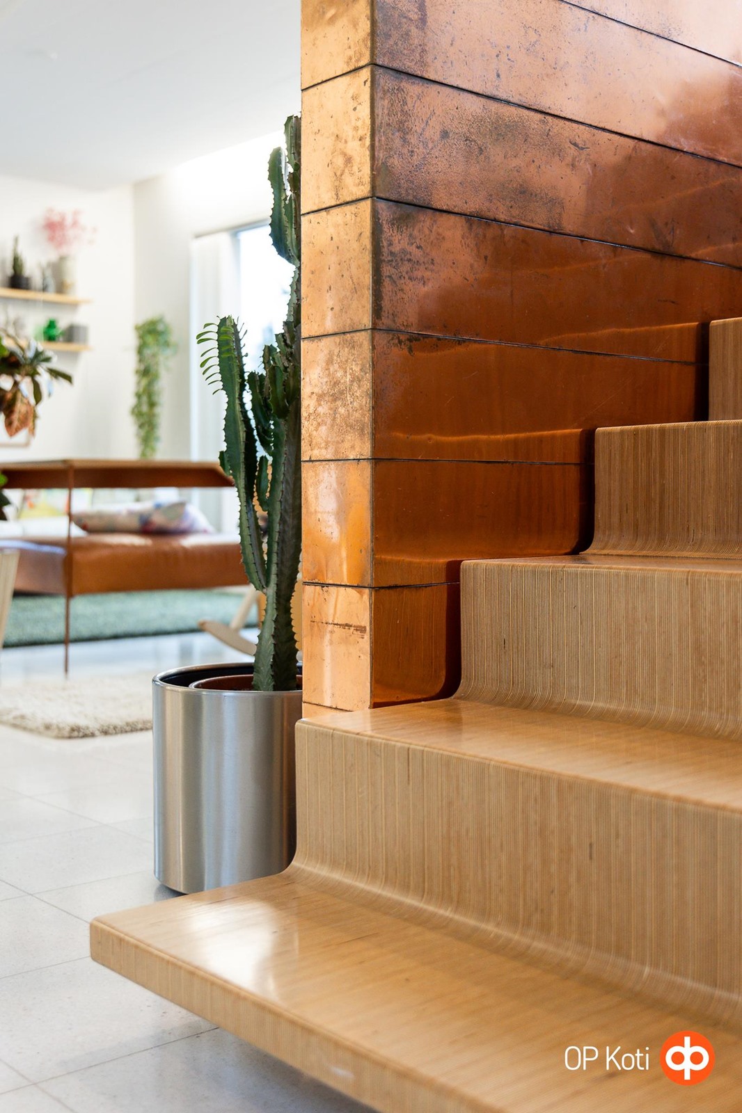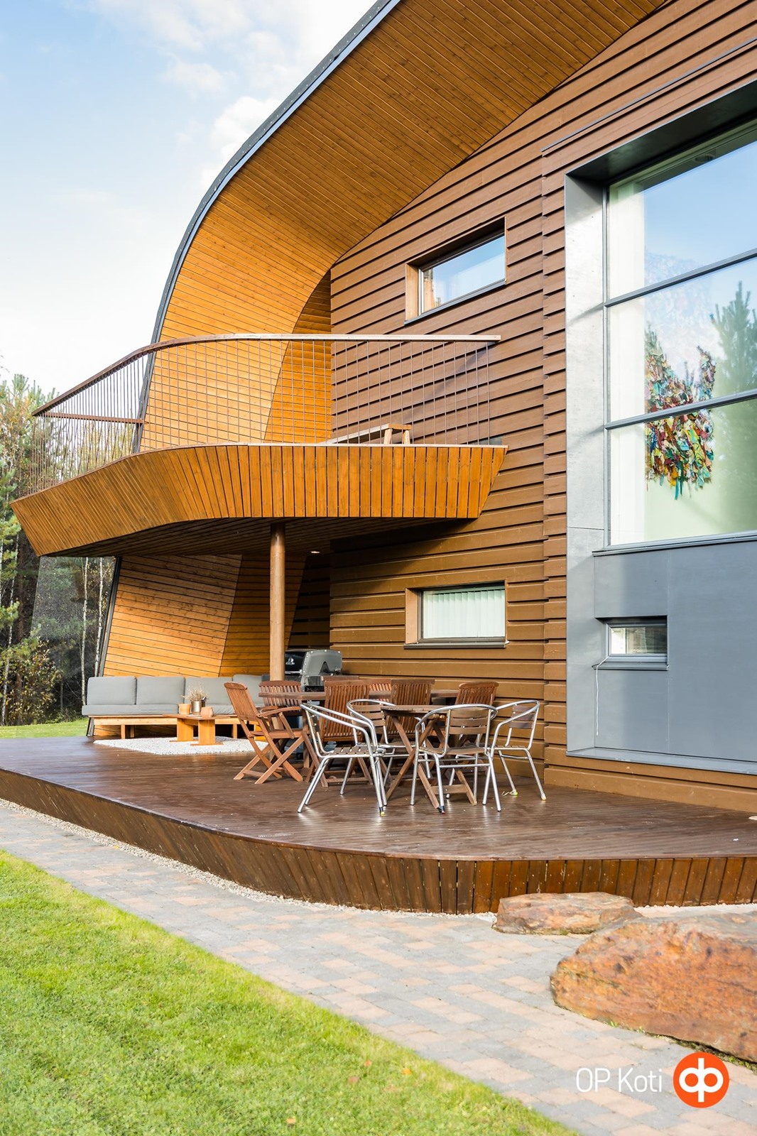 Kahteen kerrokseen sijoittuvat asuintilat ovat syntyneet rakkaudesta muotoiluun ja toimivuuteen. Kaareva katto, näyttävä kupariseinä ja yli 100 m² osin lasitettu terassi tekevät kodista arkkitehtonisen elämyksen. Puusepän valmistama massiivipuukeittiö valkobetonitasoineen on kuin veistos. Portaikko ja varaava takka yhdistävät insinööritarkkuuden ja taiteen.