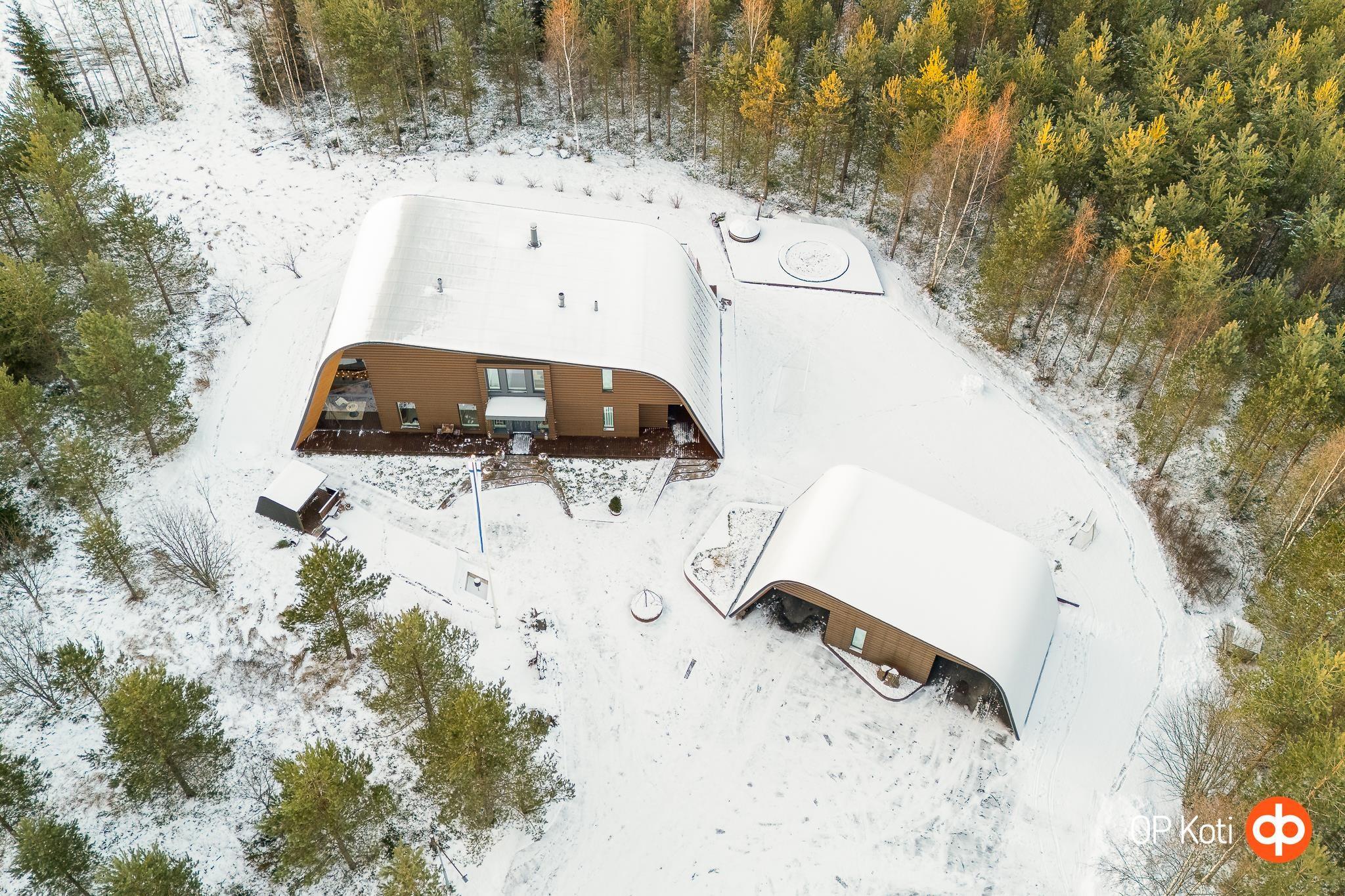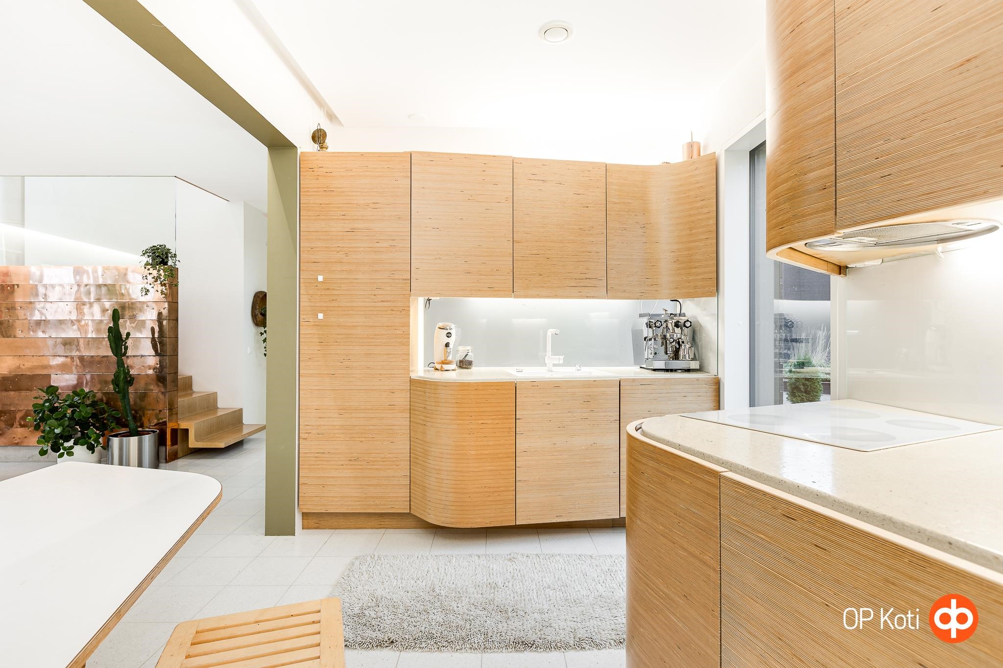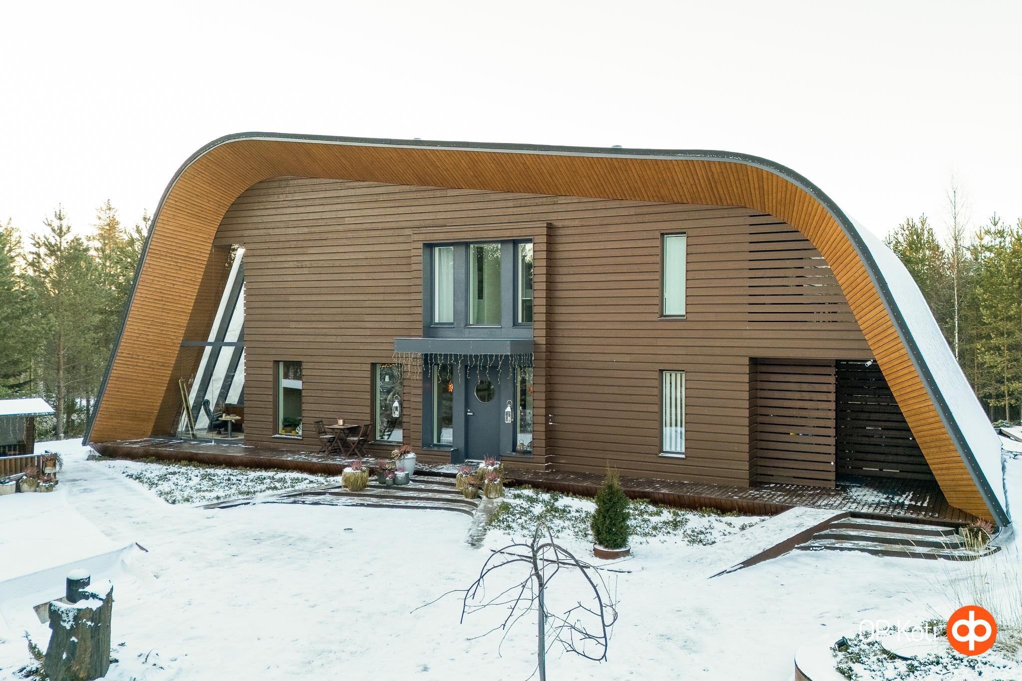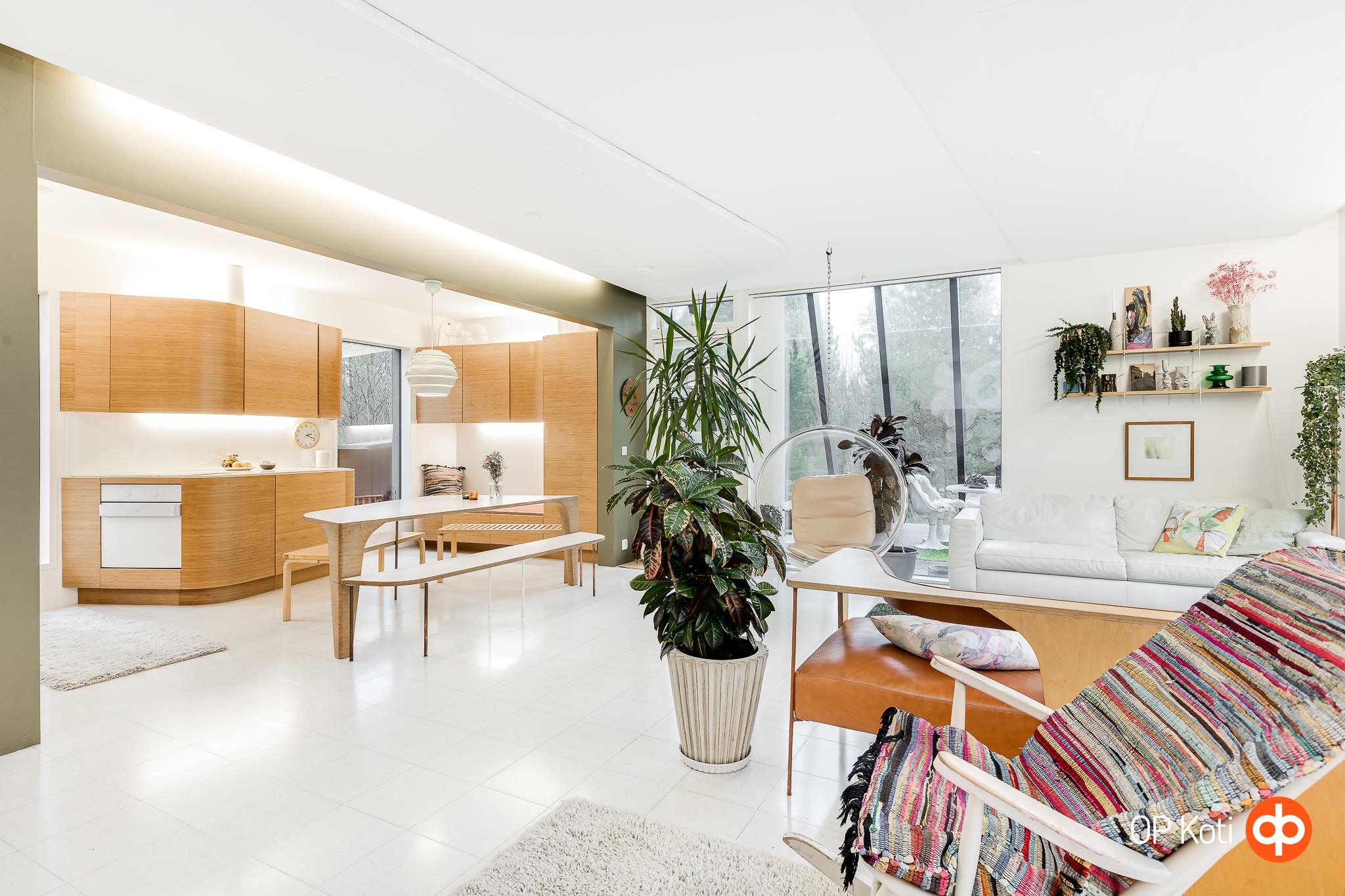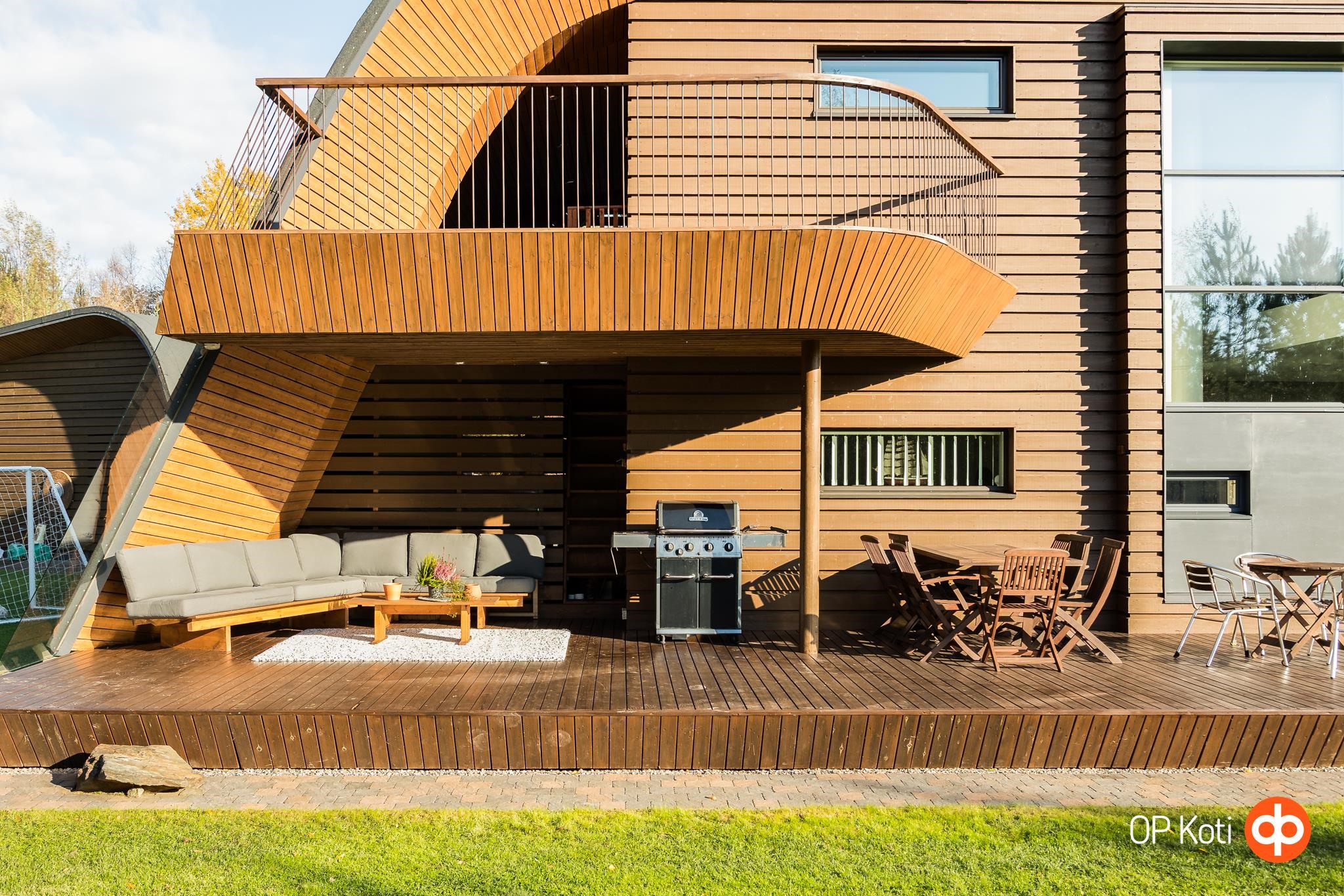 Kahteen kerrokseen sijoittuvat asuintilat ovat syntyneet rakkaudesta muotoiluun ja toimivuuteen. Kaareva katto, näyttävä kupariseinä ja yli 100 m² osin lasitettu terassi tekevät kodista arkkitehtonisen elämyksen. Puusepän valmistama massiivipuukeittiö valkobetonitasoineen on kuin veistos. Portaikko ja varaava takka yhdistävät insinööritarkkuuden ja taiteen.