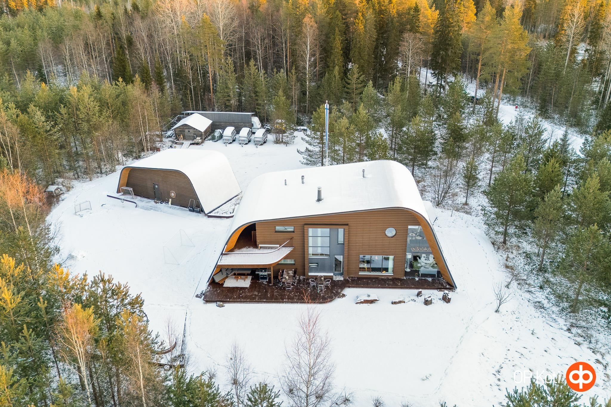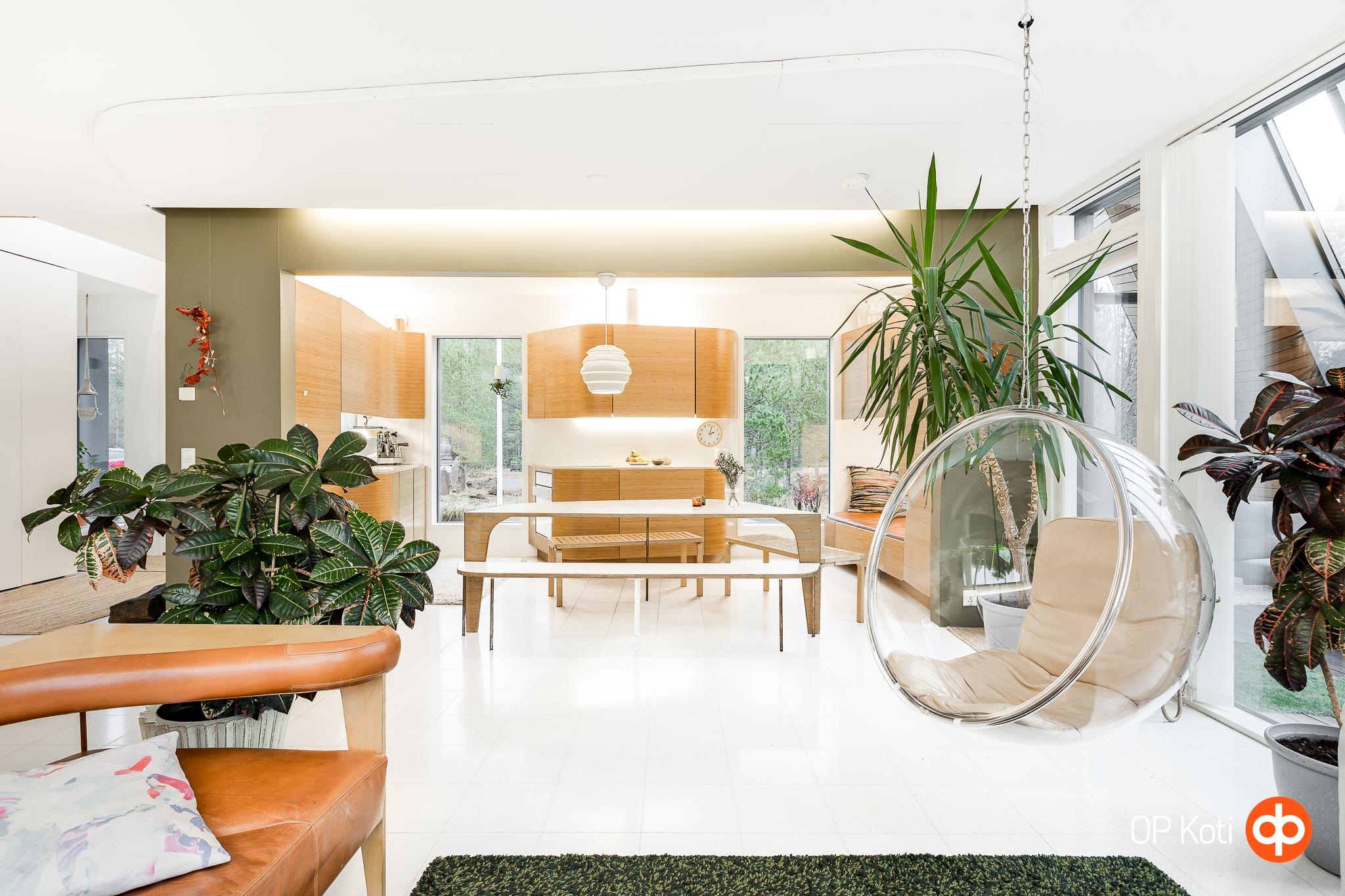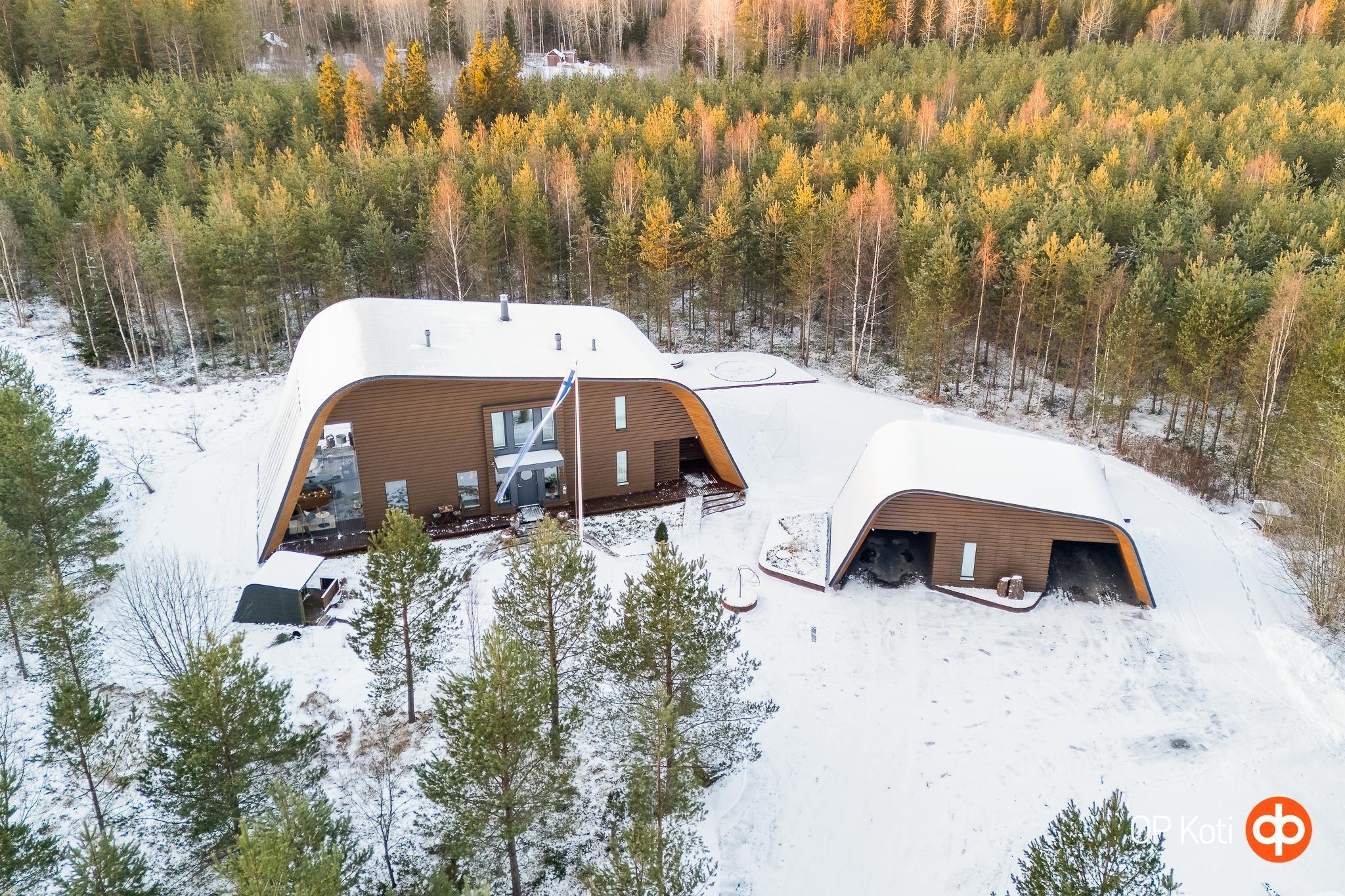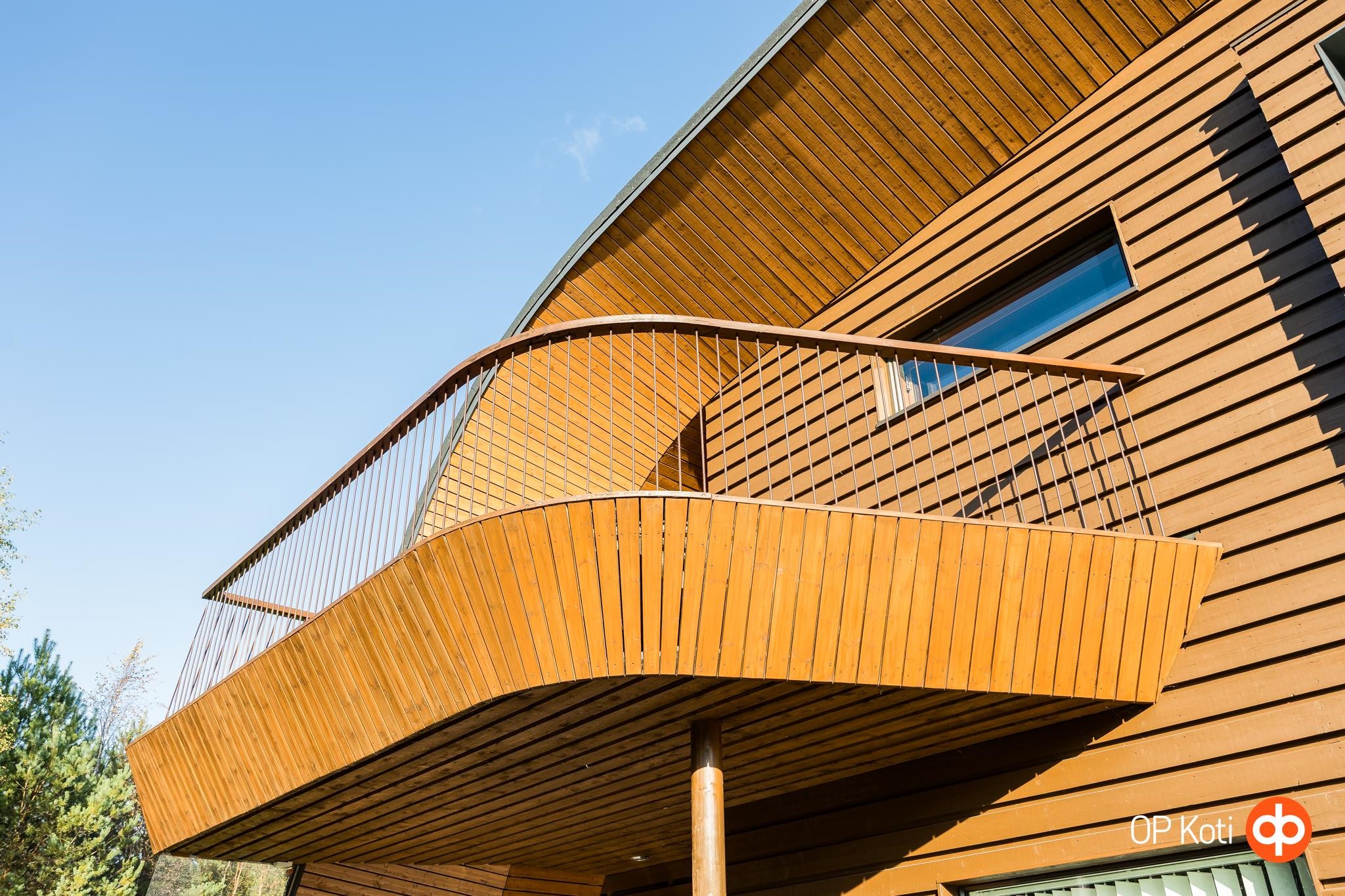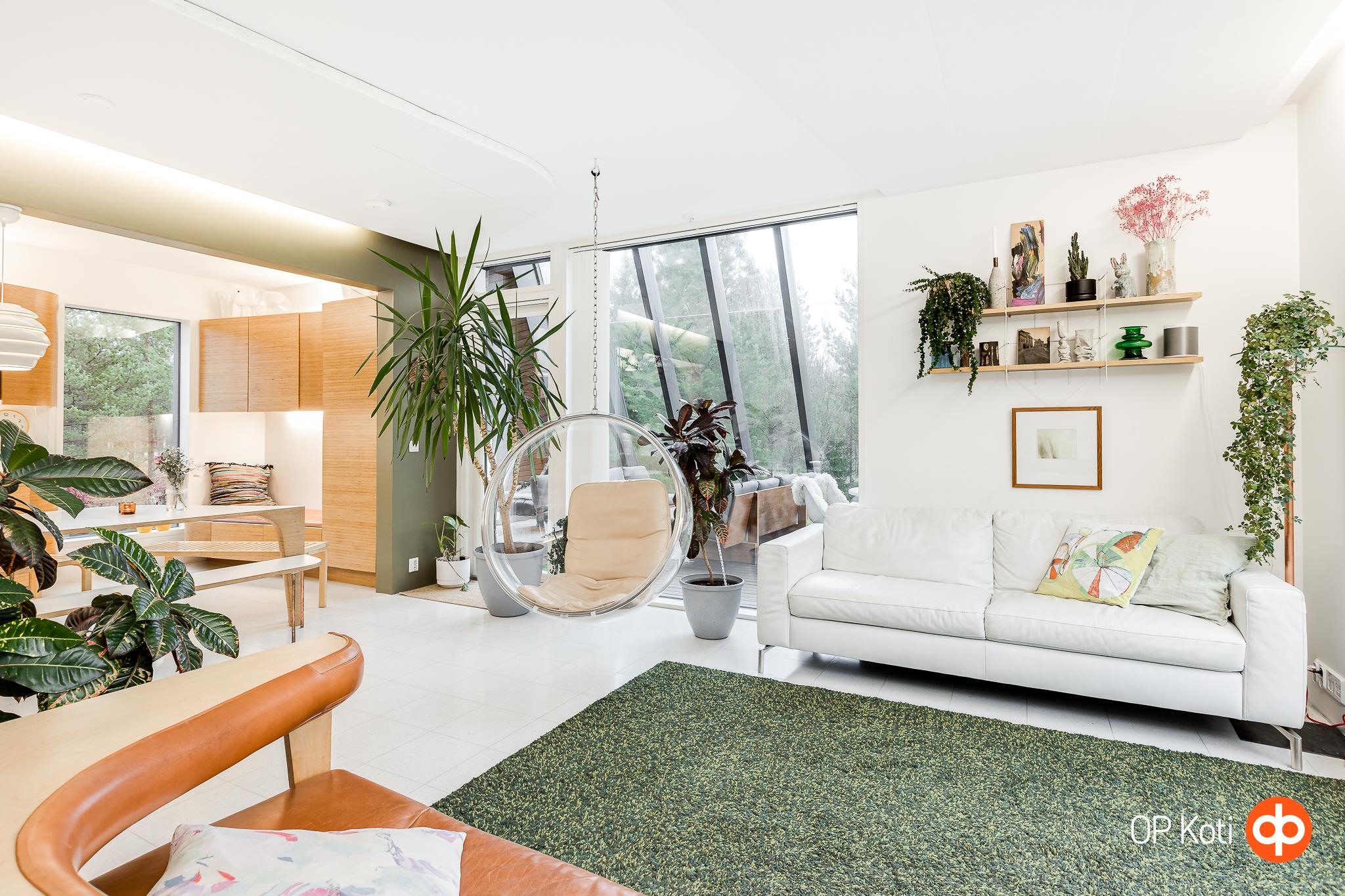 Kahteen kerrokseen sijoittuvat asuintilat ovat syntyneet rakkaudesta muotoiluun ja toimivuuteen. Kaareva katto, näyttävä kupariseinä ja yli 100 m² osin lasitettu terassi tekevät kodista arkkitehtonisen elämyksen. Puusepän valmistama massiivipuukeittiö valkobetonitasoineen on kuin veistos. Portaikko ja varaava takka yhdistävät insinööritarkkuuden ja taiteen.