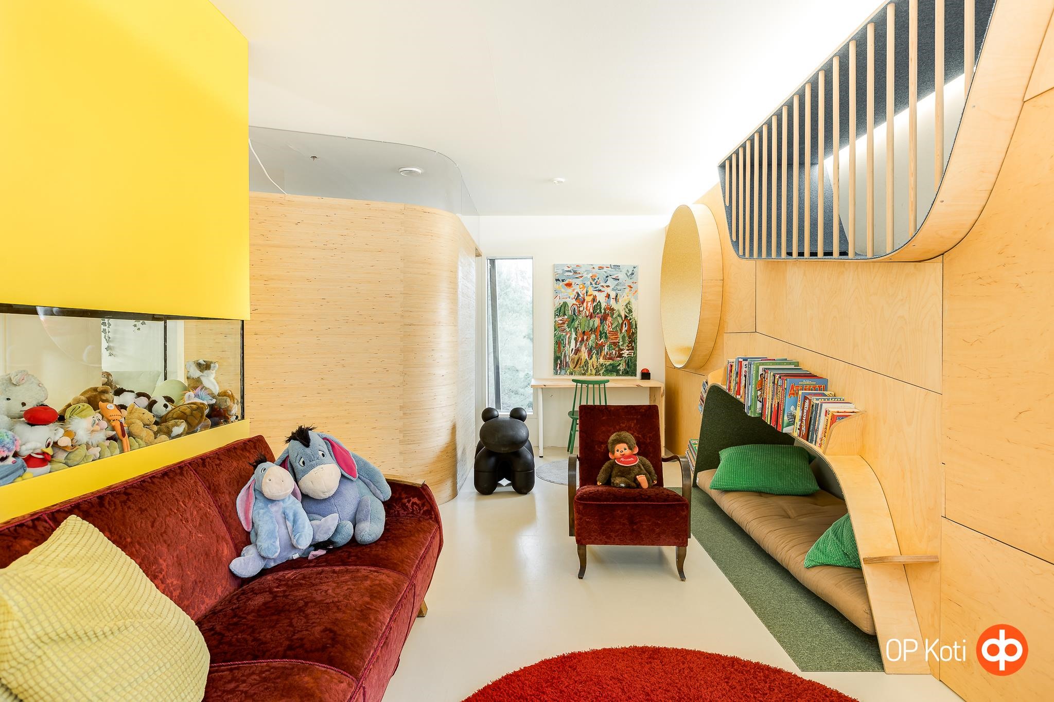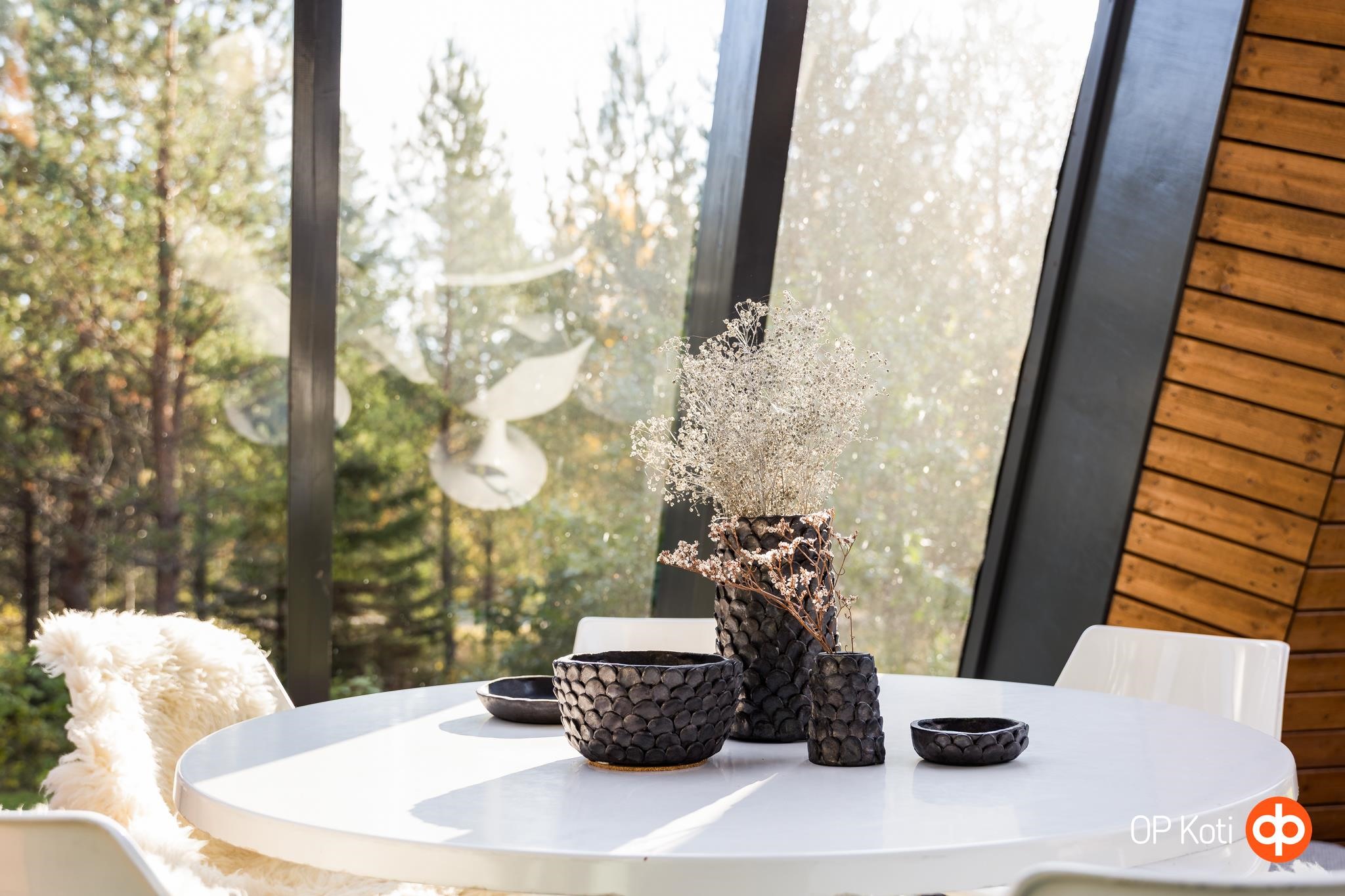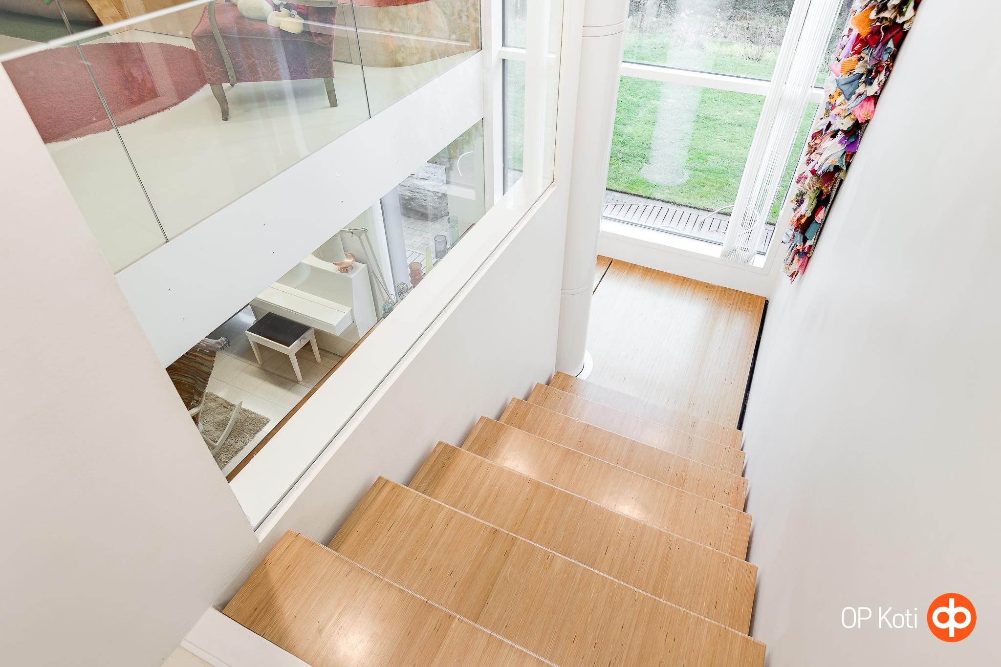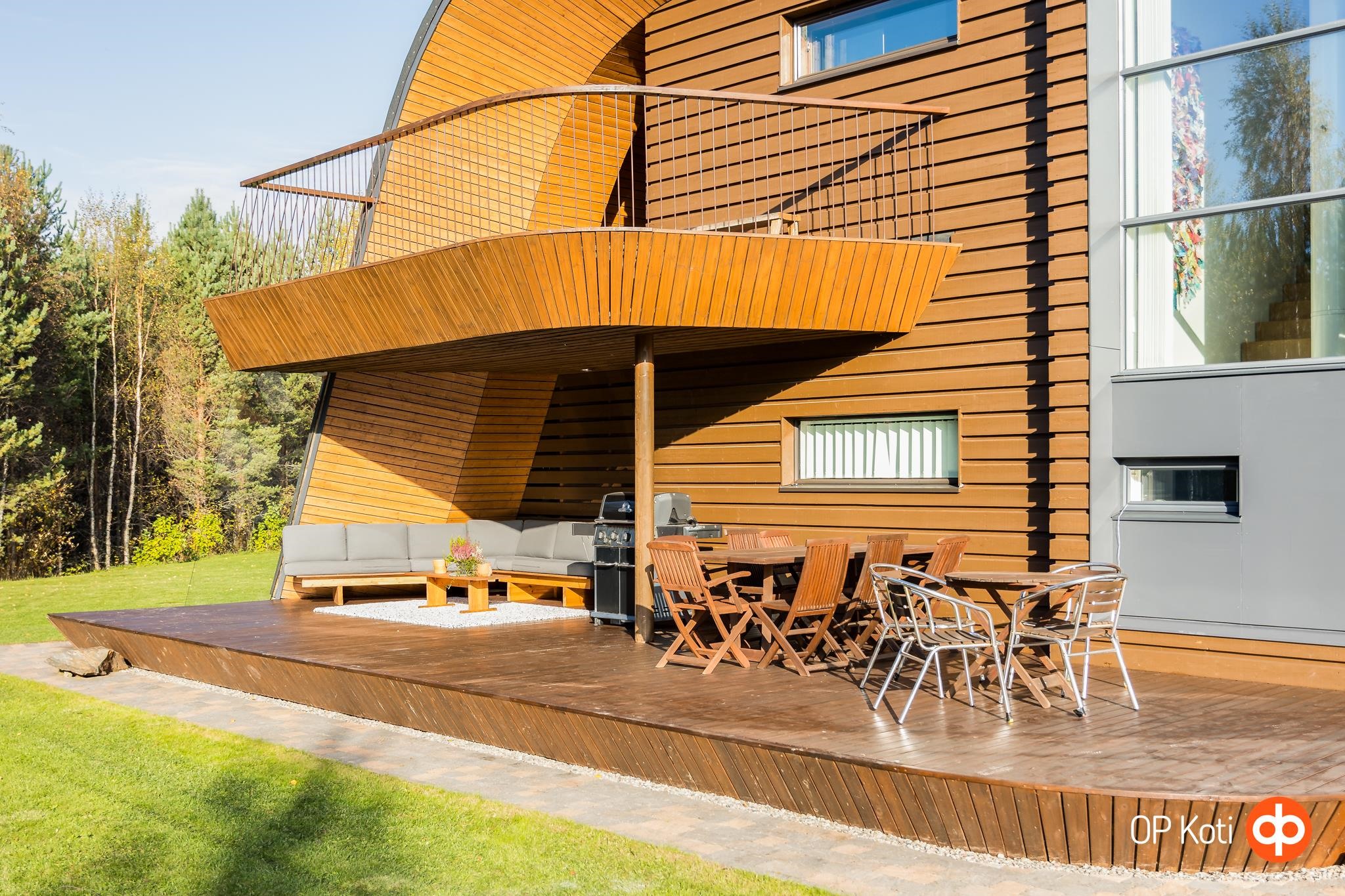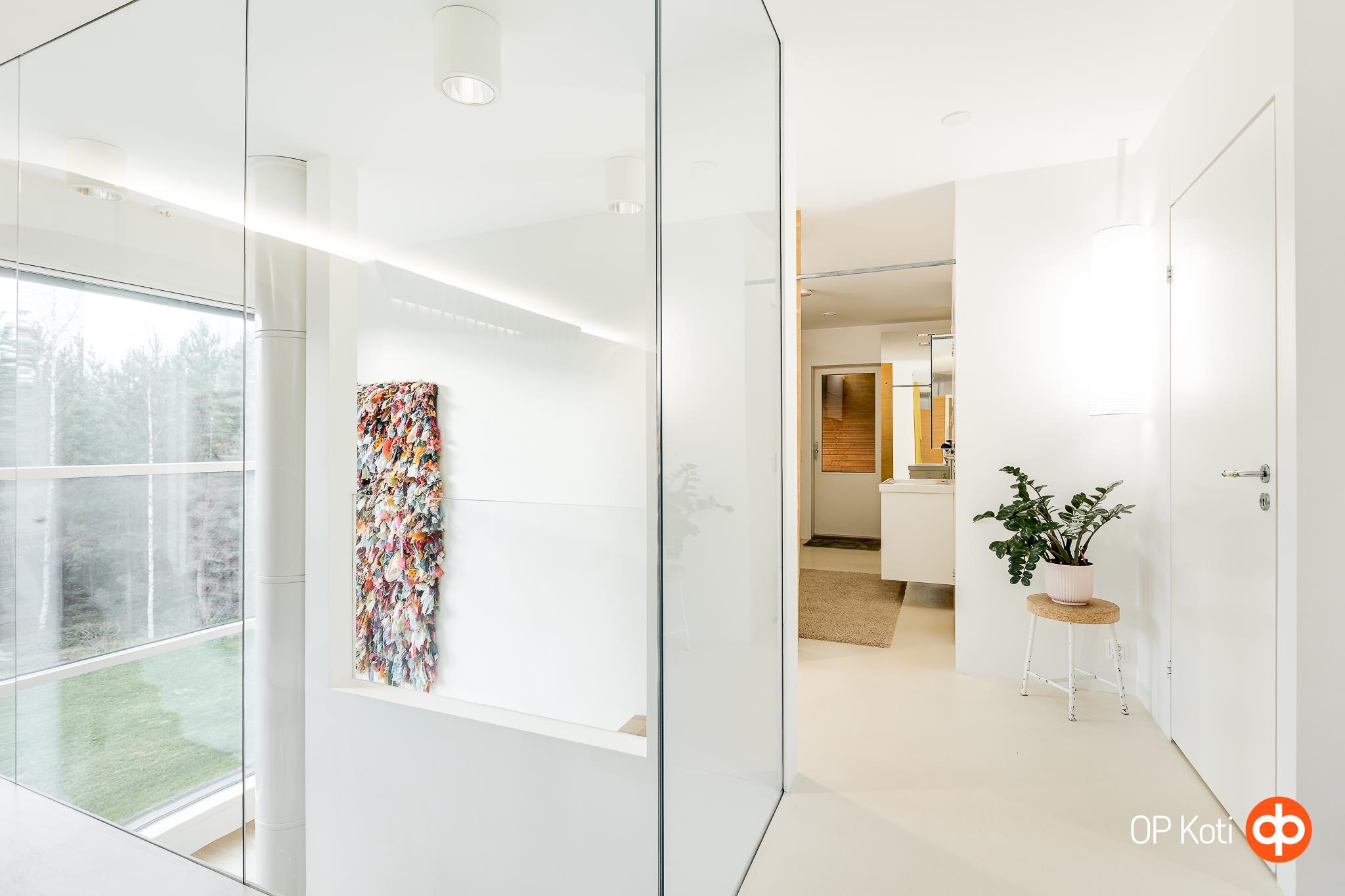 Kahteen kerrokseen sijoittuvat asuintilat ovat syntyneet rakkaudesta muotoiluun ja toimivuuteen. Kaareva katto, näyttävä kupariseinä ja yli 100 m² osin lasitettu terassi tekevät kodista arkkitehtonisen elämyksen. Puusepän valmistama massiivipuukeittiö valkobetonitasoineen on kuin veistos. Portaikko ja varaava takka yhdistävät insinööritarkkuuden ja taiteen.