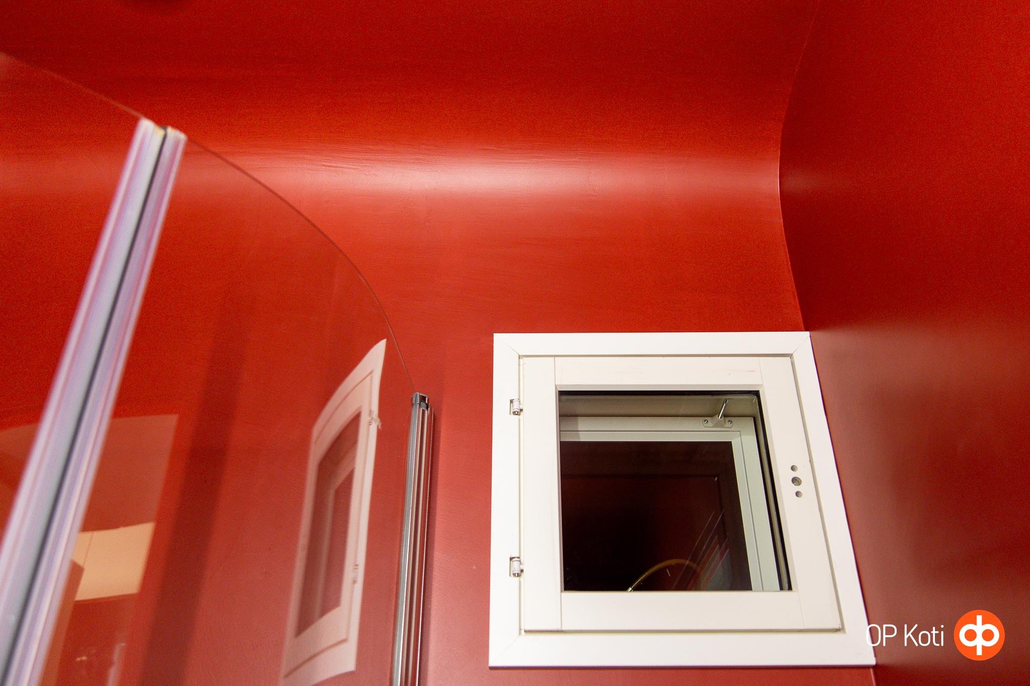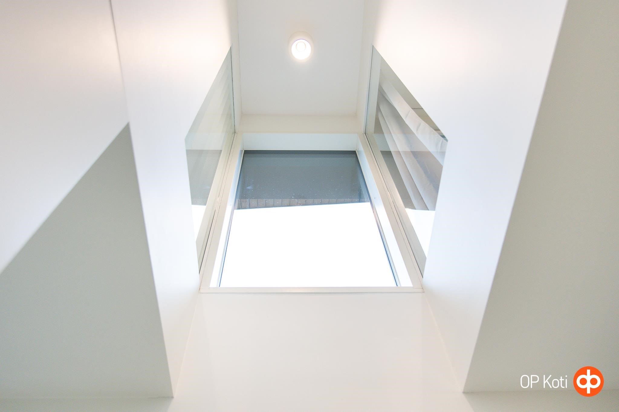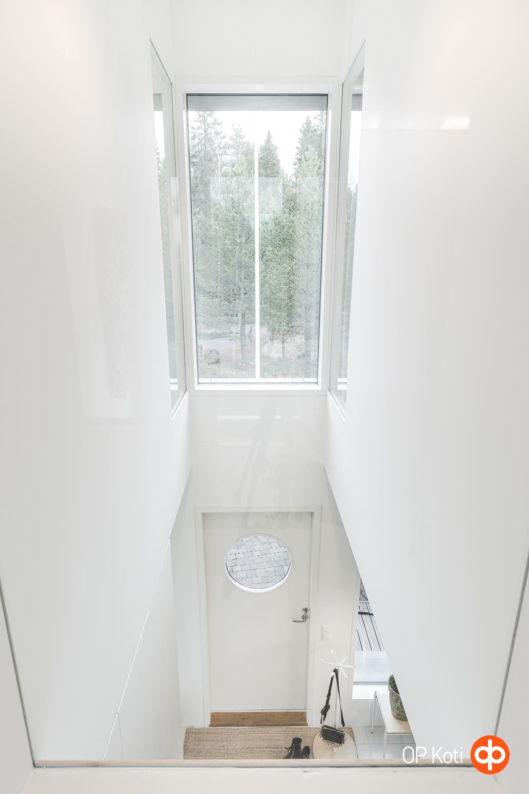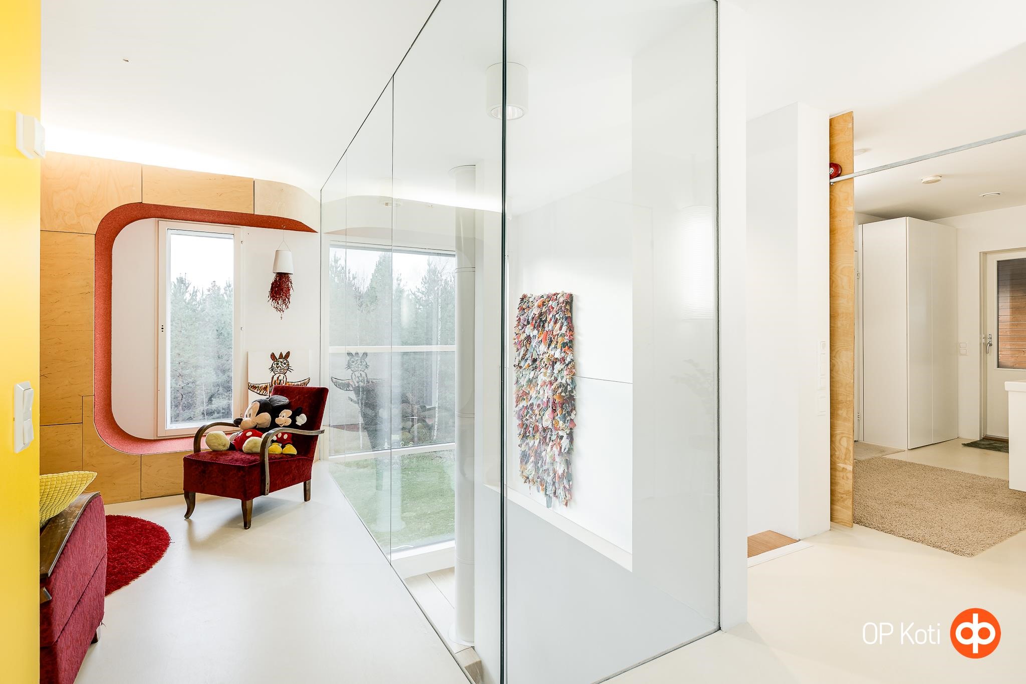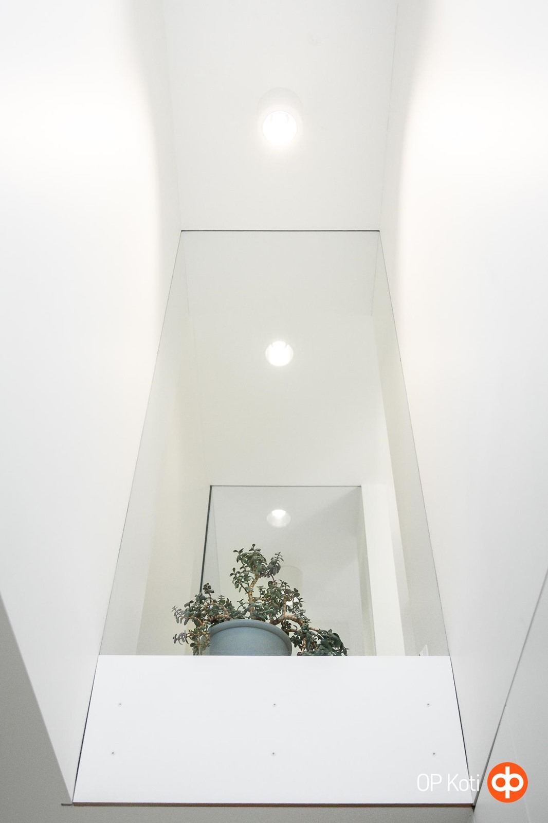 Kahteen kerrokseen sijoittuvat asuintilat ovat syntyneet rakkaudesta muotoiluun ja toimivuuteen. Kaareva katto, näyttävä kupariseinä ja yli 100 m² osin lasitettu terassi tekevät kodista arkkitehtonisen elämyksen. Puusepän valmistama massiivipuukeittiö valkobetonitasoineen on kuin veistos. Portaikko ja varaava takka yhdistävät insinööritarkkuuden ja taiteen.