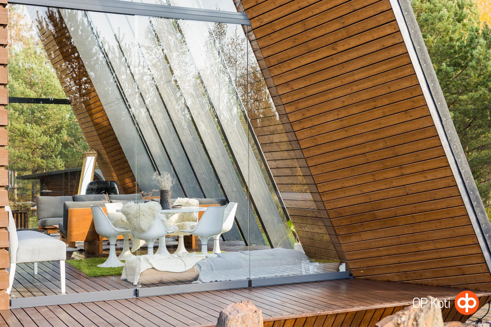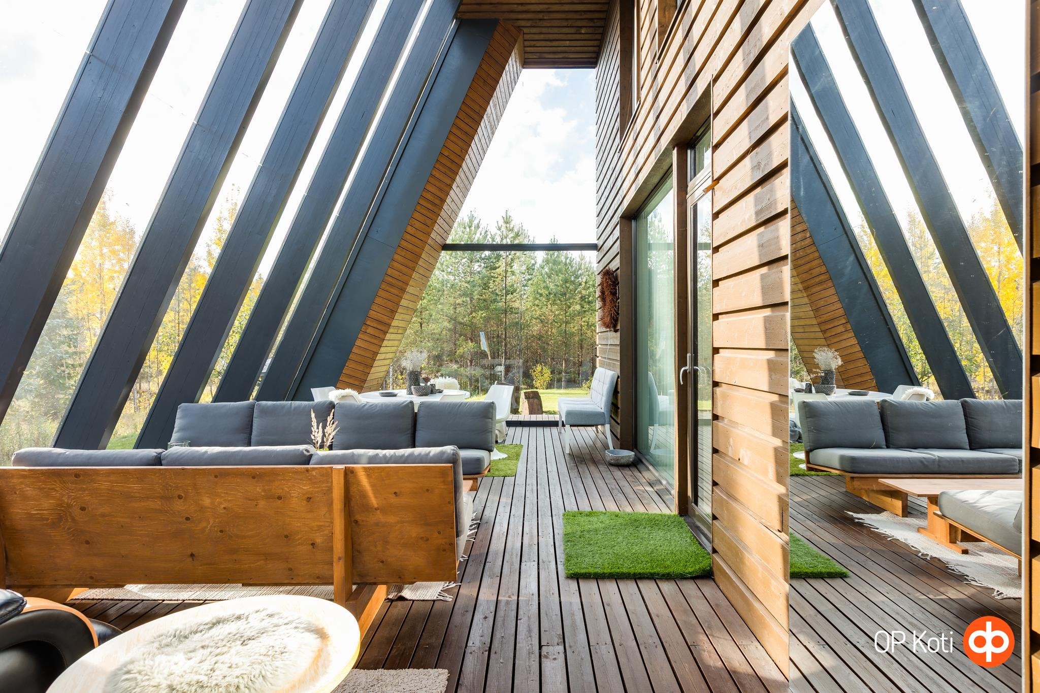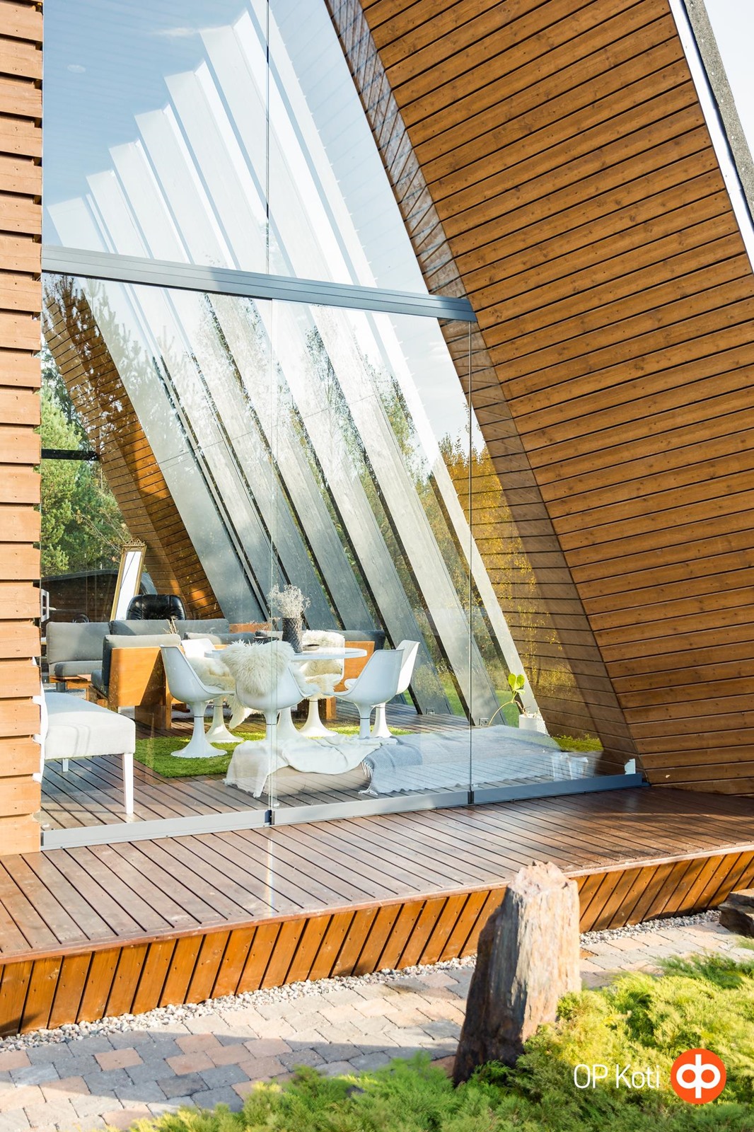 - Puu. Ulkoverhoiluna vaakaan asennettu lomalaudoitus, johon teetetty oma paksu lauta. Nurkat jiiriin asennettu.