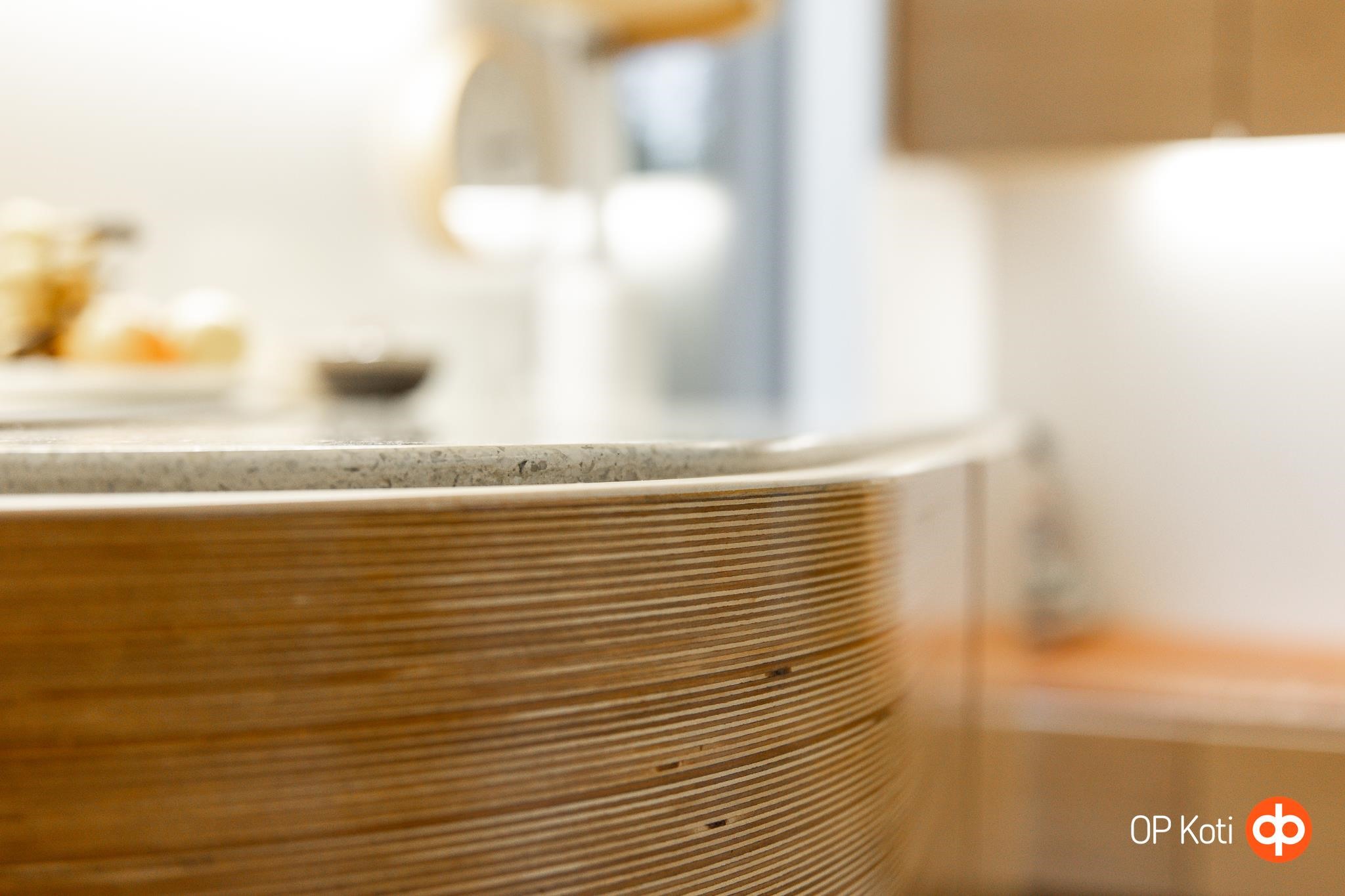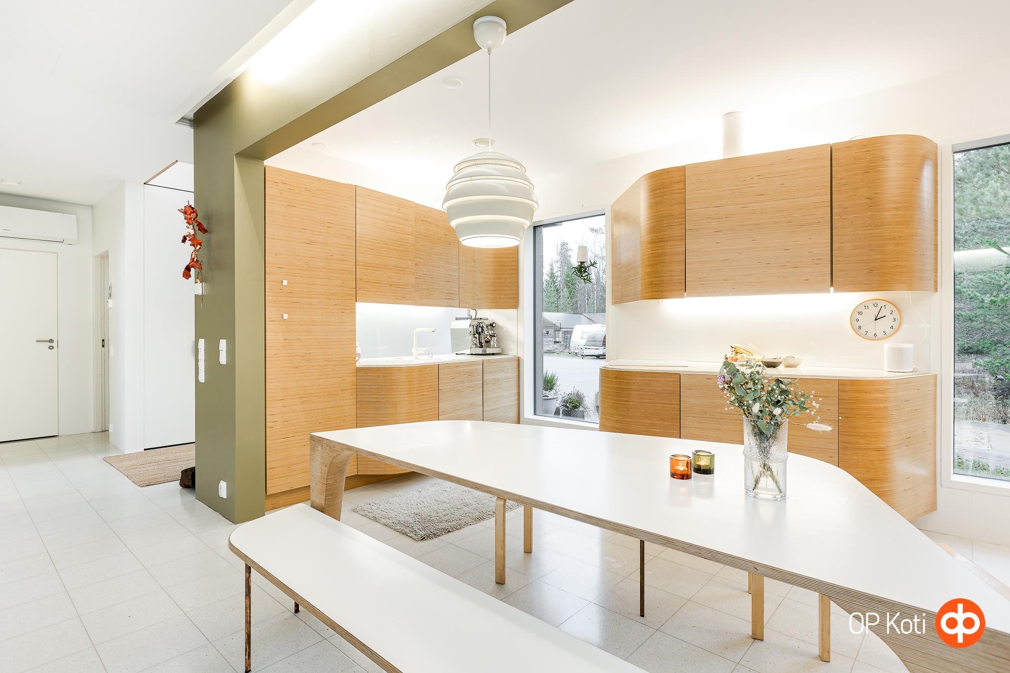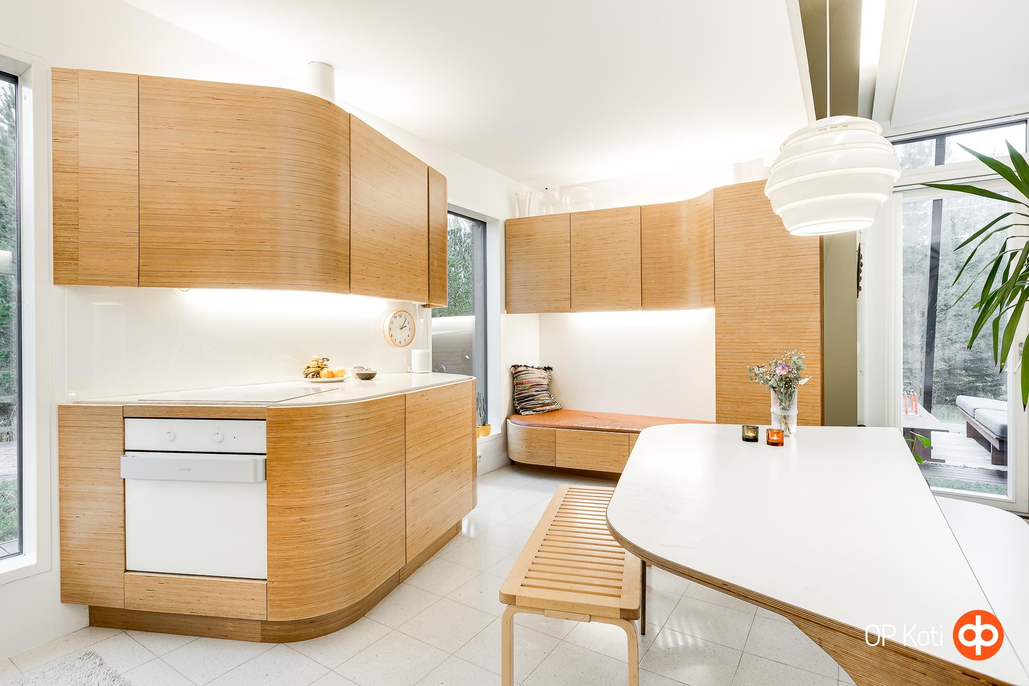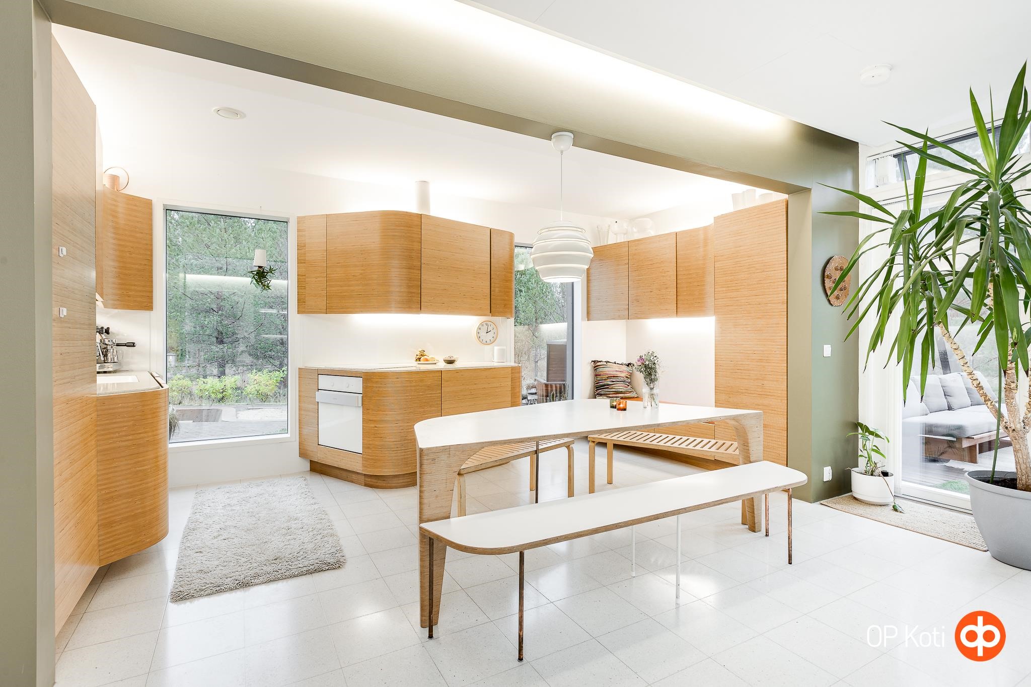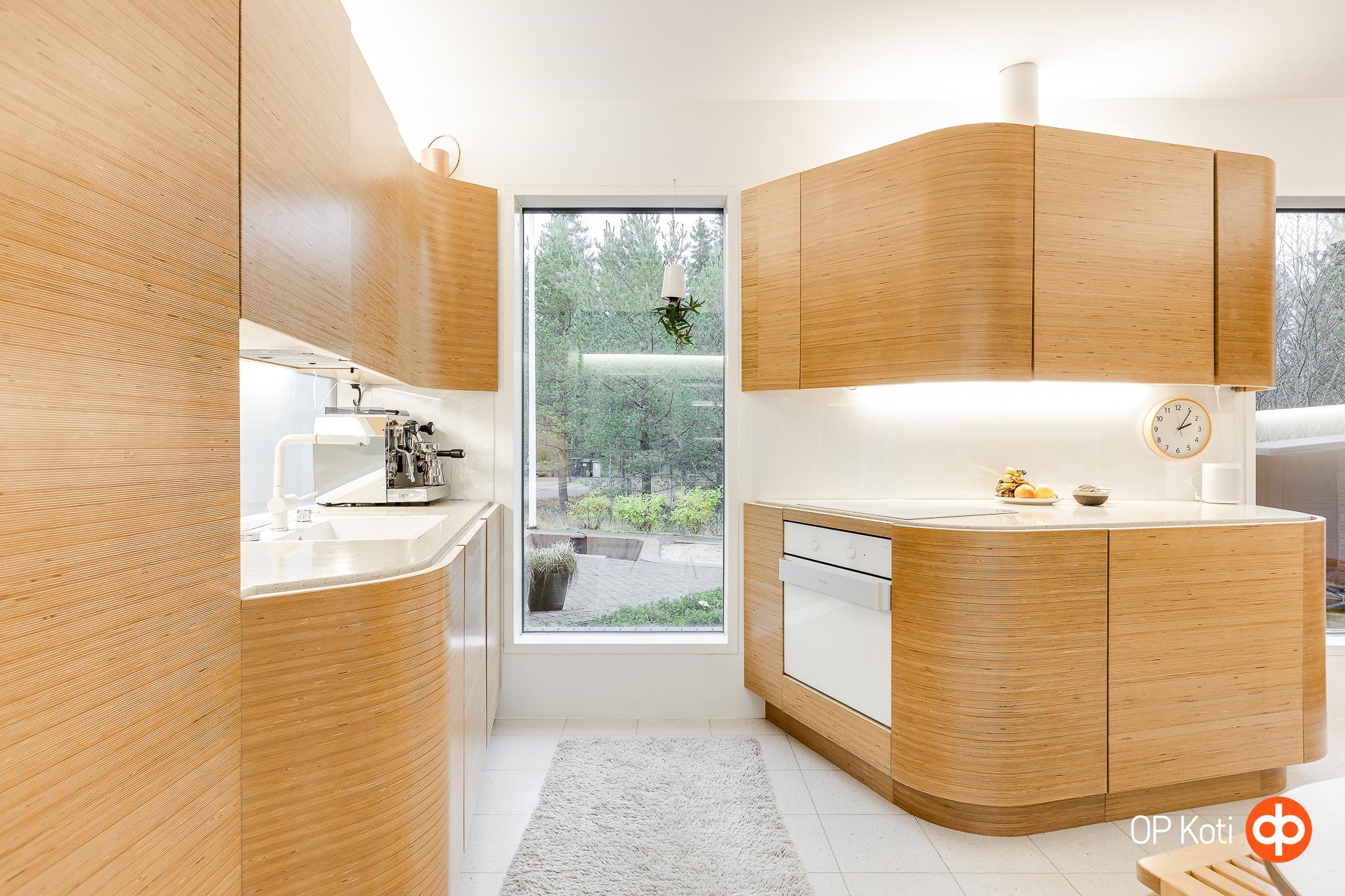 - Jääkaappipakastin, erillisuuni, liesitaso (induktio), liesituuletin, astianpesukone, kaapistot (puusepän valmistamat, koivuvaneriset), pöytätasojen materiaali betoni.
