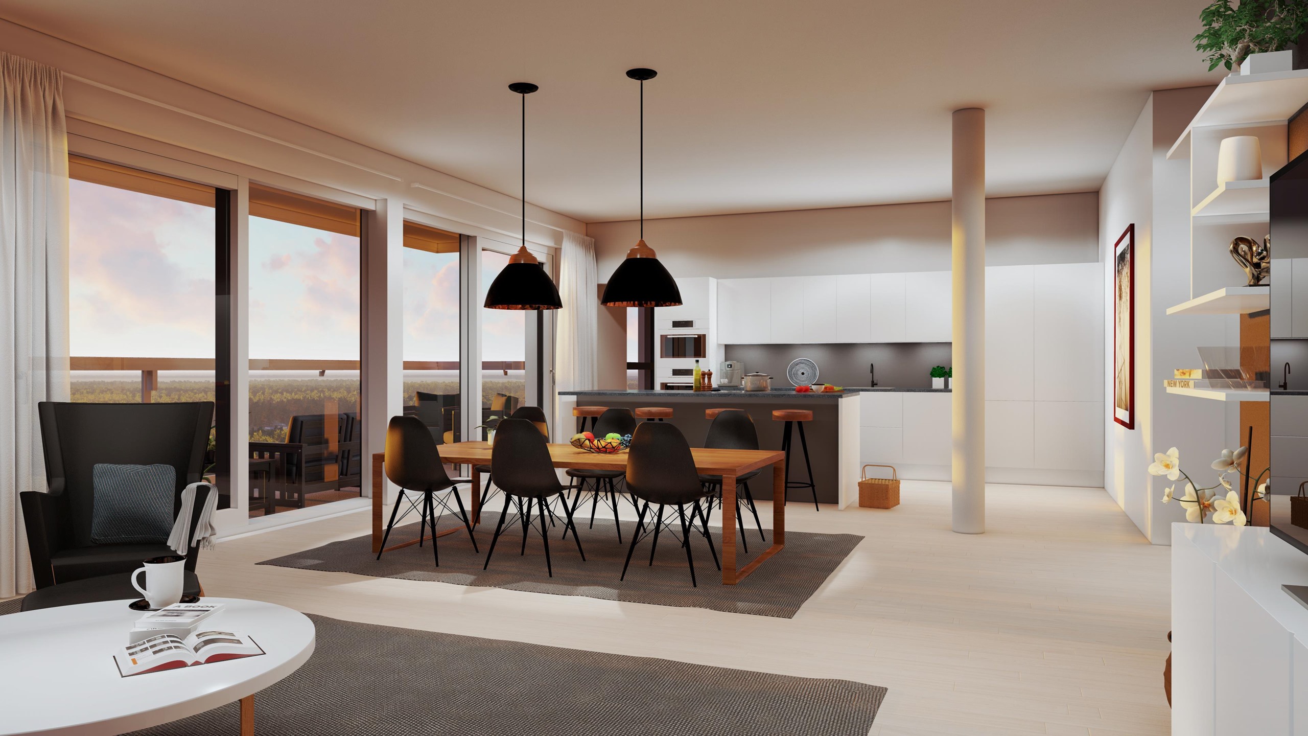 - Jääkaappipakastin integroitu, erillisuuni kalusteuuni, liesitaso, induktioliesi, liesituuletin kalustesuunnitelman mukaan, mikroaaltouuni integroitu, astianpesukone integroitu, kaapistot, kiinteät valaisimet. Kiintokalusteiden ovet ovat MDF-pintaisia. Pöytätasot laminaattipintaiset, tasoon upotettu teräsallas. Keittiön kalustevälit, liesikuvun ylösnosto ja liesien tausta erillisen sisustussuunnitelman mukaan välitilalevyä. Integroidut laadukkaan kodinkoneet. Lisäksi etulevyllinen verhokisko kahdella kiskolla, joka asennetaan katon rajaan, pääsääntöisesti seinästä seinään.