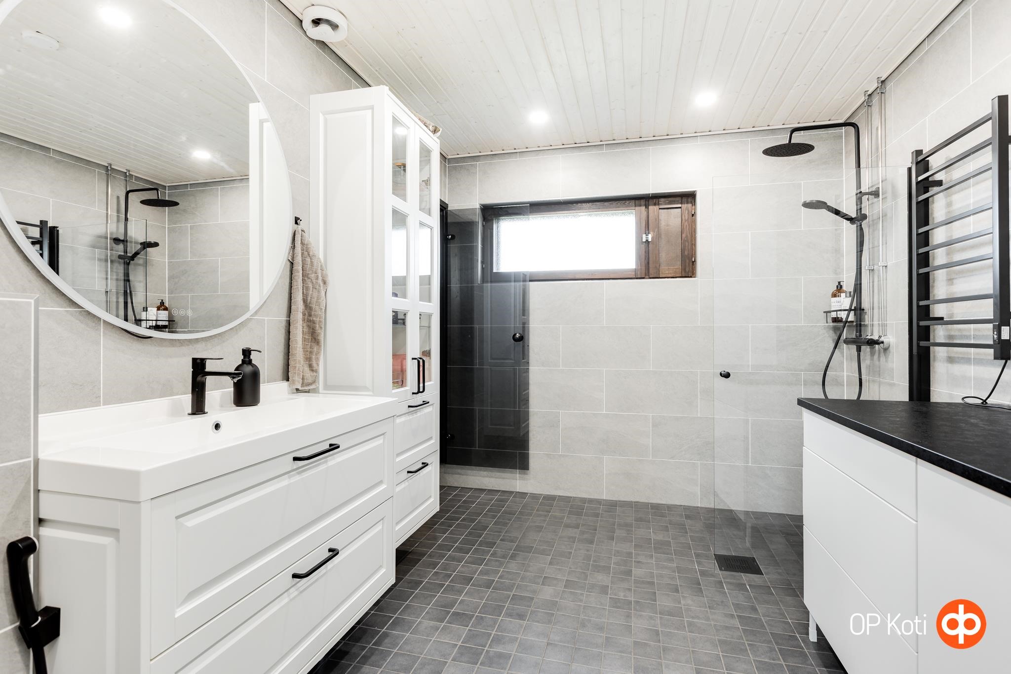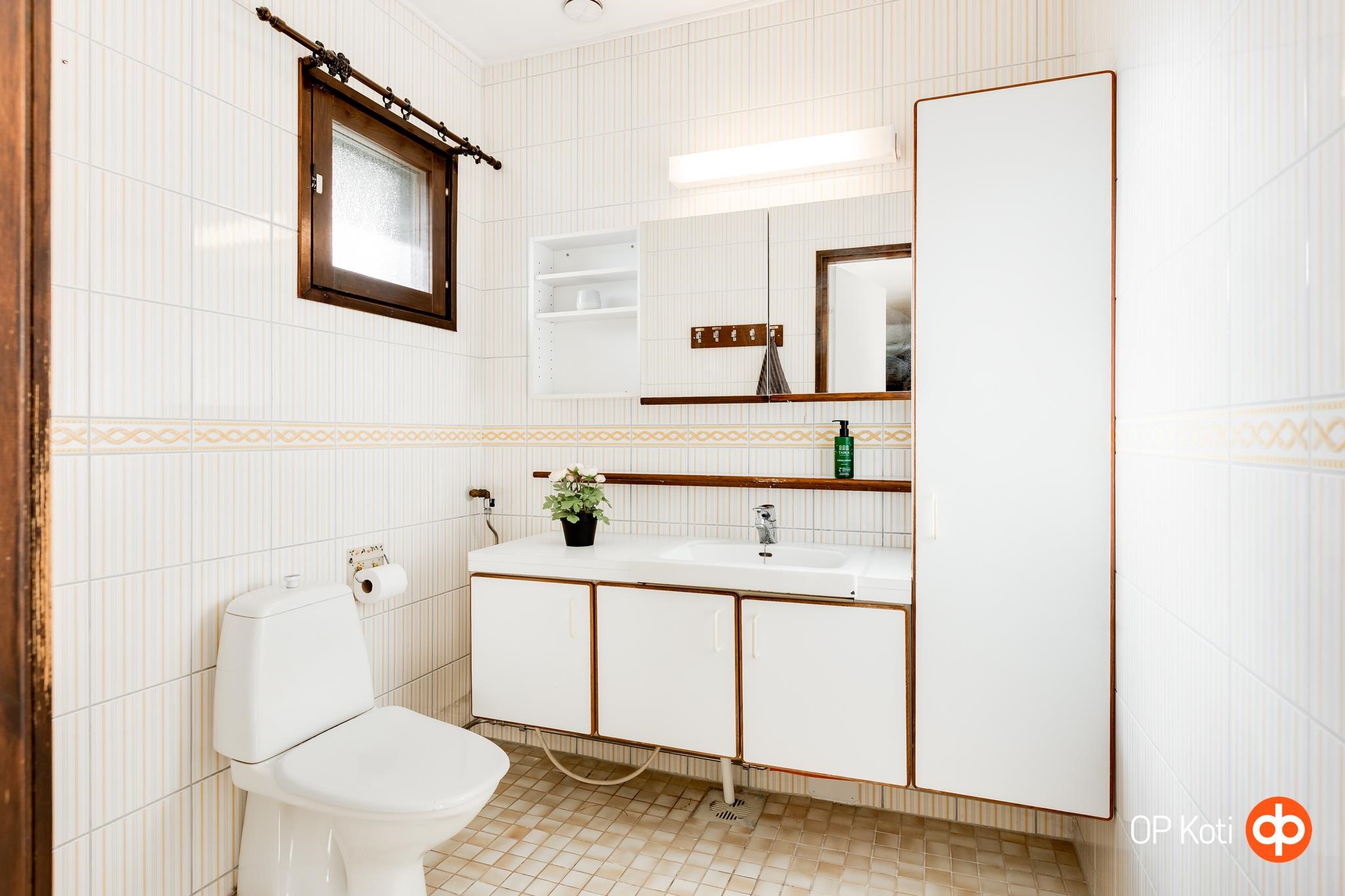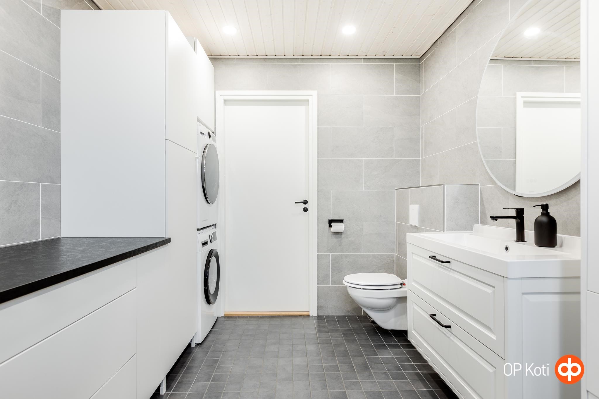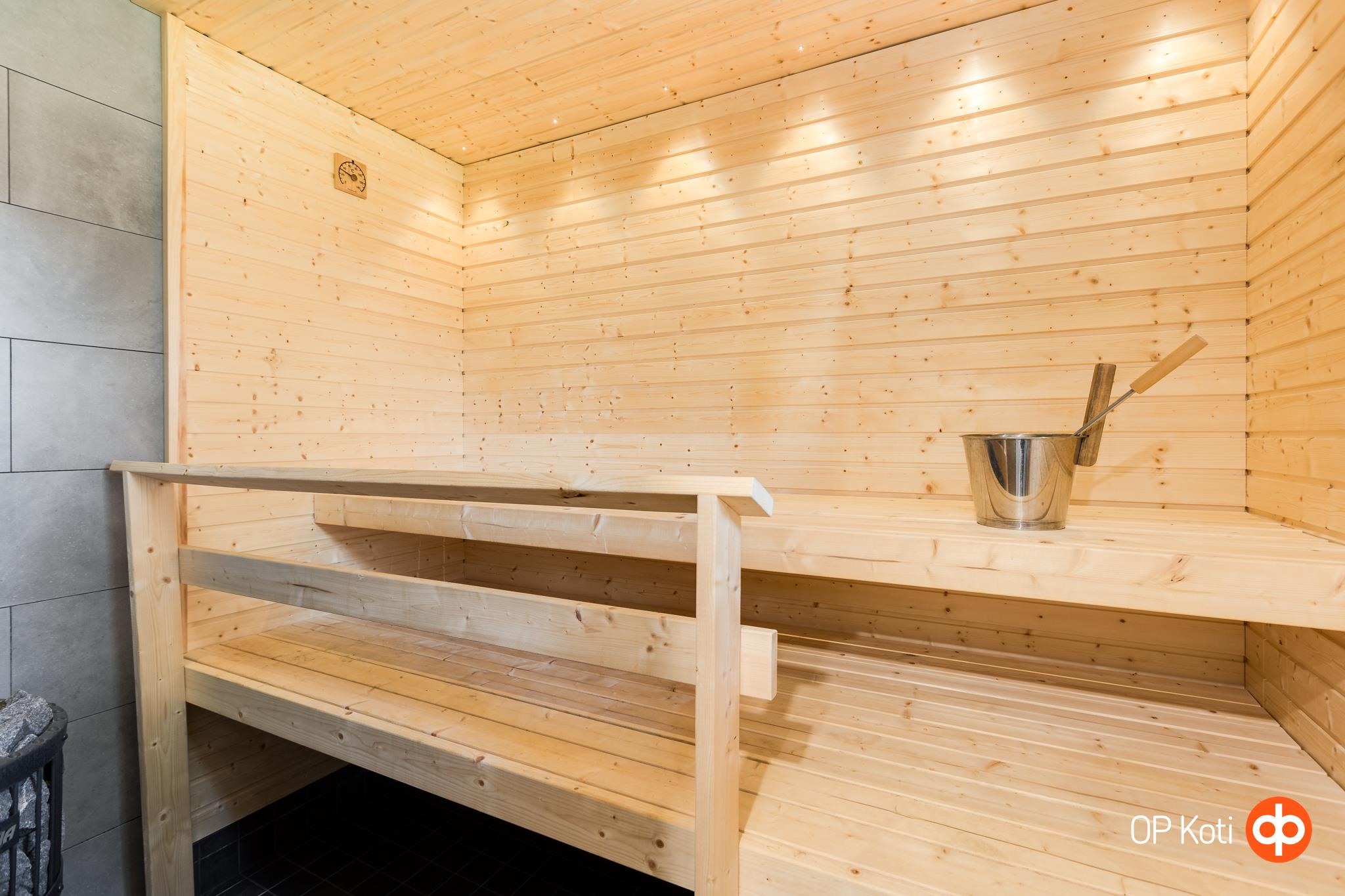 - Sauna, puukiuas, kylpyhuone, erillinen wc, suihku, suihkuseinä, peilit, peilikaappi, kaapit, allaskaappi, pesukoneliitäntä, lattialämmitys, kiinteät valaisimet.