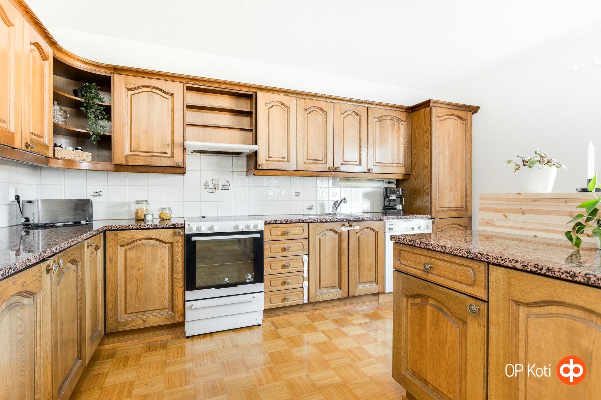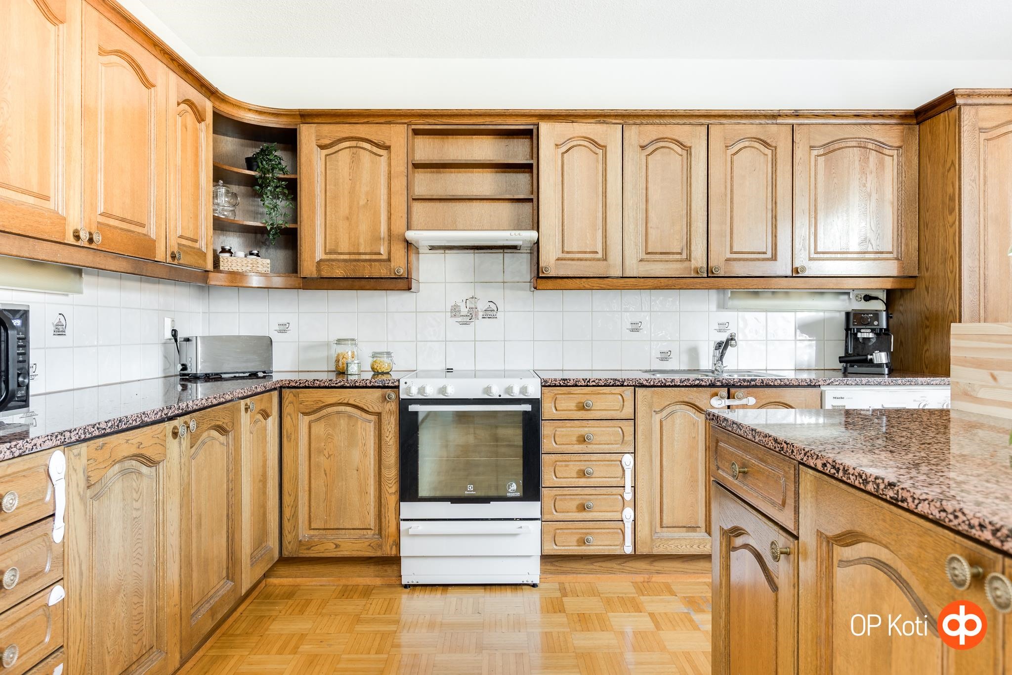 - Jääkaappi, pakastekaappi, keraaminen liesi, liesituuletin, astianpesukone, kaapistot, kiinteät valaisimet.