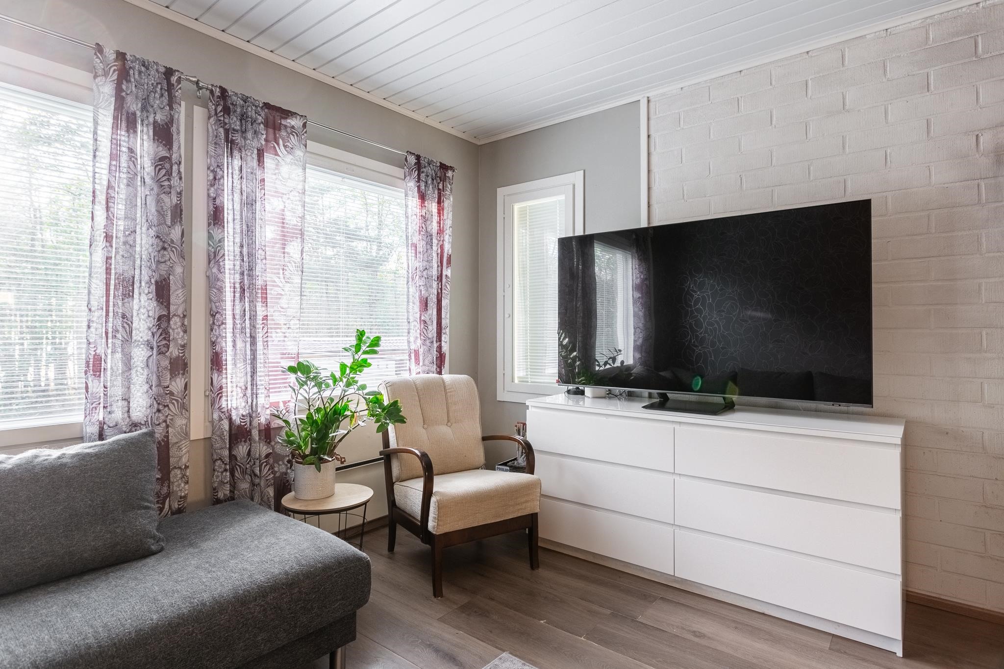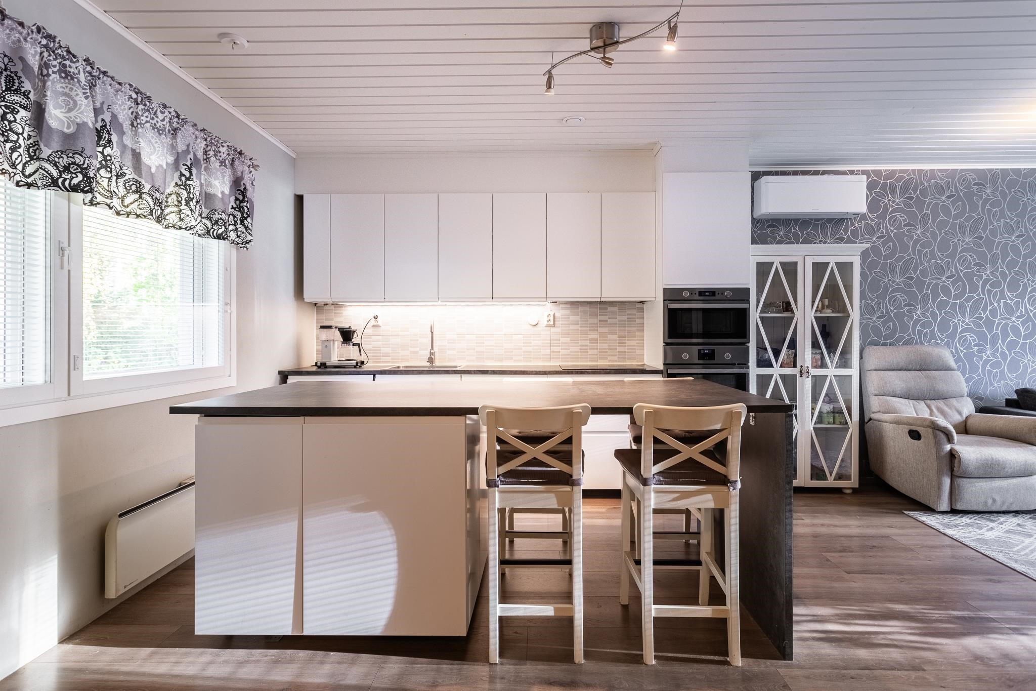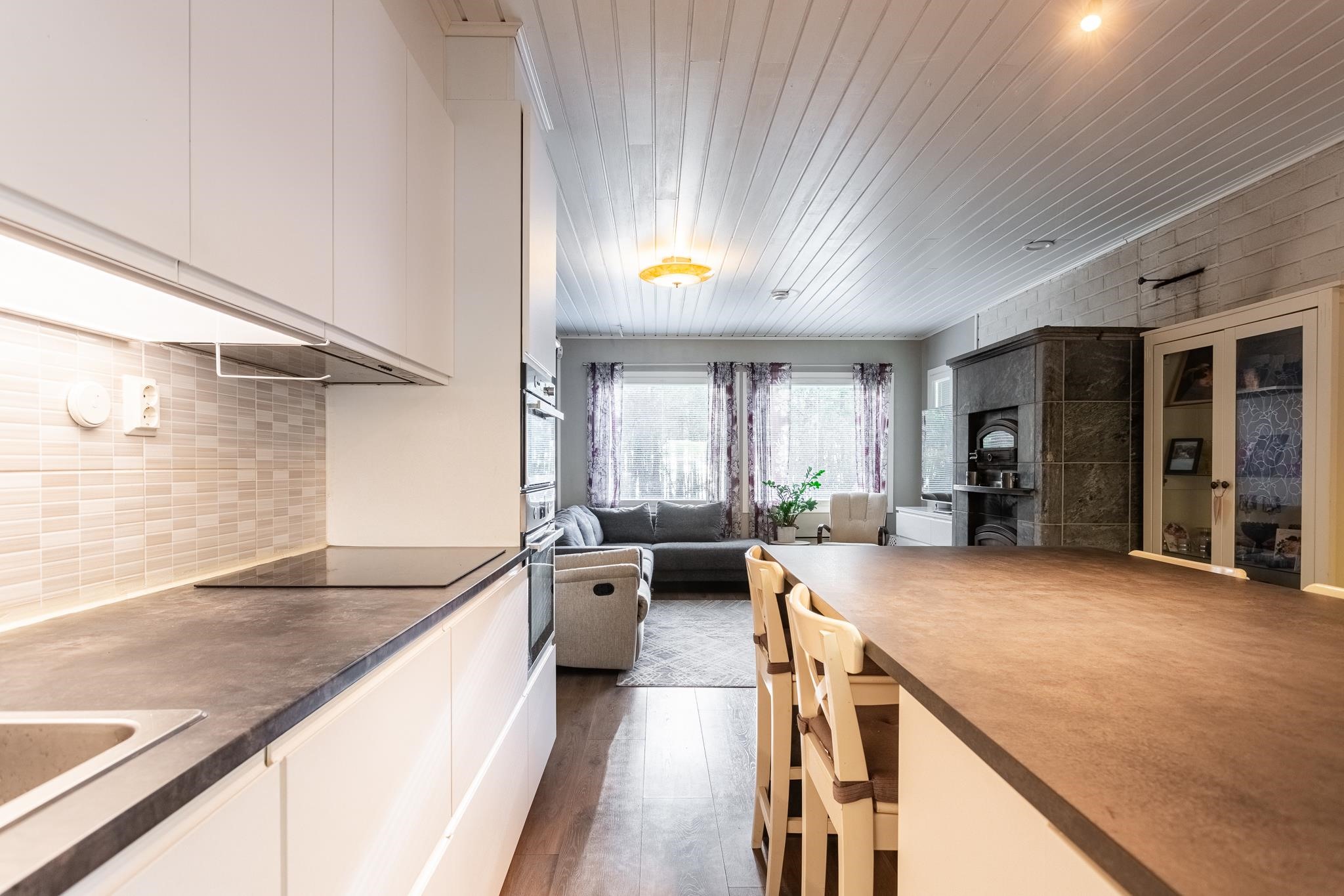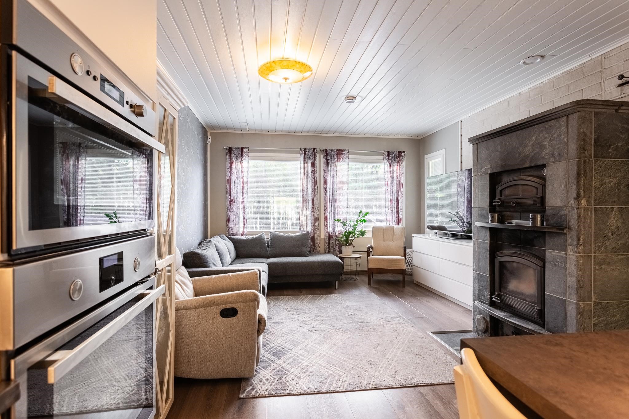 Kahden makuuhuoneen kodissa on yhtenäinen keittiö ja olohuone. Lämmitysjärjestelmänä toimivat sähkö, puu ja ilmalämpöpumppu. Tunnelmaa tupakeittiöön sekä lisälämpöä tuo varaava takka leivinluukulla.