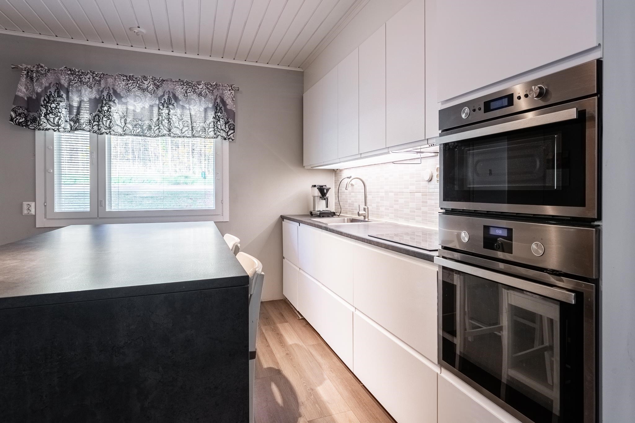 - Jääkaappipakastin, erillisuuni, induktioliesi, liesituuletin, mikroaaltouuni, astianpesukone, kaapistot, kiinteät valaisimet.