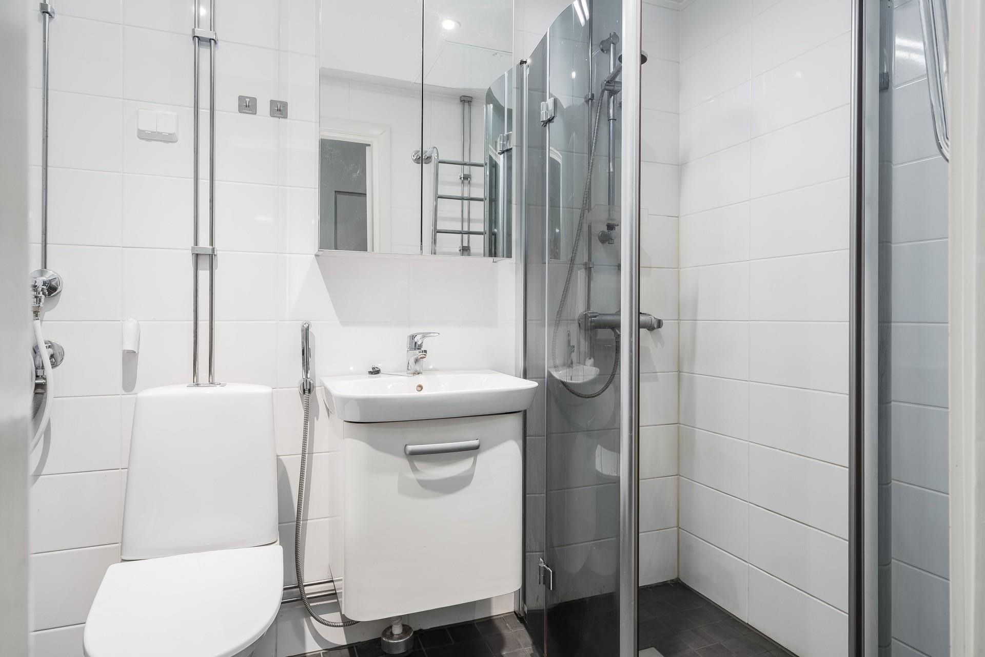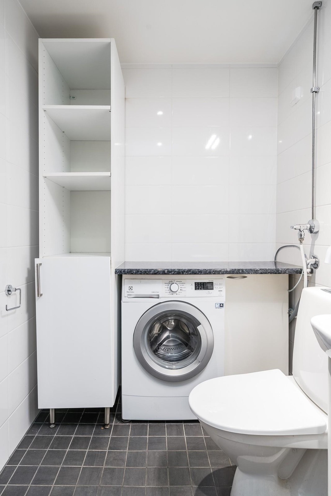 - Suihku, suihkuseinä, peilikaappi, allaskaappi, pesukoneliitäntä, kiinteät valaisimet.