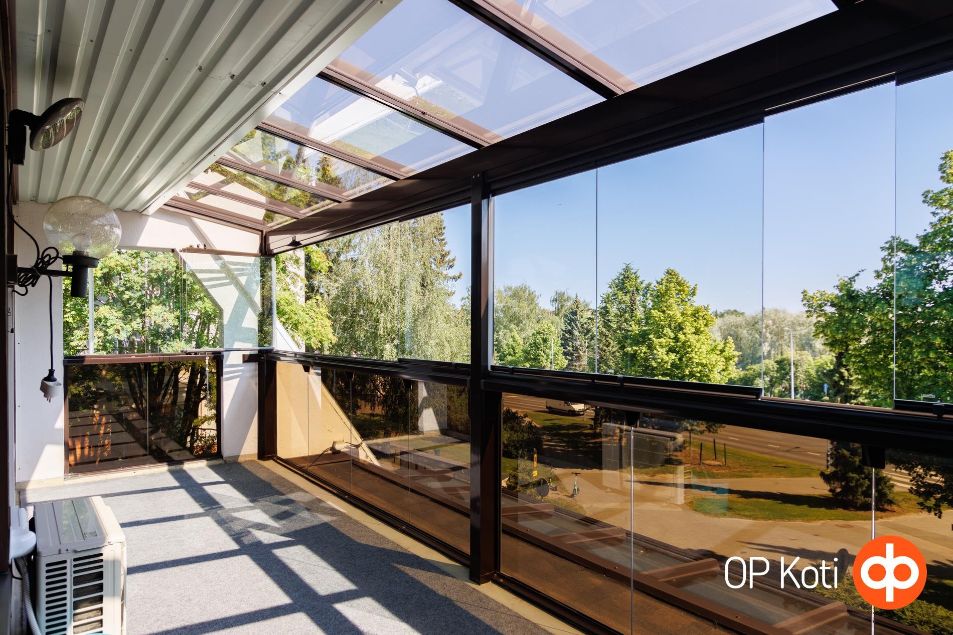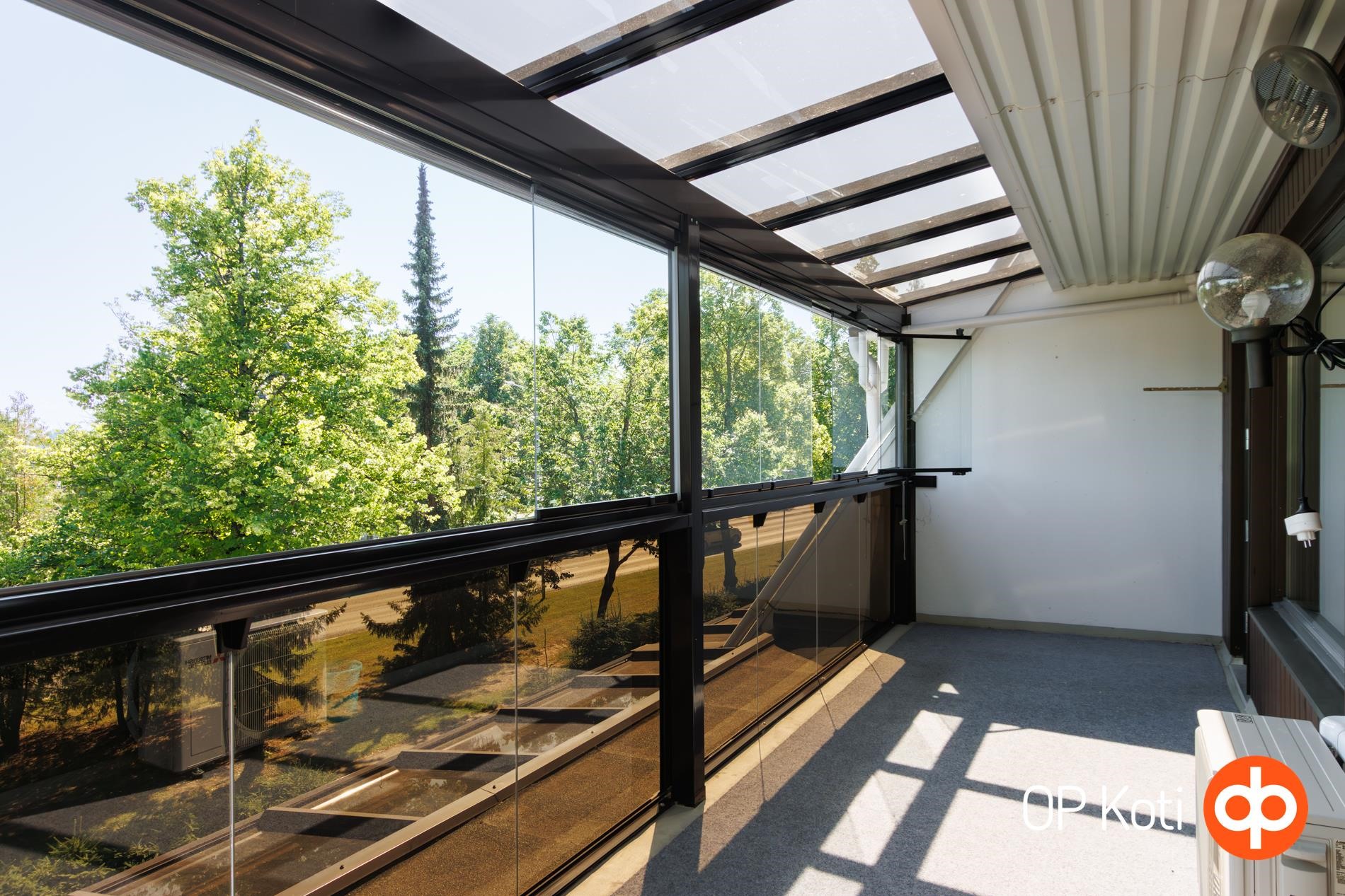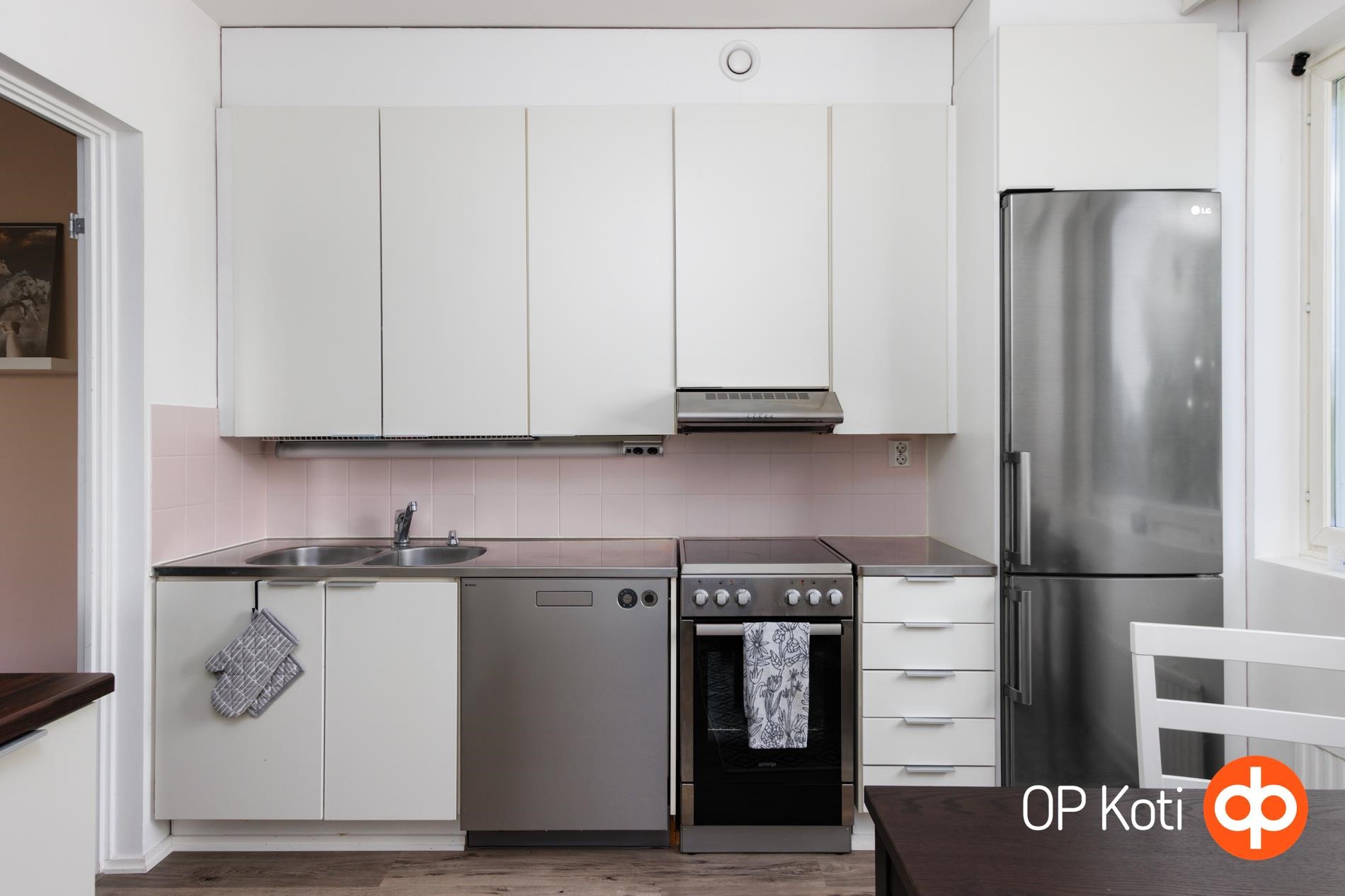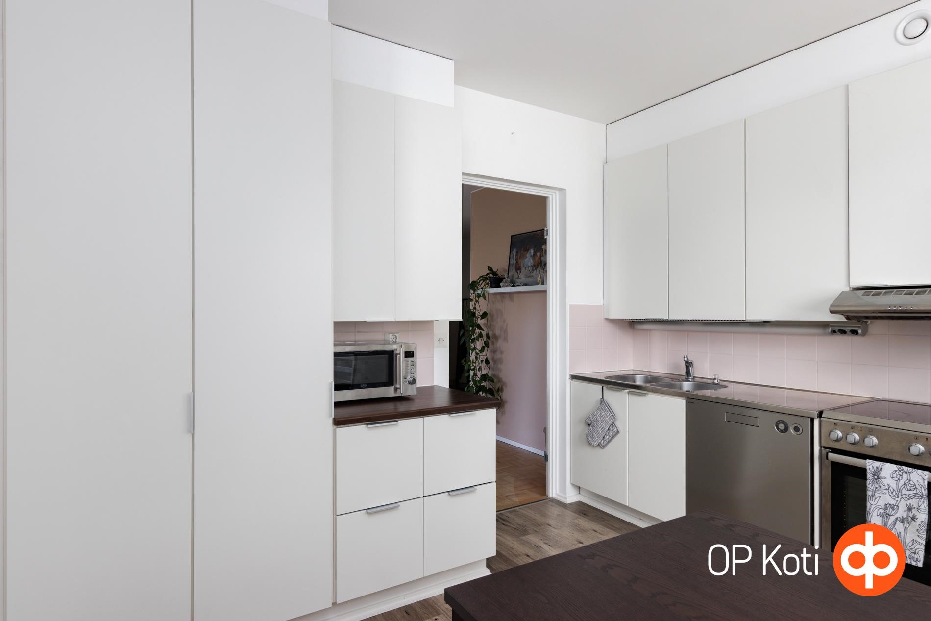 Keittiöstä löytyy modernit kodinkoneet ja reilusti kaappitilaa, varusteluun kuuluu astianpesukone, uuni, liesi, liesituuletin sekä jääkaappipakastin. Olohuoneesta on käynti ihanalle koko huoneiston levyiselle lasitetulle parvekkeelle.
