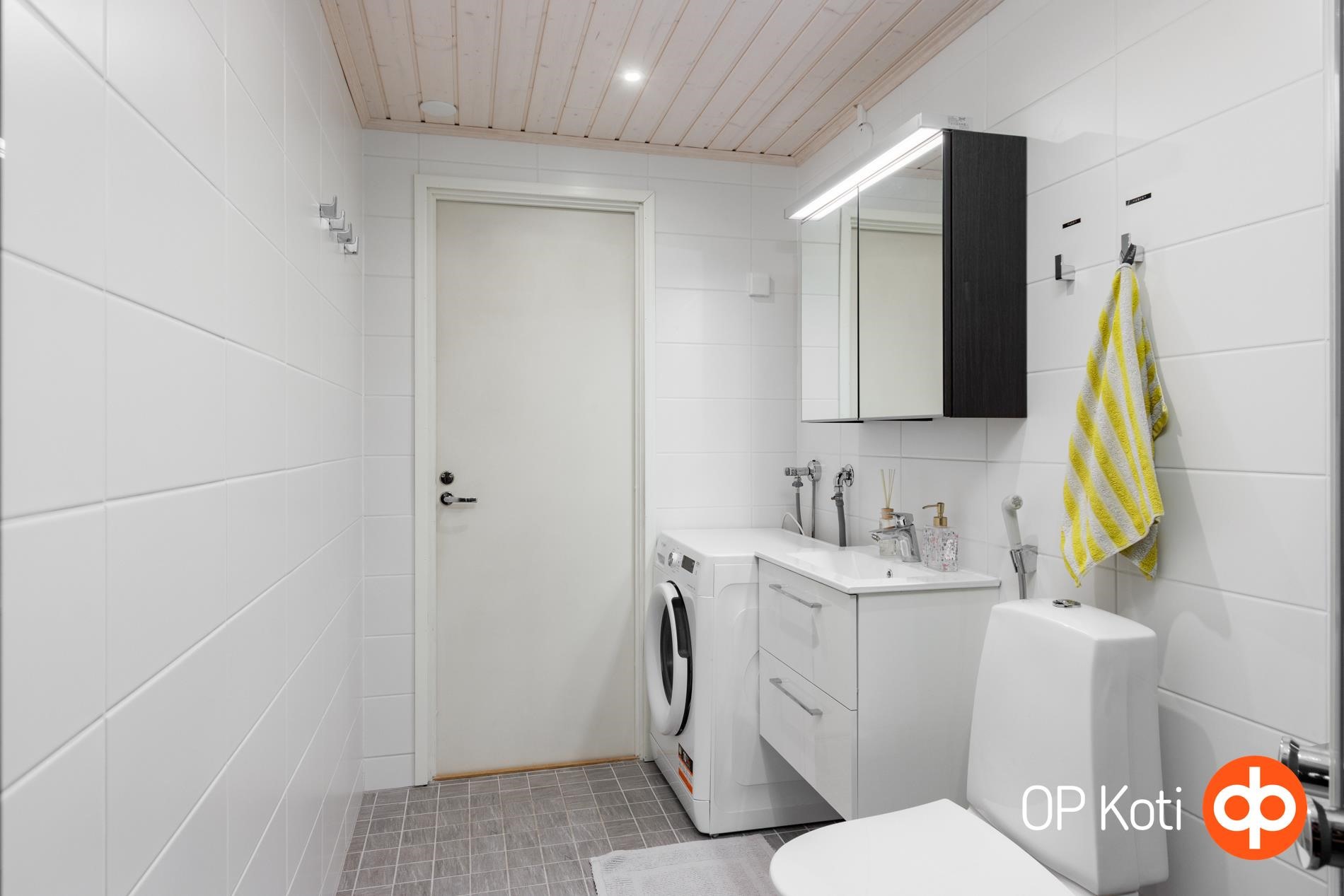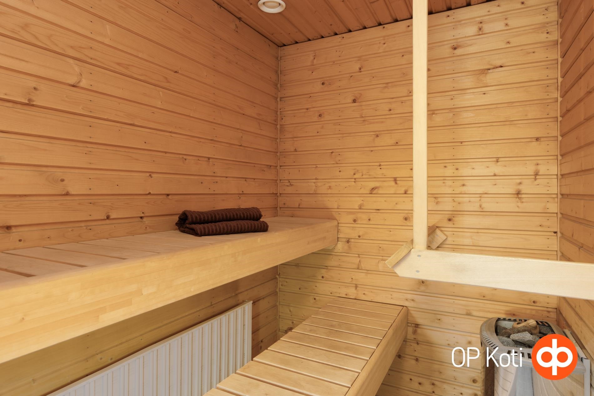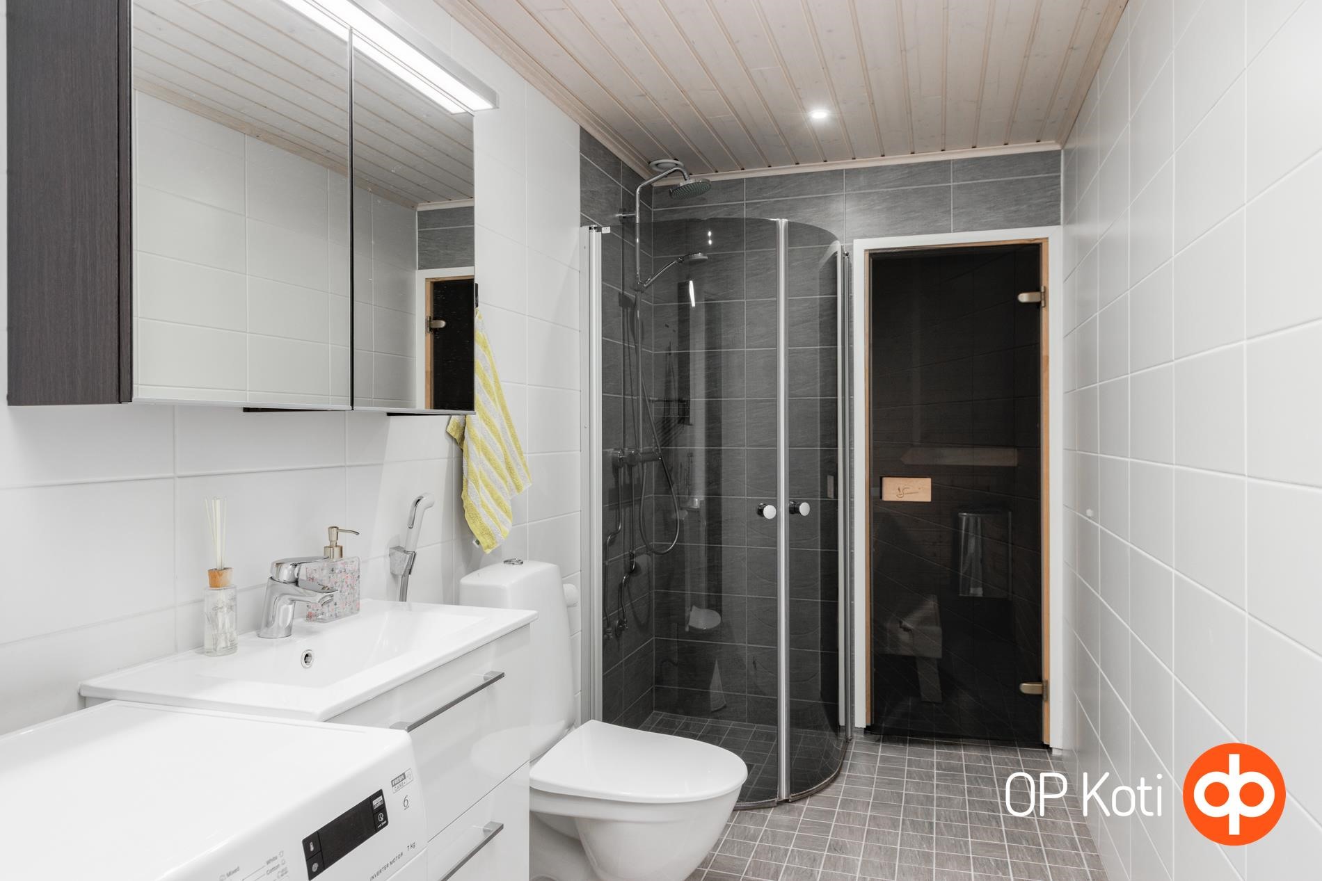 - Sauna, sähkökiuas, kylpyhuone, suihku, suihkuseinä, peilit, peilikaappi, pesukoneliitäntä, lattialämmitys, kiinteät valaisimet. Kylpyhuone ja sauna remontoitu vuonna 2019