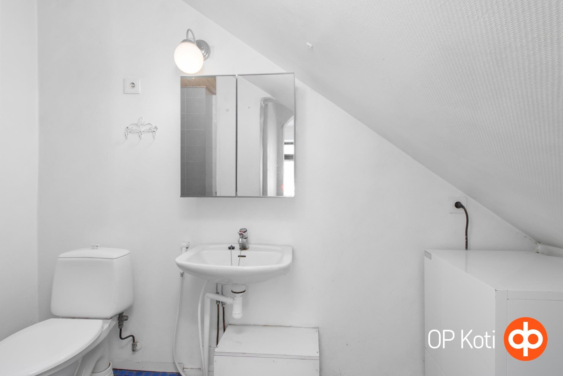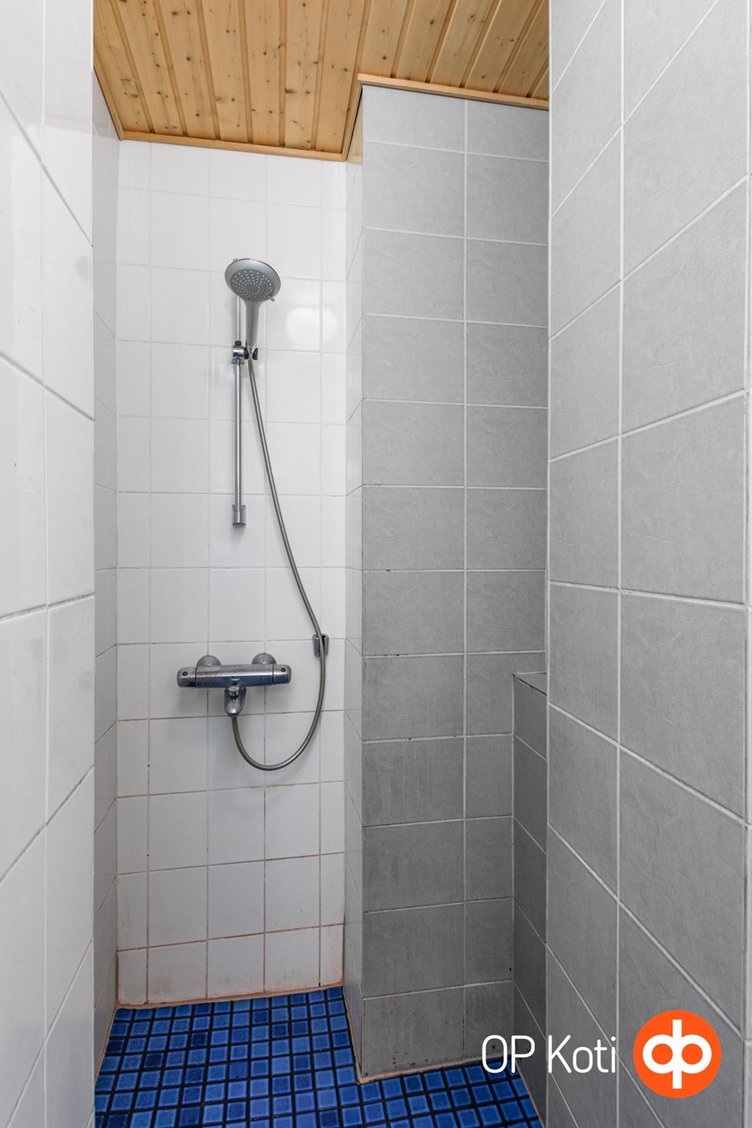 - Kylpyhuone, suihku, peilikaappi, pesukoneliitäntä, lattialämmitys, kiinteät valaisimet.