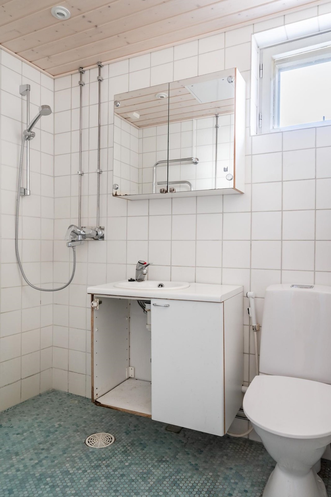 - Suihku, peilikaappi, allaskaappi, kiinteät valaisimet.