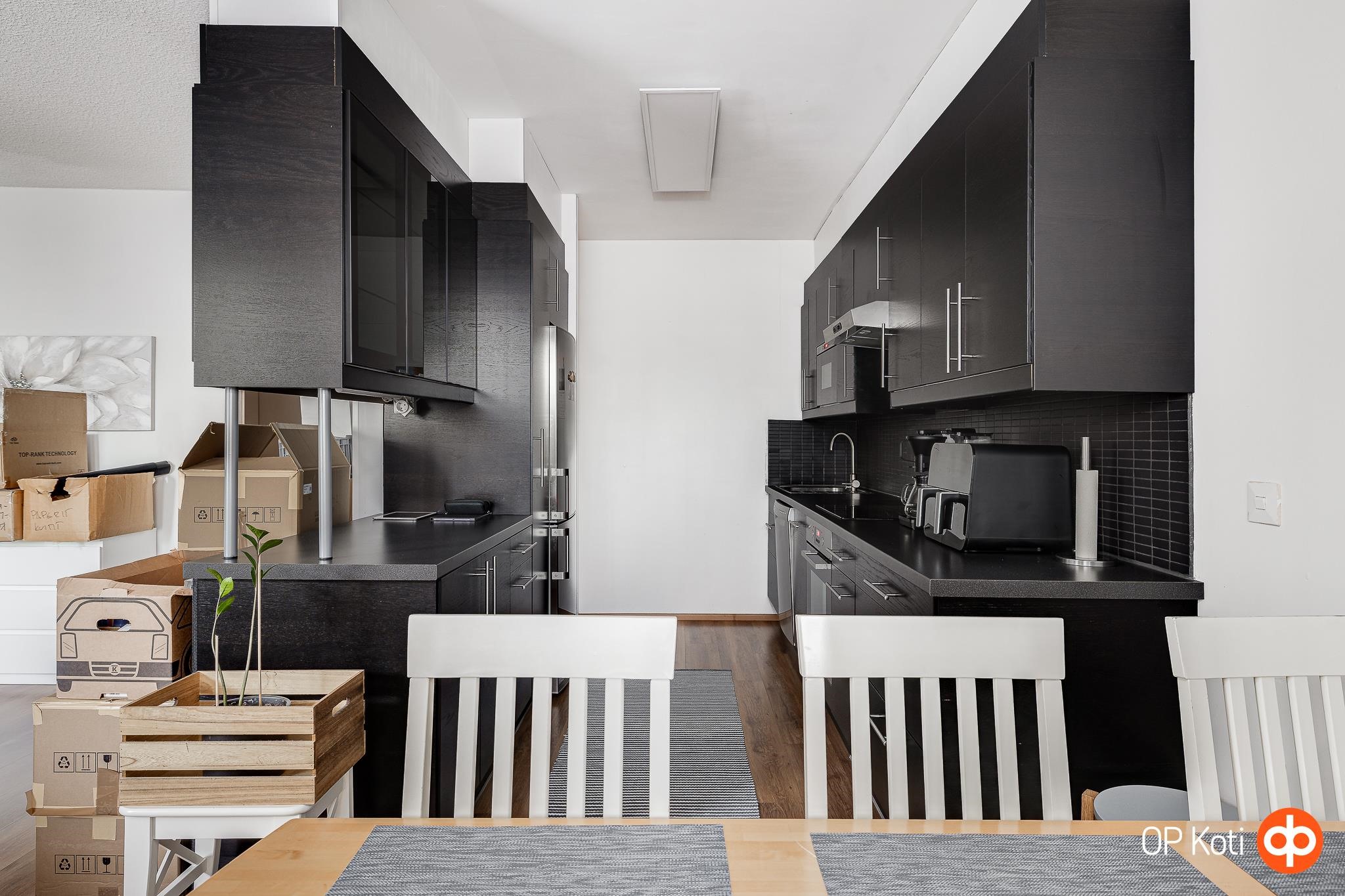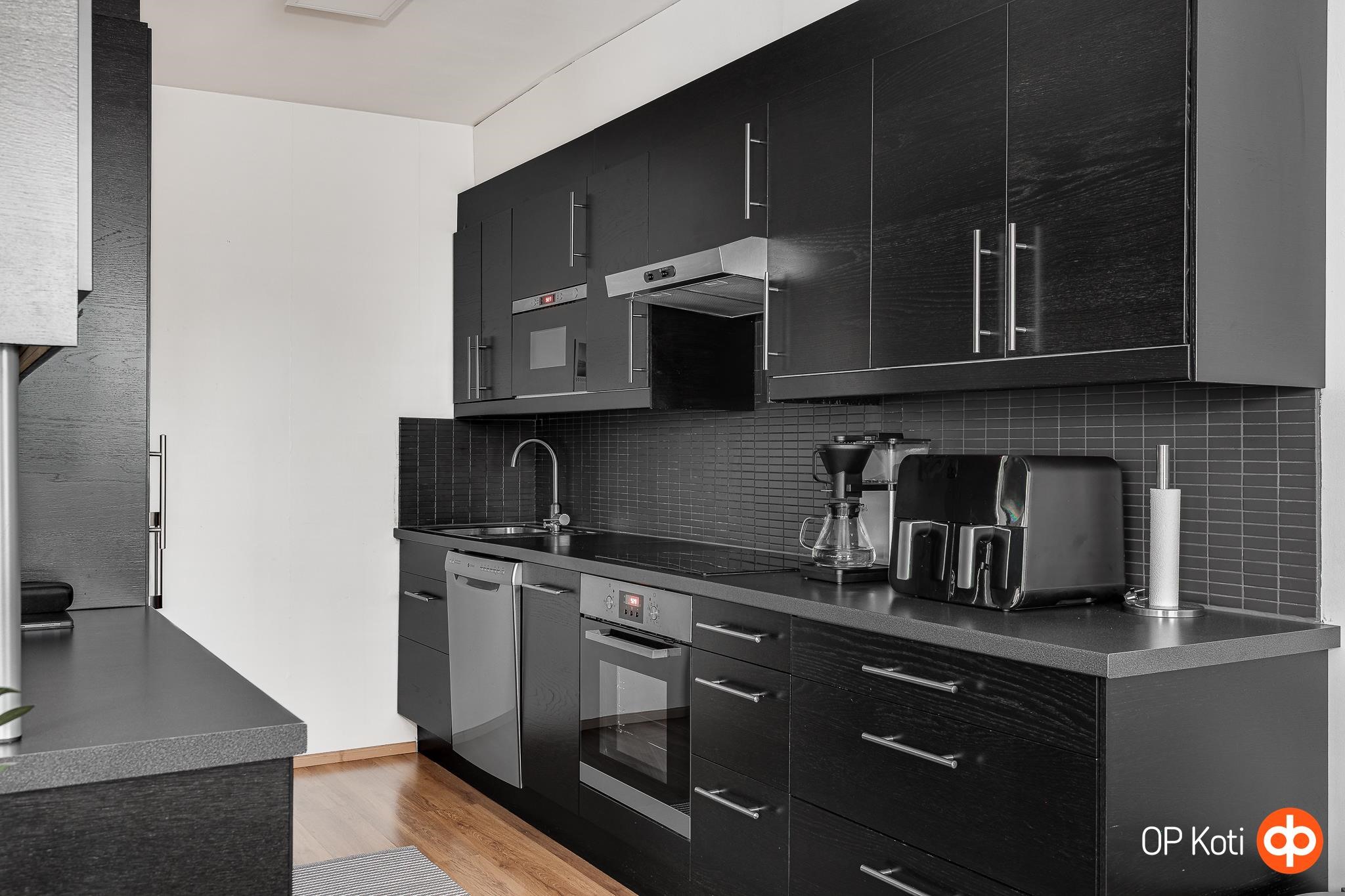 - Jääkaappipakastin, erillisuuni kiertoilmauuni, liesitaso induktio, liesituuletin, mikroaaltouuni, astianpesukone, kaapistot, kiinteät valaisimet.