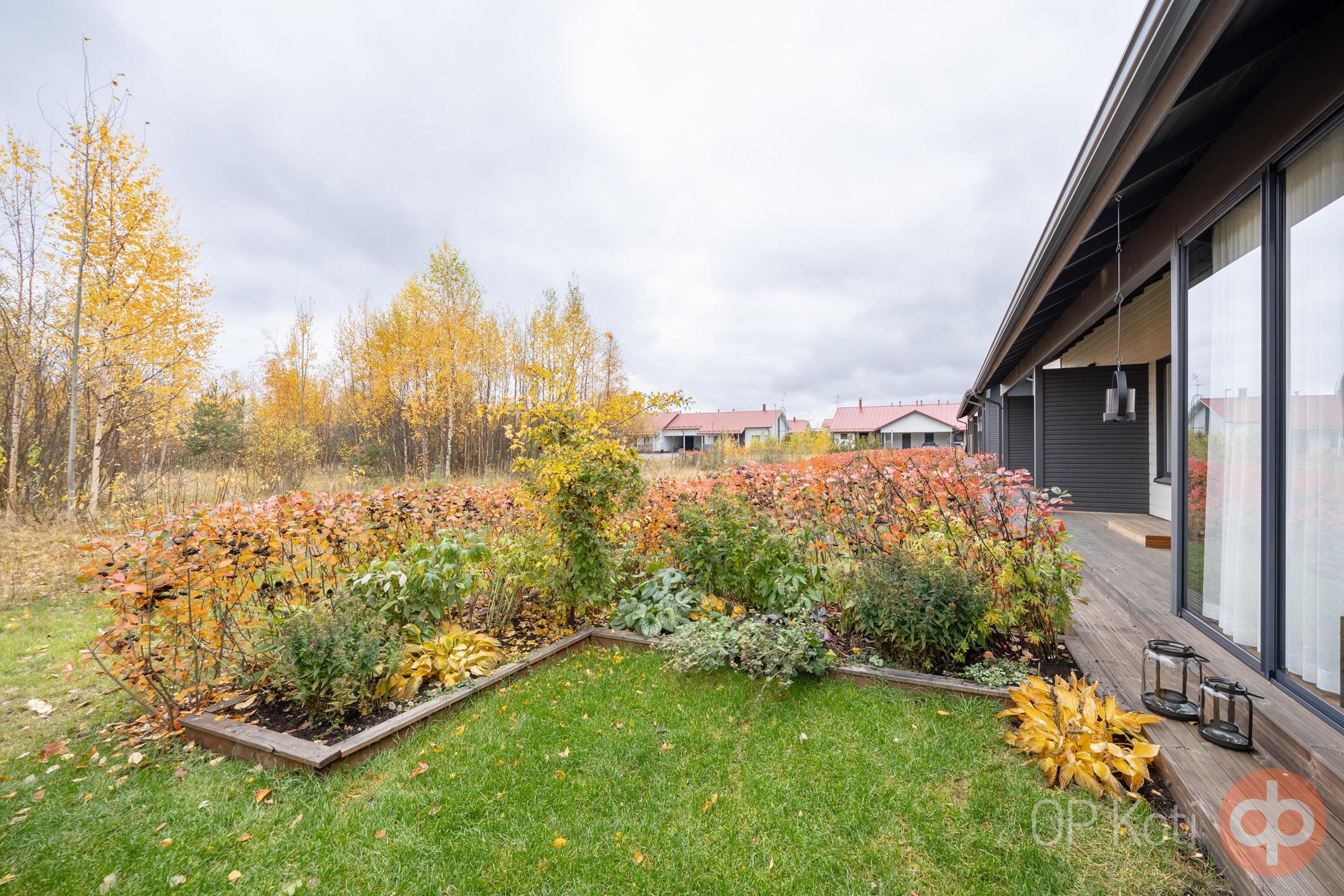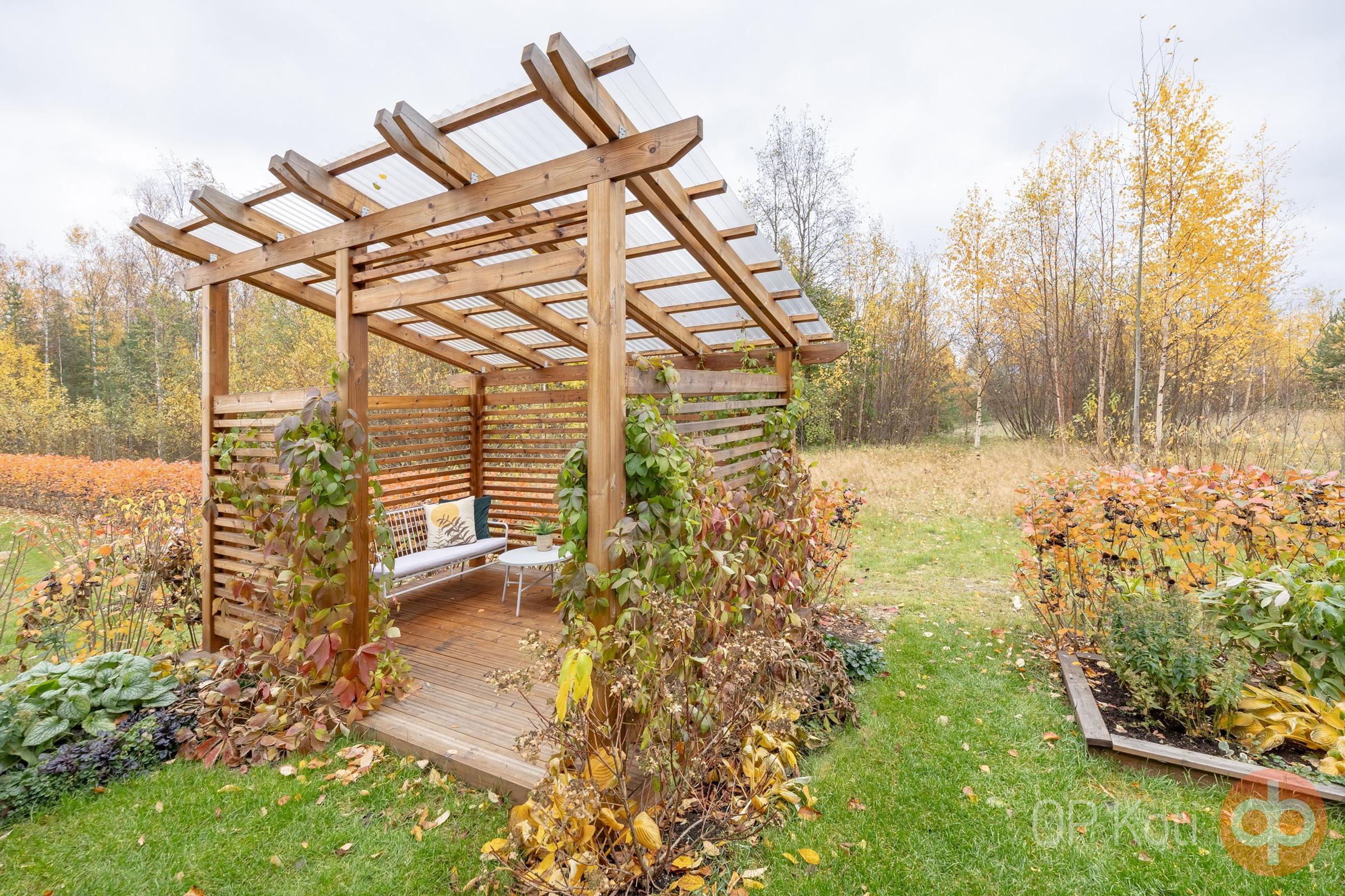 Asunnon yhteydessä oleva oma ulkovarasto tarjoaa kätevän säilytystilan, ja autokatos suojaa autosi sääolosuhteilta. Lasitettu terassi toimii erinomaisena lisähuoneena, jossa voit nauttia vuoden ympäri kauniista maisemista ja valokatteellisen pergolan alla voit viettää rentouttavia hetkiä ulkoilmasta nauttien ja upeita perennoita ihastellen.