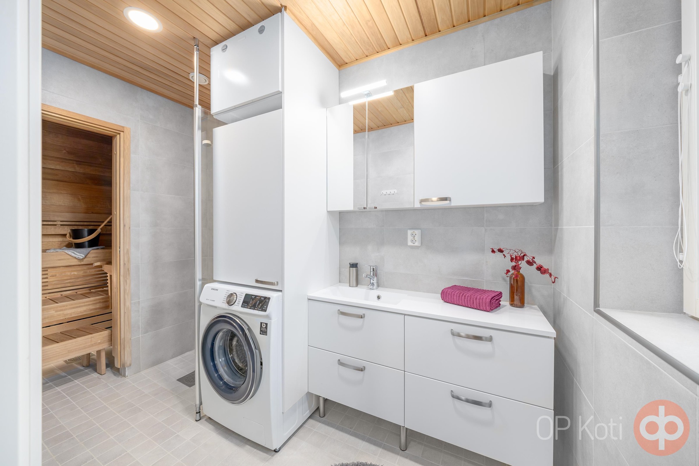 - Sauna, sähkökiuas, kylpyhuone, erillinen wc, suihku, suihkuseinä, peilikaappi, allaskaappi, pesukoneliitäntä, lattialämmitys, kiinteät valaisimet.