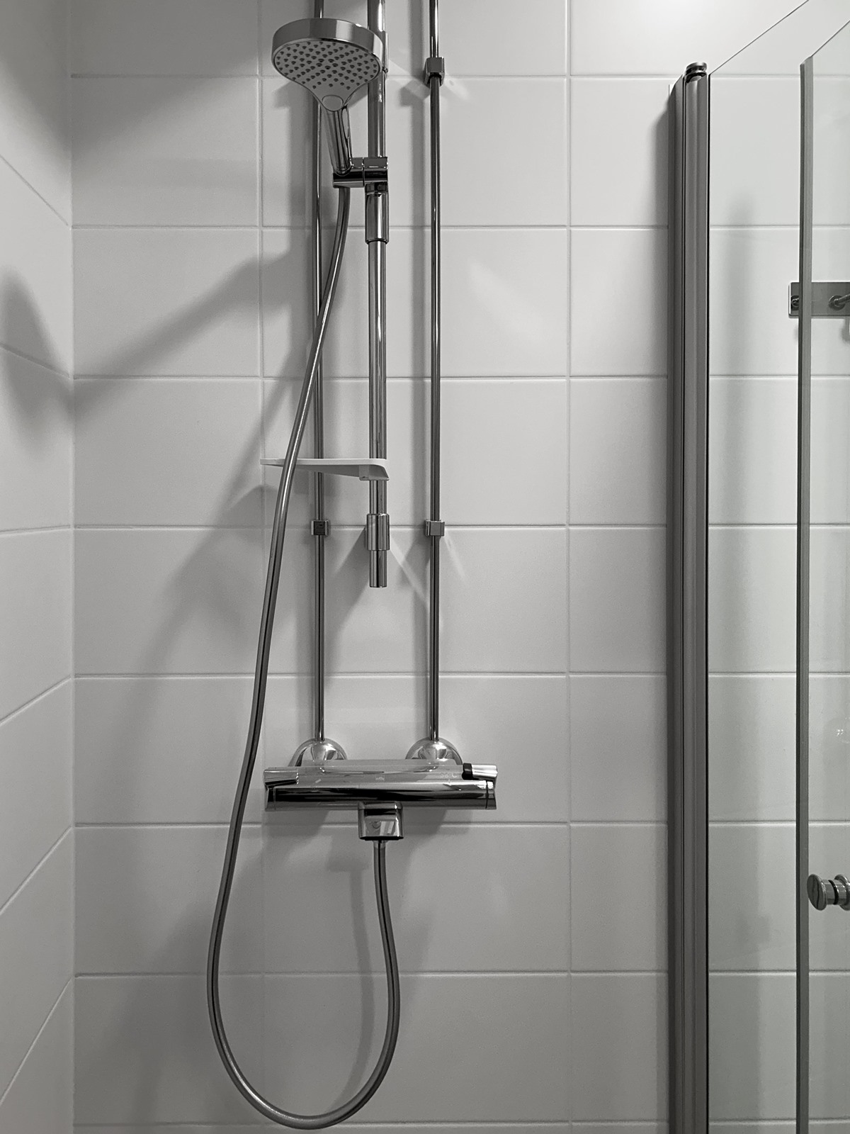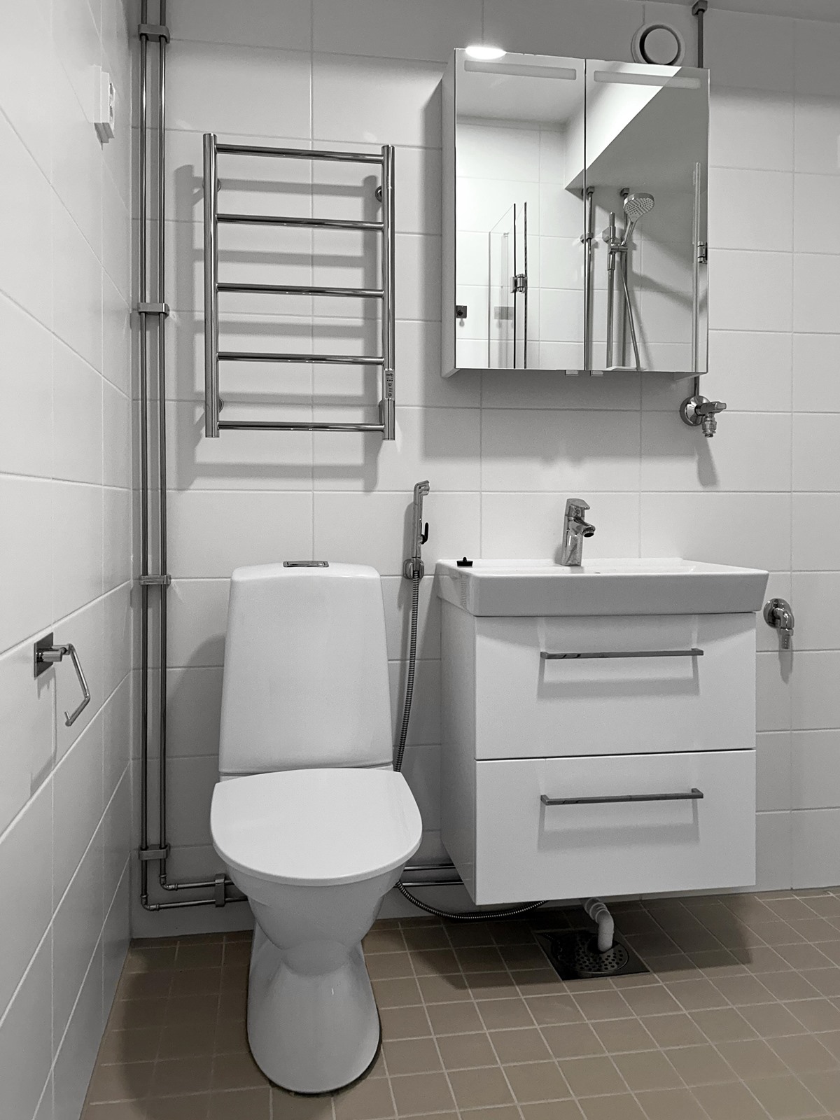 - Kylpyhuone, suihkuseinä, peilikaappi, allaskaappi, lattialämmitys, kiinteät valaisimet, pyyhekuivain, bide suihku.