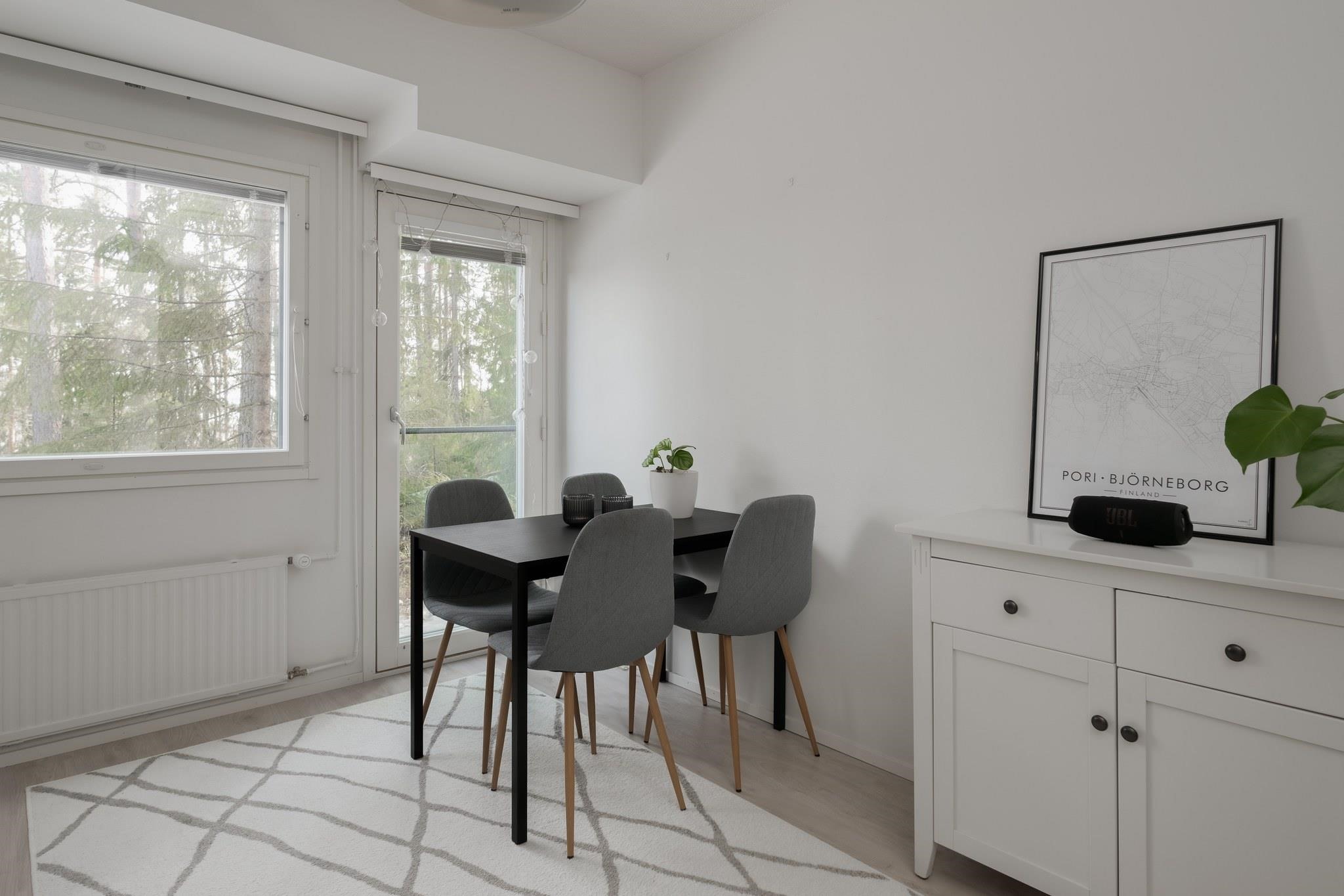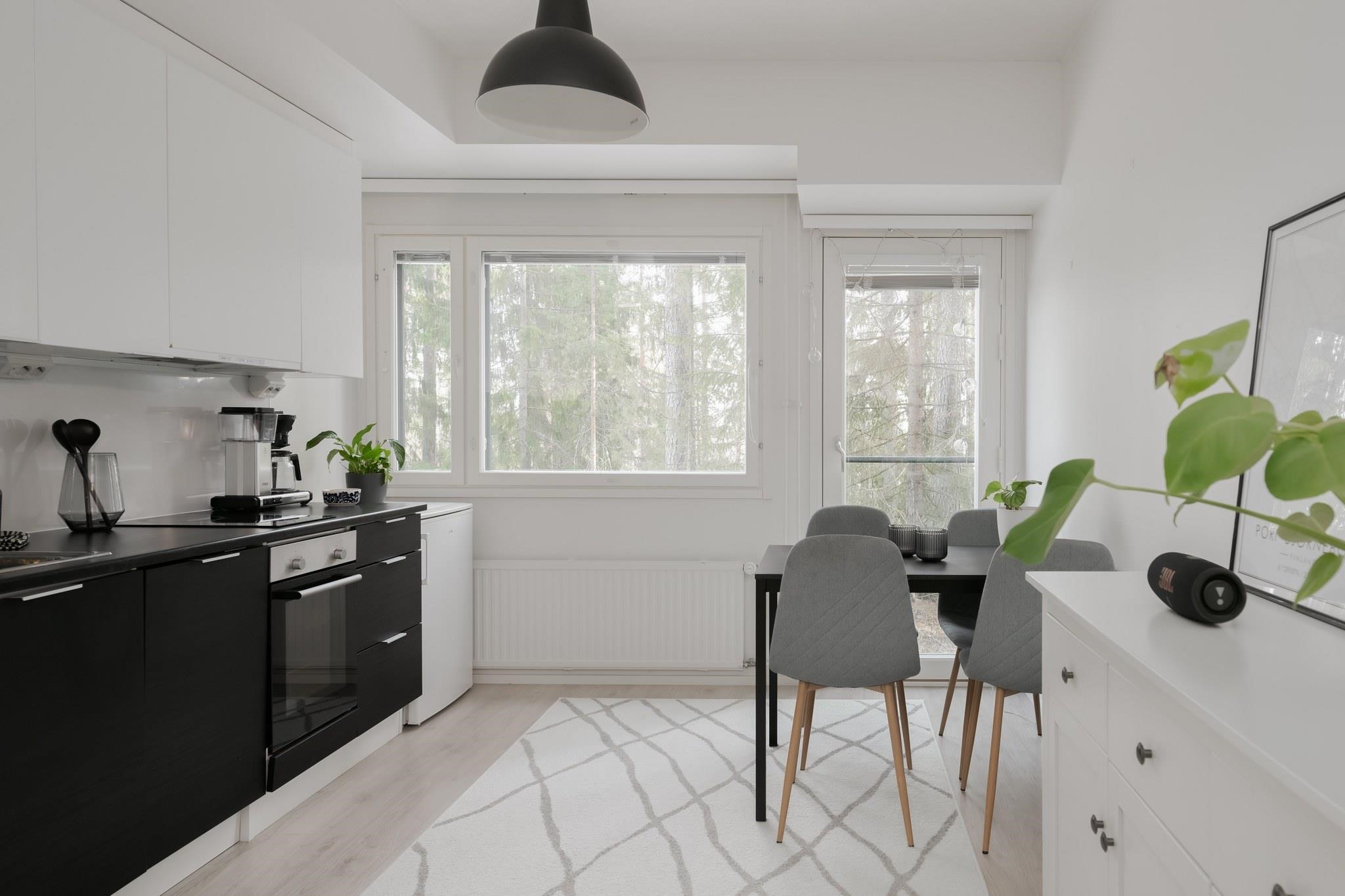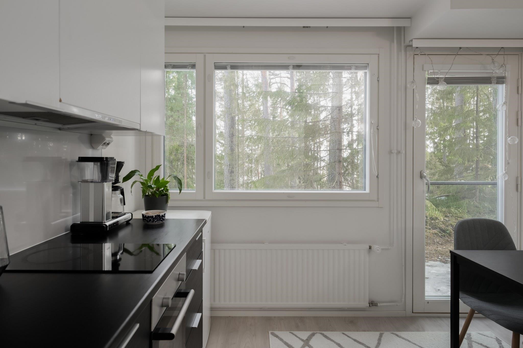 Heti vapaana siisti ja tehokkaasti suunniteltu koti, jossa on jaettu säilytyskaapein erillinen makuuhuonetila, toisella puolella asuntoa sijaitsee keittiö, joka on varusteltu jenkkikaapilla, astianpesukoneella ja hyvällä määrällä kaappitilaa. Keittiön yhteyteen mahtuu hyvin ruokailuryhmä ja tilassa on ranskalainen parveke. Asunnon lattialämmityksellä varustettu kylpyhuone on vaalea ja moderni ja siitä löytyy paikka pyykinpesukoneelle. Asunto sijaitsee talon ensimmäisessä asuinkerroksessa rauhallisen takapihan puolella, sen ikkunat ovat kohti metsämaisemaa. Tervetuloa tutustumaan! Kohde on myös myynnissä OP Kodilla.