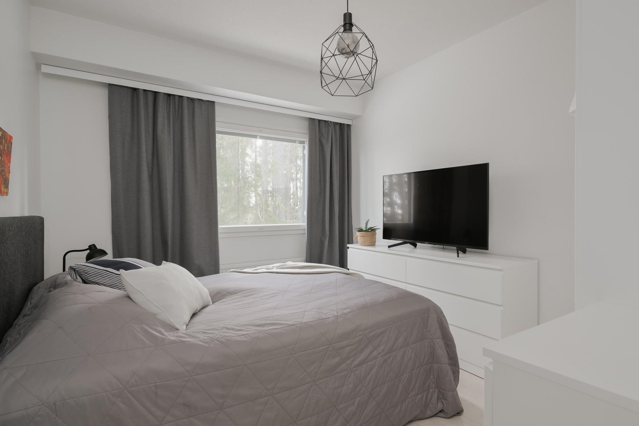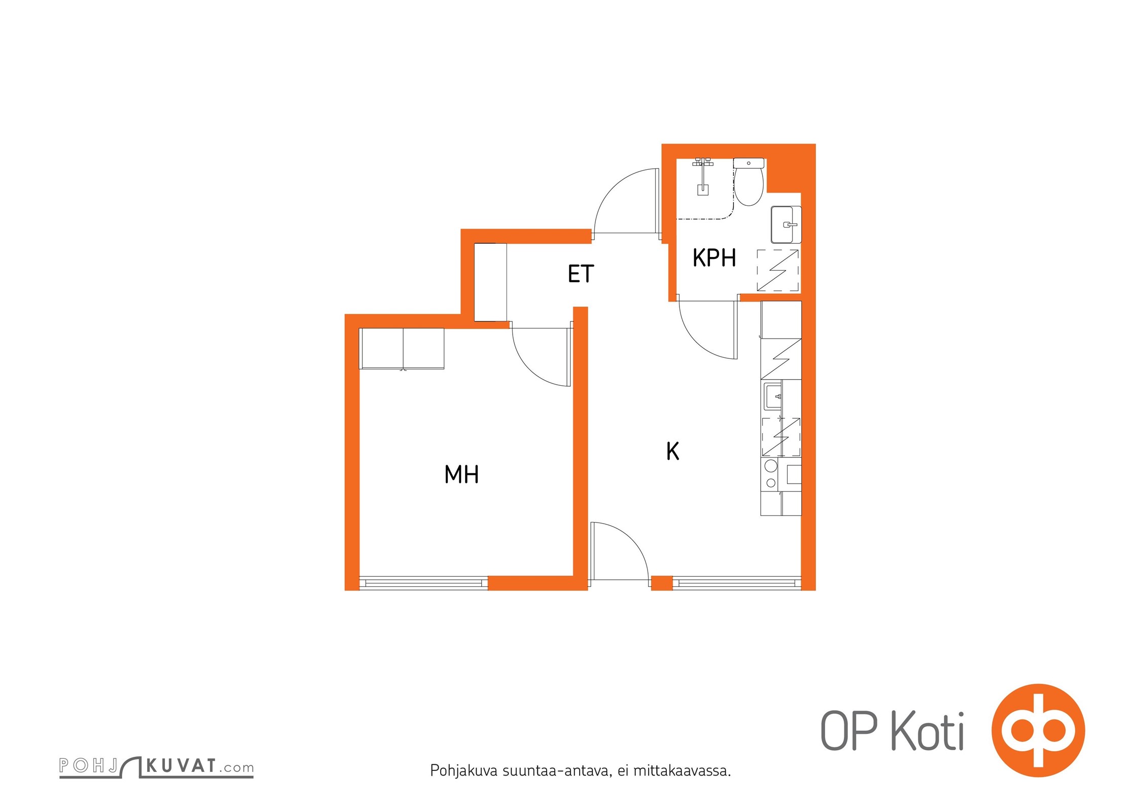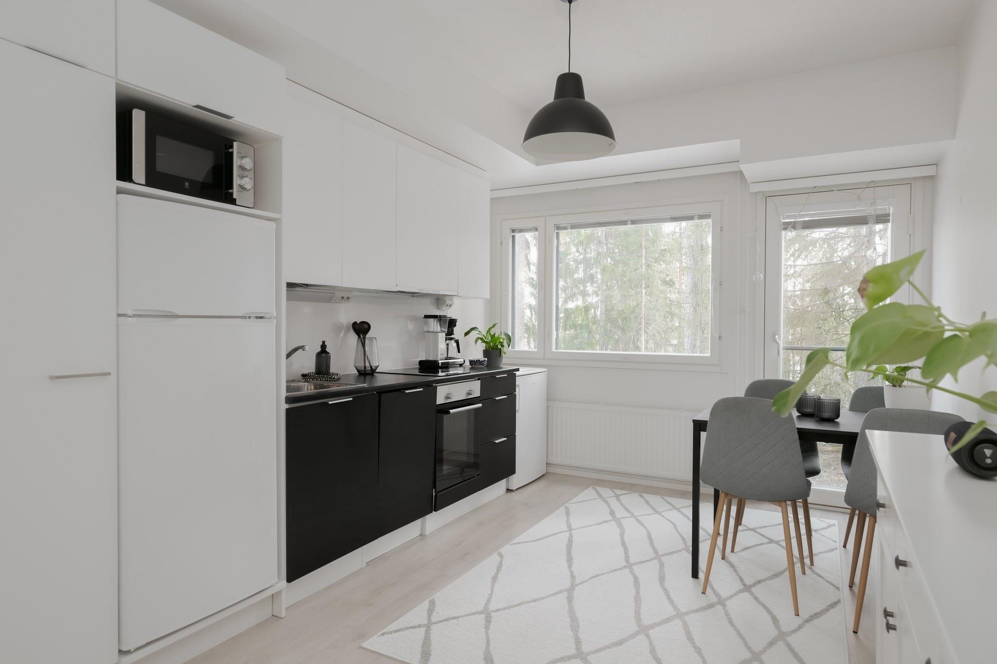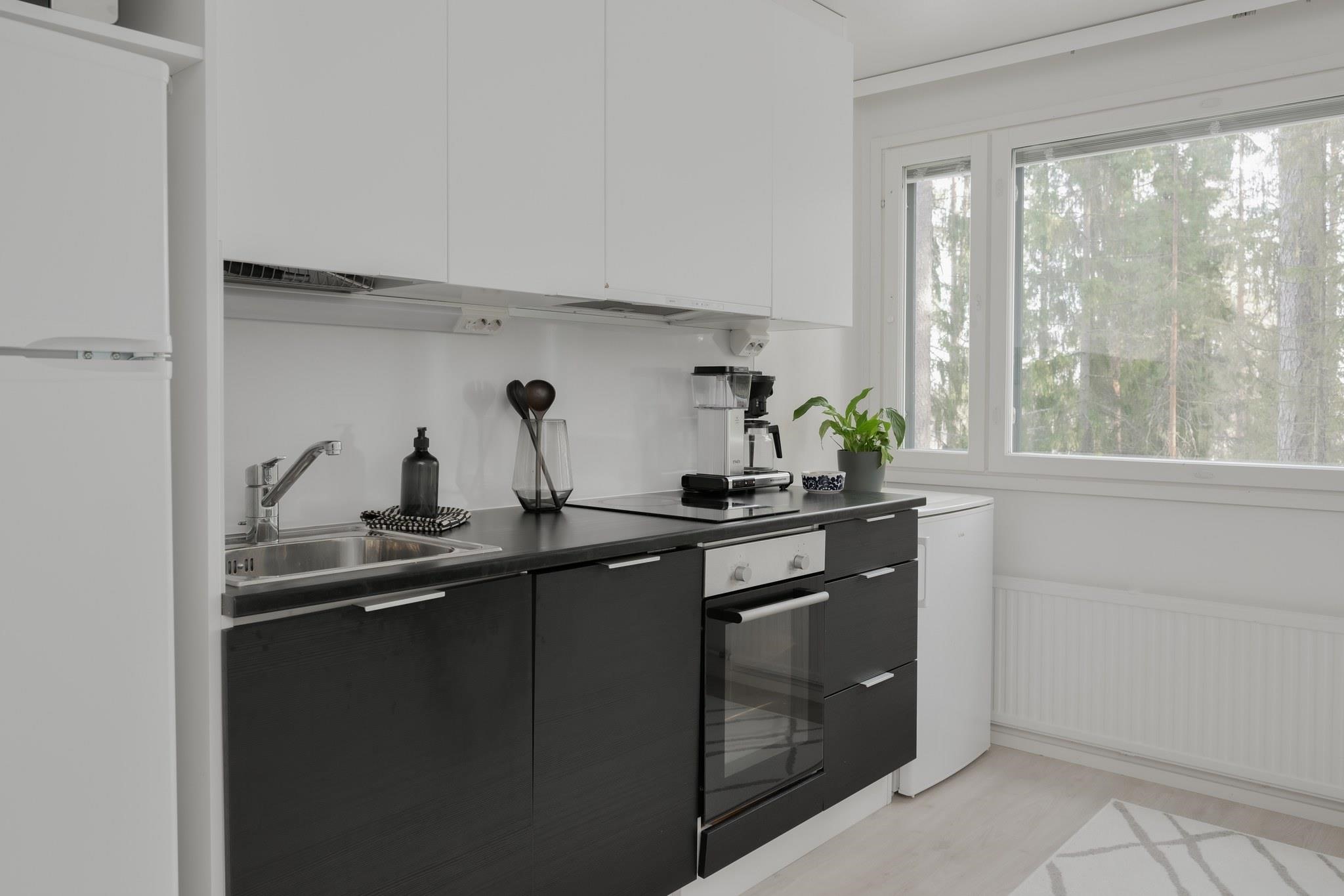 Heti vapaana siisti ja tehokkaasti suunniteltu koti, jossa on jaettu säilytyskaapein erillinen makuuhuonetila, toisella puolella asuntoa sijaitsee keittiö, joka on varusteltu jenkkikaapilla, astianpesukoneella ja hyvällä määrällä kaappitilaa. Keittiön yhteyteen mahtuu hyvin ruokailuryhmä ja tilassa on ranskalainen parveke. Asunnon lattialämmityksellä varustettu kylpyhuone on vaalea ja moderni ja siitä löytyy paikka pyykinpesukoneelle. Asunto sijaitsee talon ensimmäisessä asuinkerroksessa rauhallisen takapihan puolella, sen ikkunat ovat kohti metsämaisemaa. Tervetuloa tutustumaan! Kohde on myös myynnissä OP Kodilla.