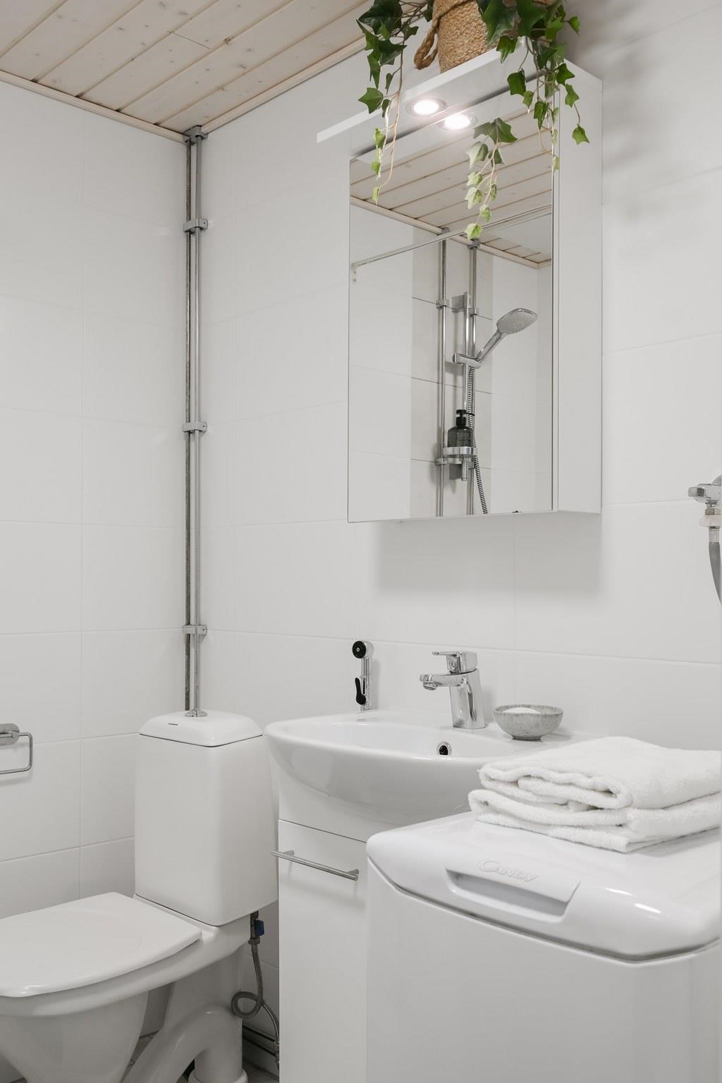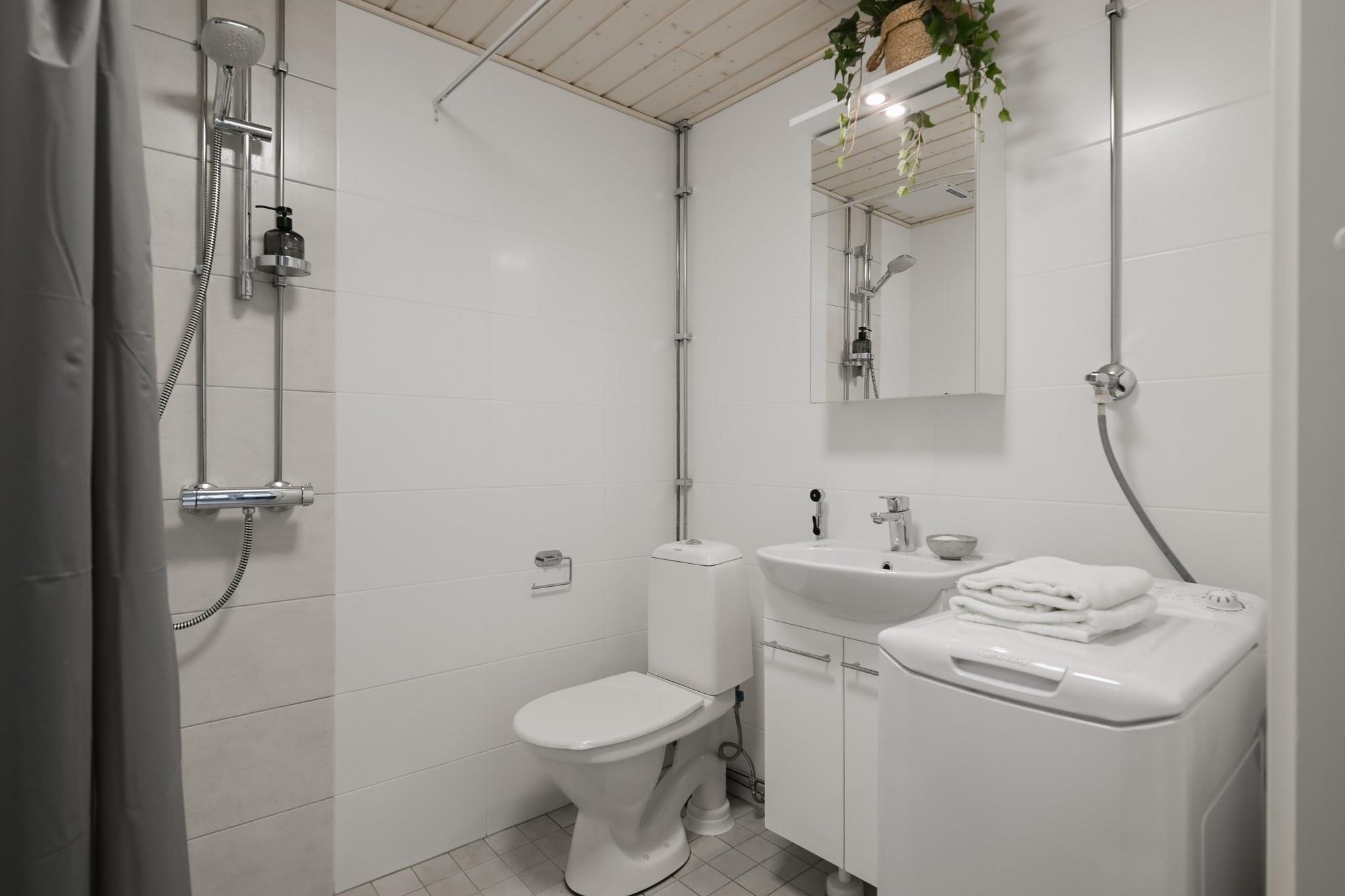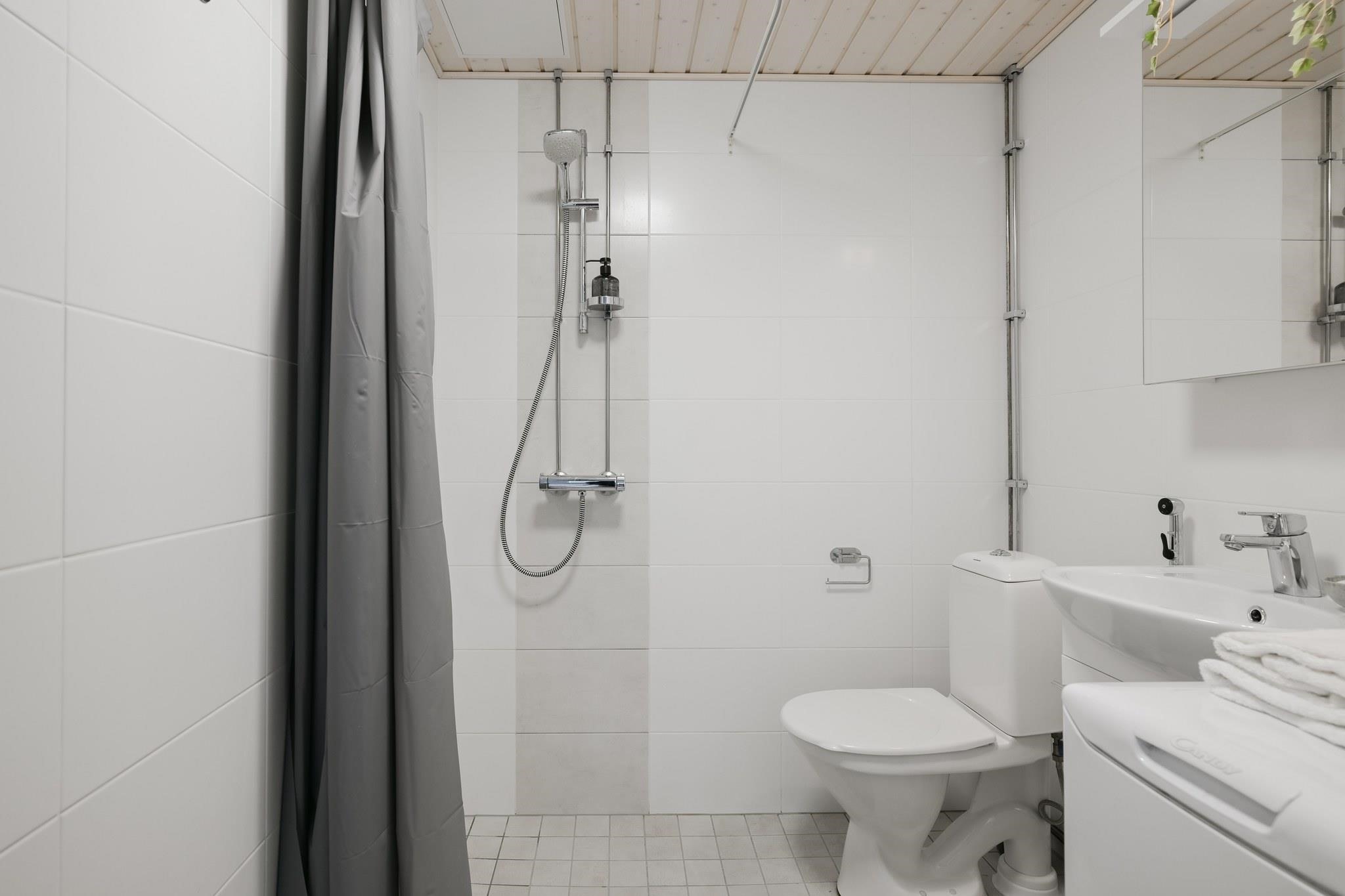 - Kylpyhuone, suihku, peilikaappi, allaskaappi, pesukoneliitäntä, lattialämmitys, kiinteät valaisimet.