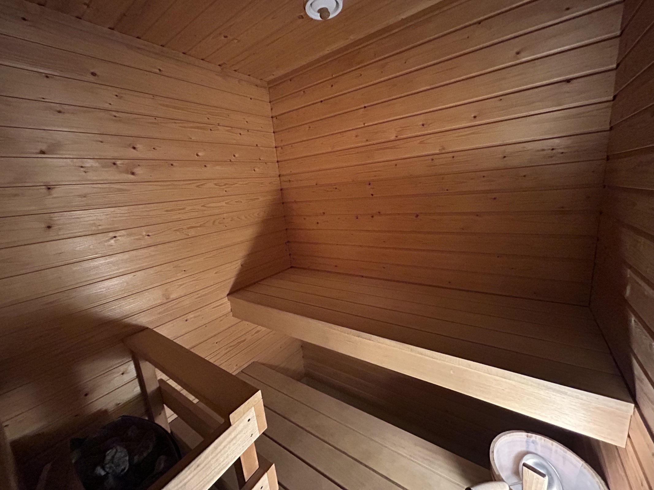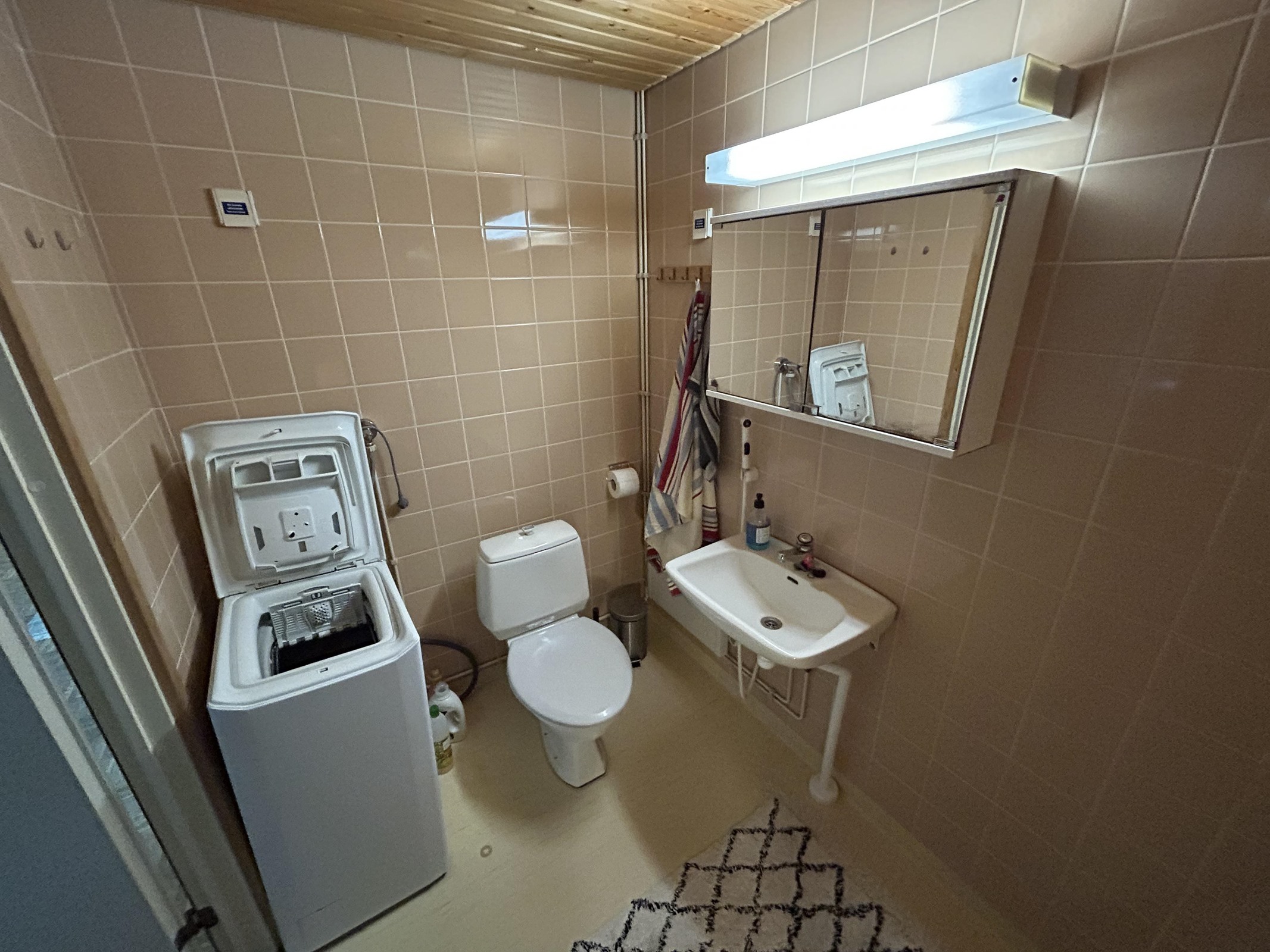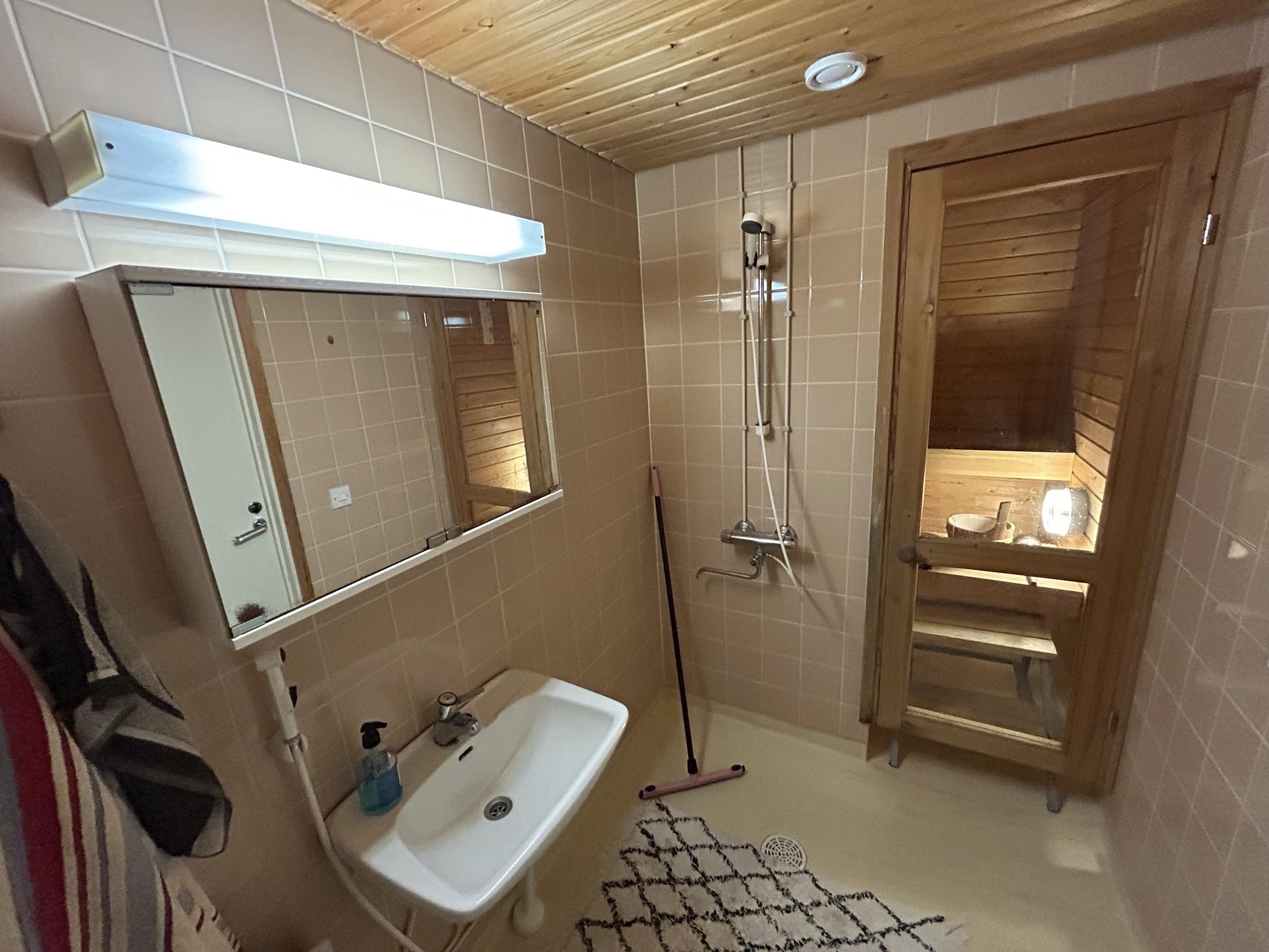 - Sauna, sähkökiuas, kylpyhuone, suihku, peilikaappi, pesukoneliitäntä, kiinteät valaisimet.
