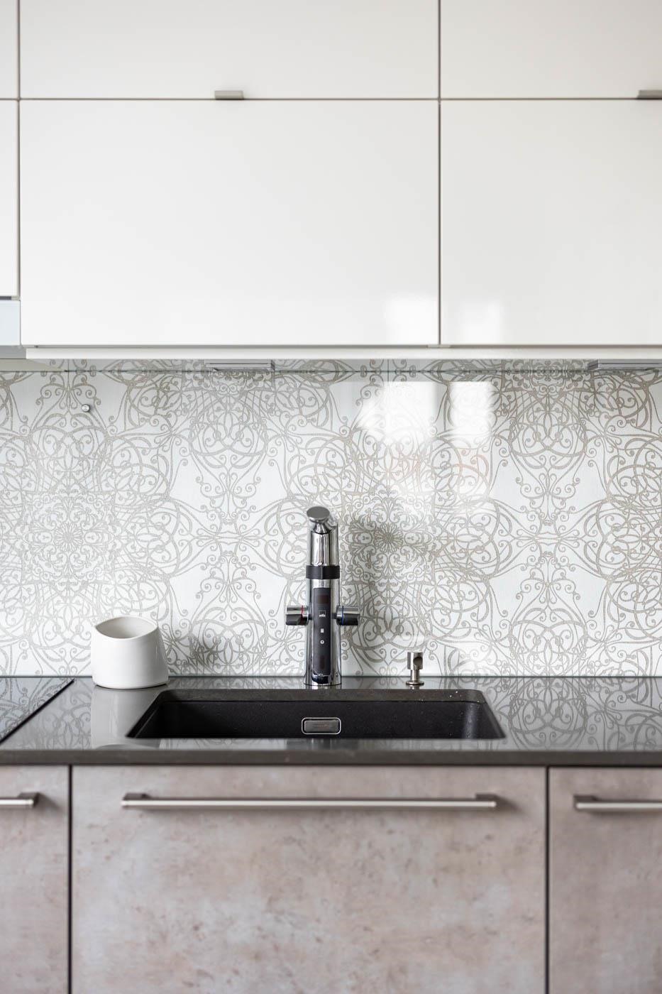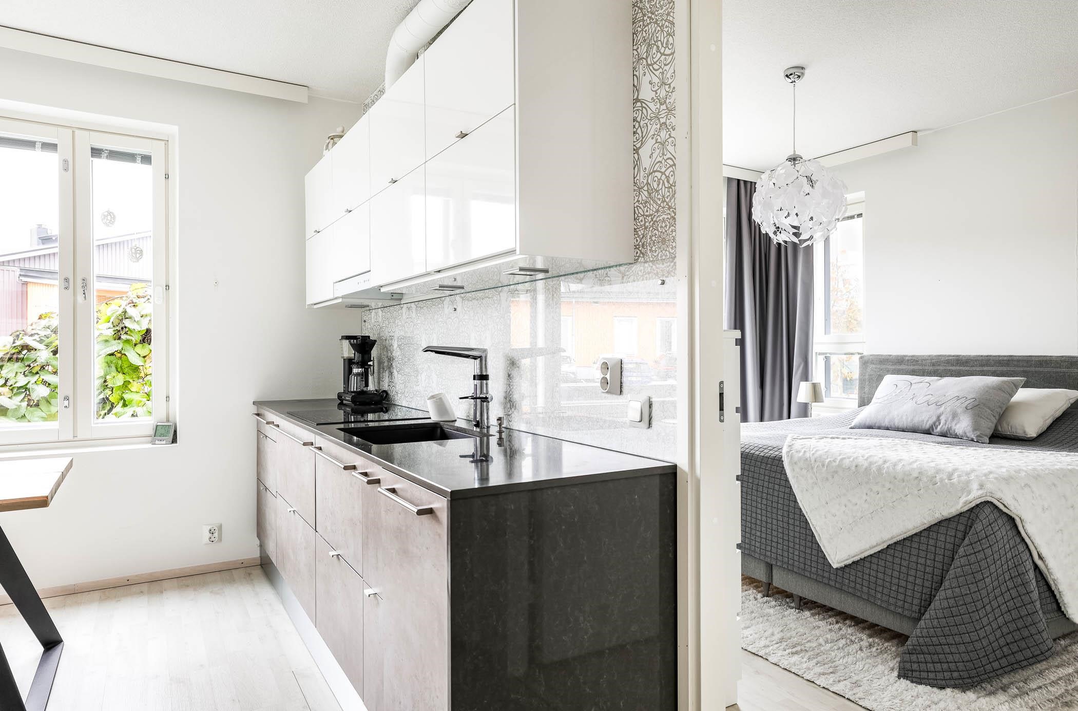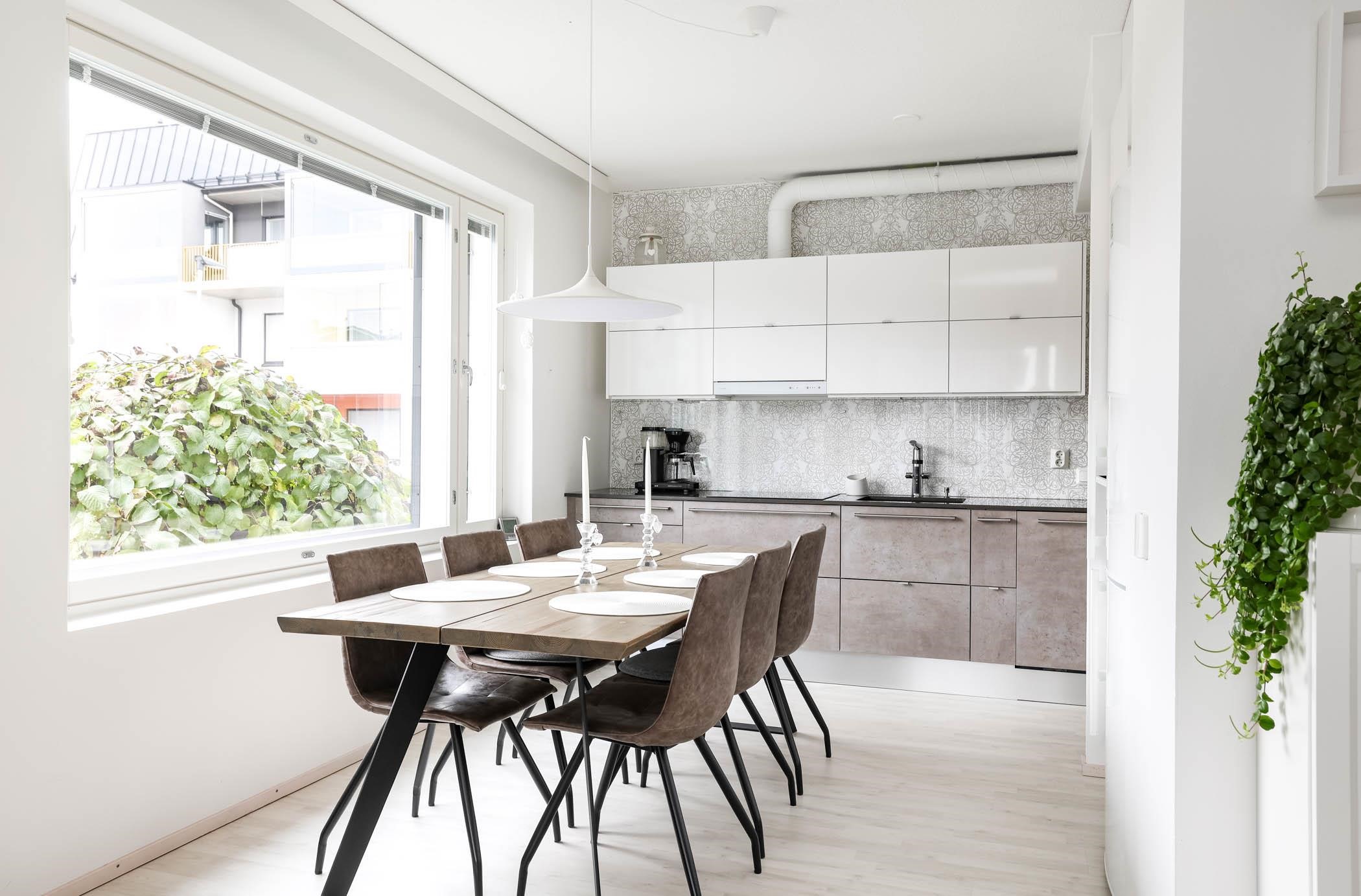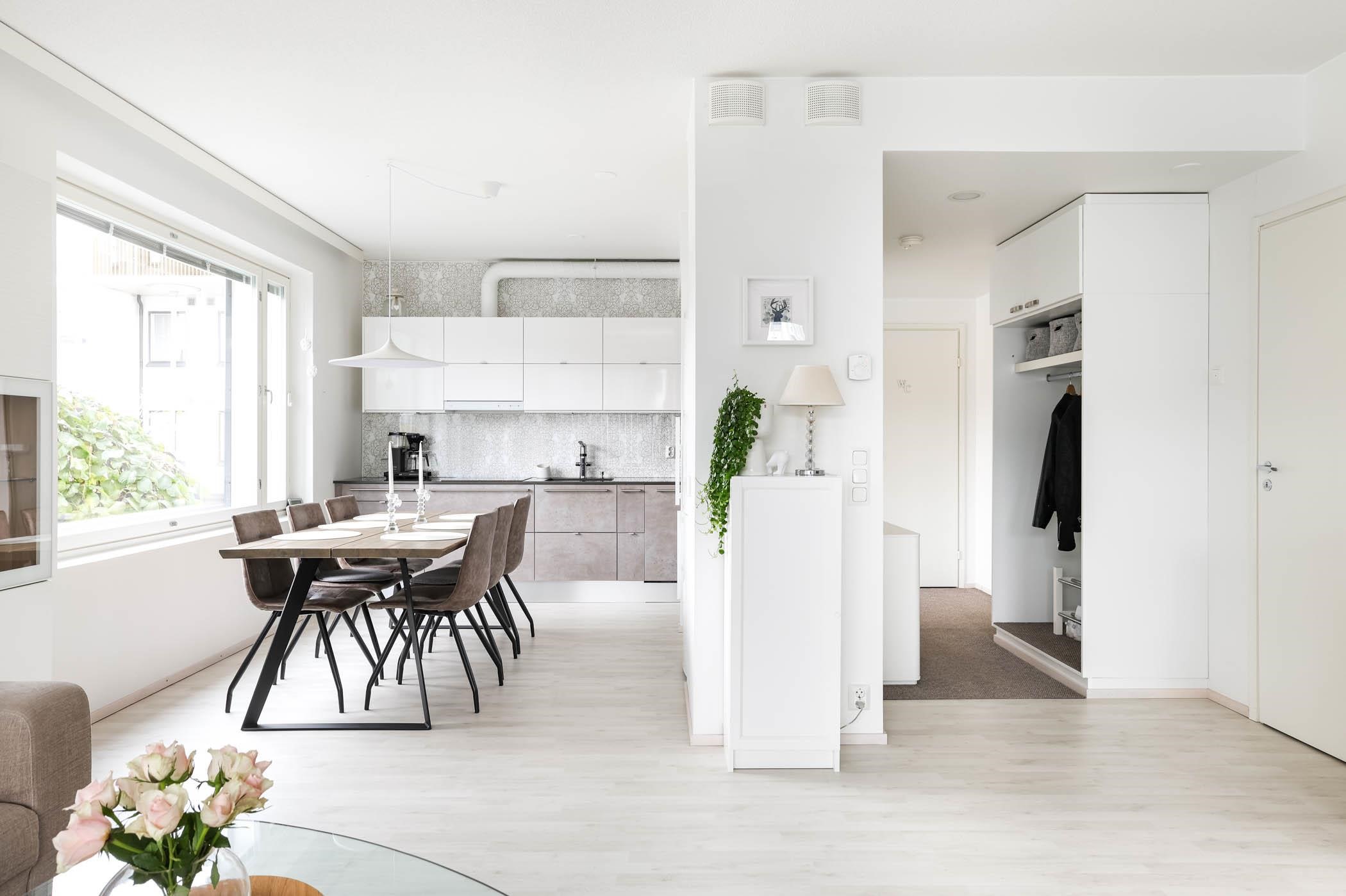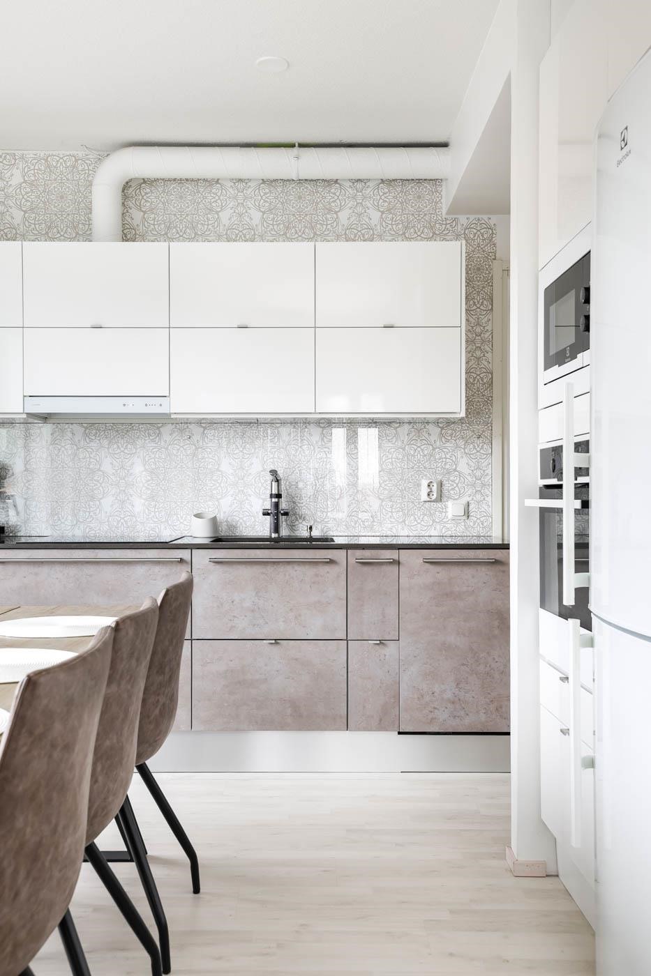 - Kauniin vaaleassa keittiötilassa on kodin sydän. Keittiössä on jääkaappipakastin, (integroitu, korotettu) erillisuuni, induktio liesitaso, liesituuletin, (integroitu) mikroaaltouuni, (integroitu) astianpesukone. Keittiössä on hyvin säilytystilaa ja työtasoja. Välitilassa on välitilalasi.