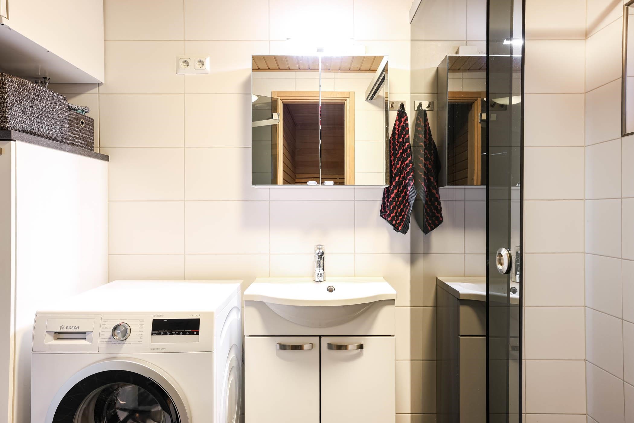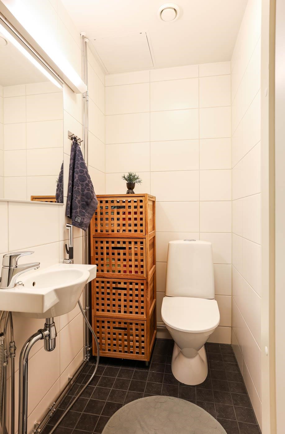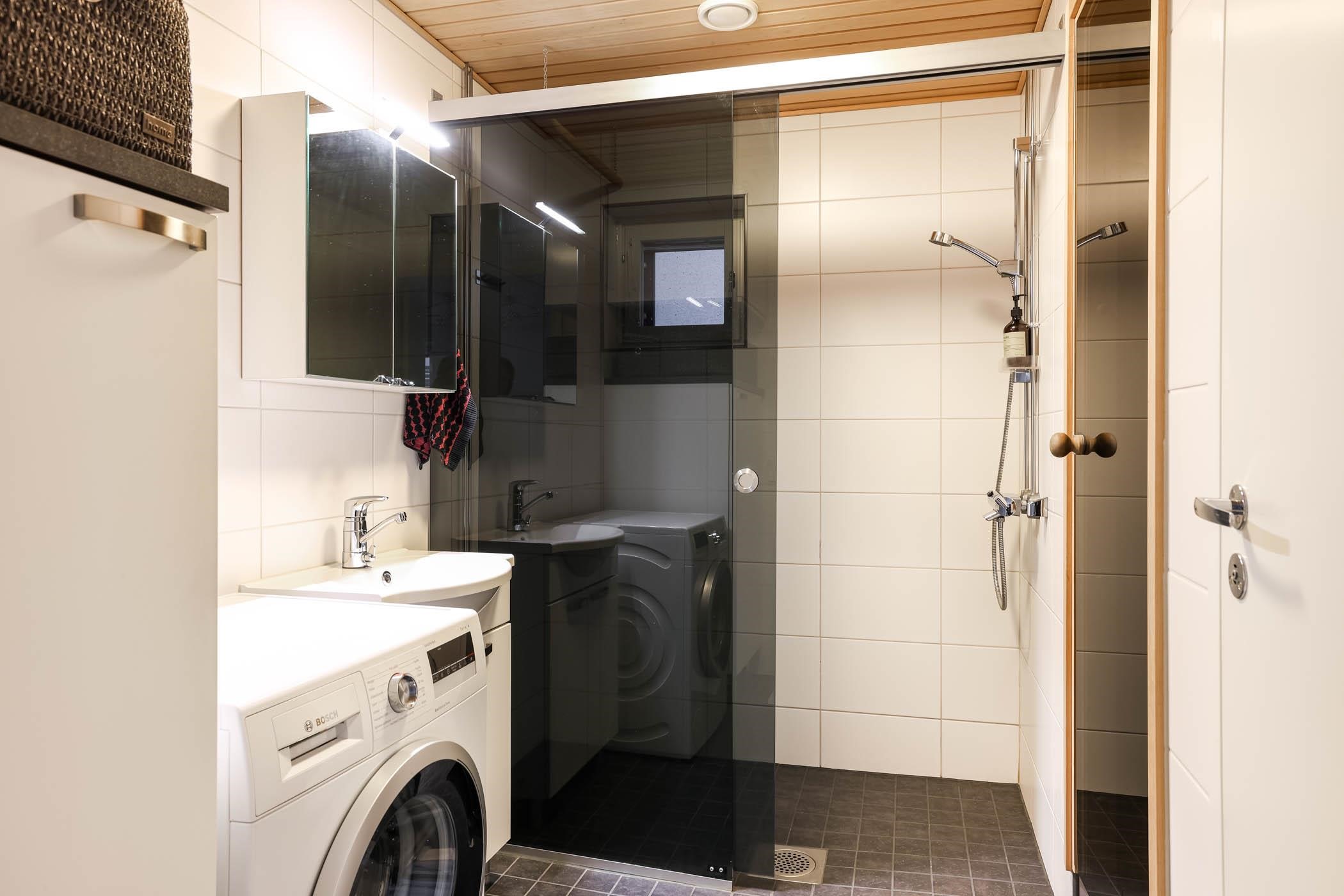 - Ikkunallisessa saunassa on kuituvalot ja sähkökiuas. Tilavassa kylpyhuoneessa on ikkuna, suihku ja suihkuseinä lasiliukuovella, pesukoneliitäntä (pesutornivaraus) ja pyykkikaappi. Kylpyhuoneen yhteydessä on erillisessa wc:ssa on peili ja pesuallas. Sisääntulon yhteydessä olevassa wc:ssa on peili- ja allaskaappi. Koko huoneistossa on vesikiertoinen lattialämmitys.