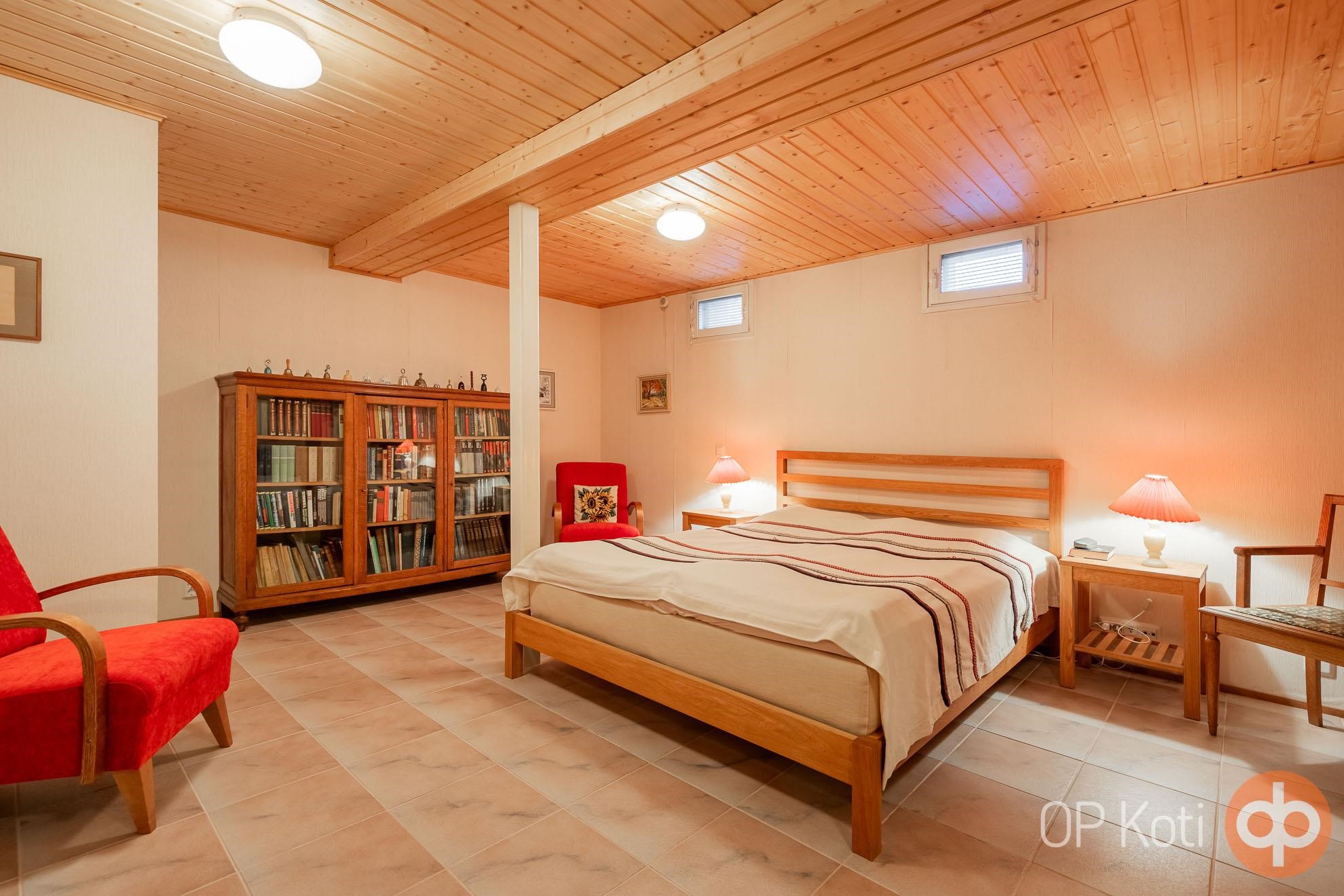 Keittiö: lattia muovimatto, seinät maalattu. Olohuone: lattia muovimatto, seinät tapetti. Makuuhuone 1: lattia muovimatto, seinät tapetti. Makuuhuone 2: lattia koivulauta 2 mh, seinät tapetoitu. Makuuhuone 3: lattia korkkimatto, seinät tapeitoitu. Kodinhoitohuone: lattia laatta, seinät tapetoitu. Sauna: lattia laatta, seinät paneeli. Kylpyhuone: lattia laatta, seinät kaakeli ja osin paneeli. Eteinen: lattia muovimatto, seinät maalattu. 1 huone kellarikerros: lattia laattaa ja seinät tapetoitu lattialämmitys.