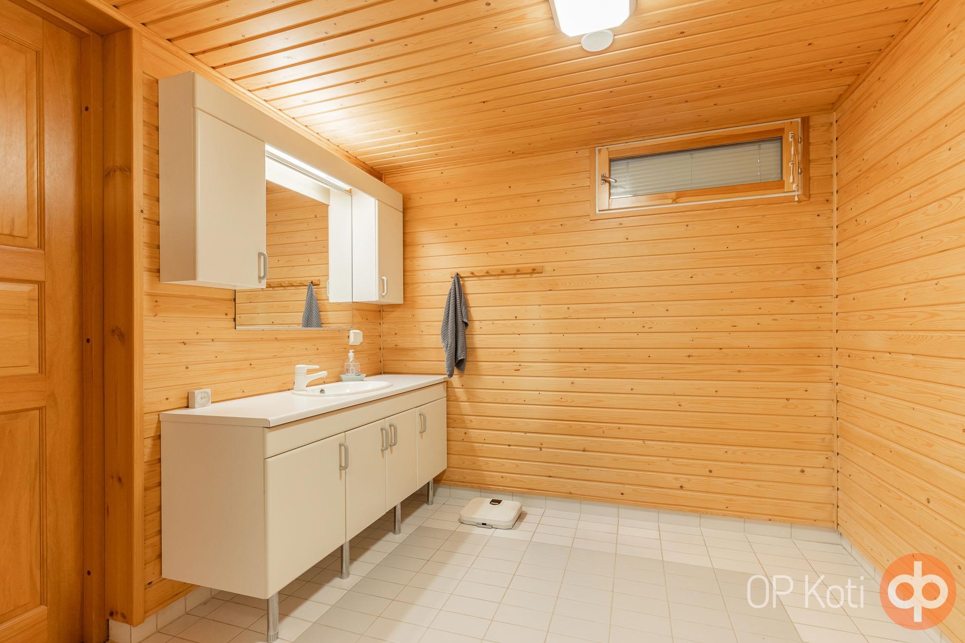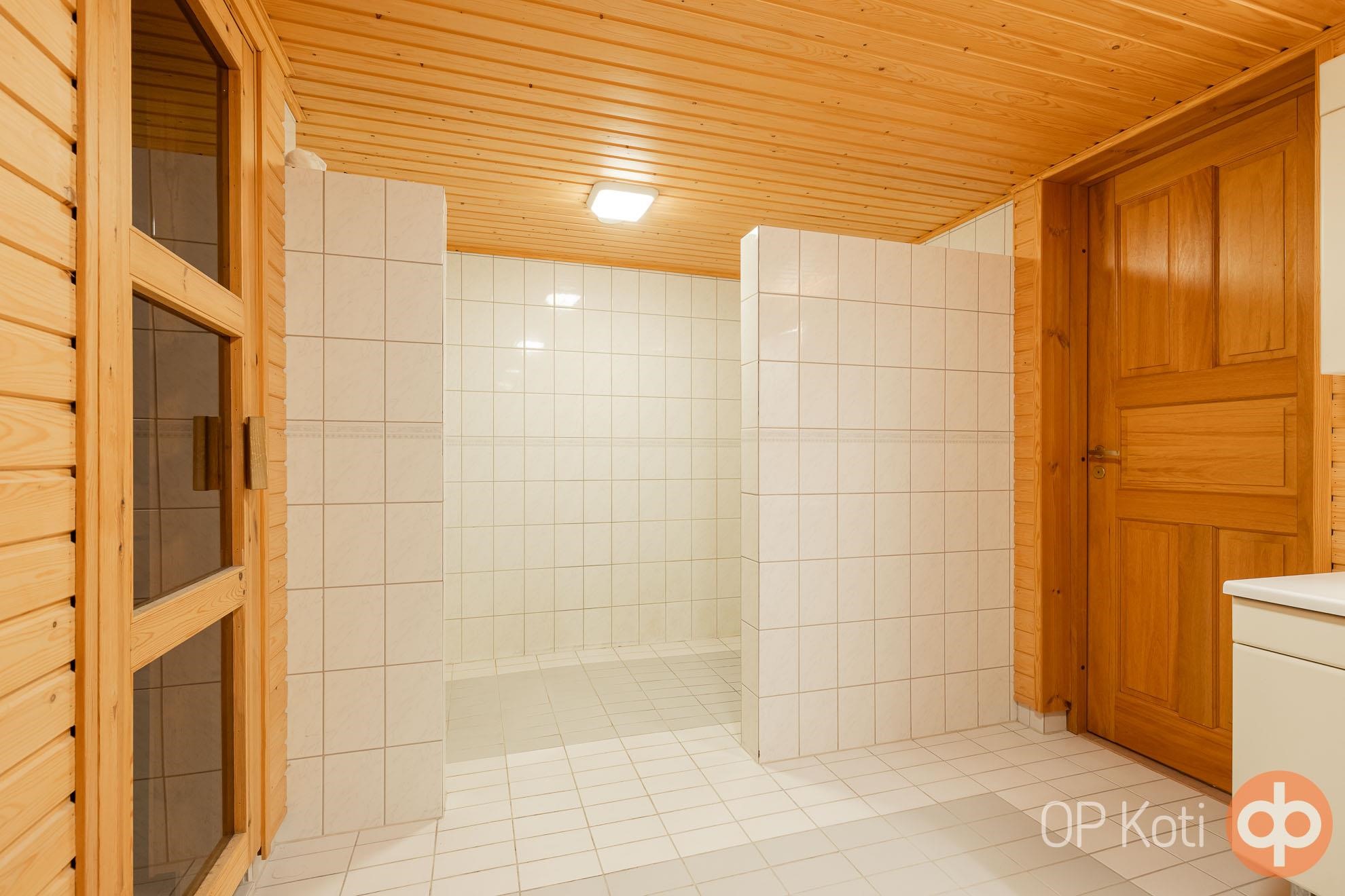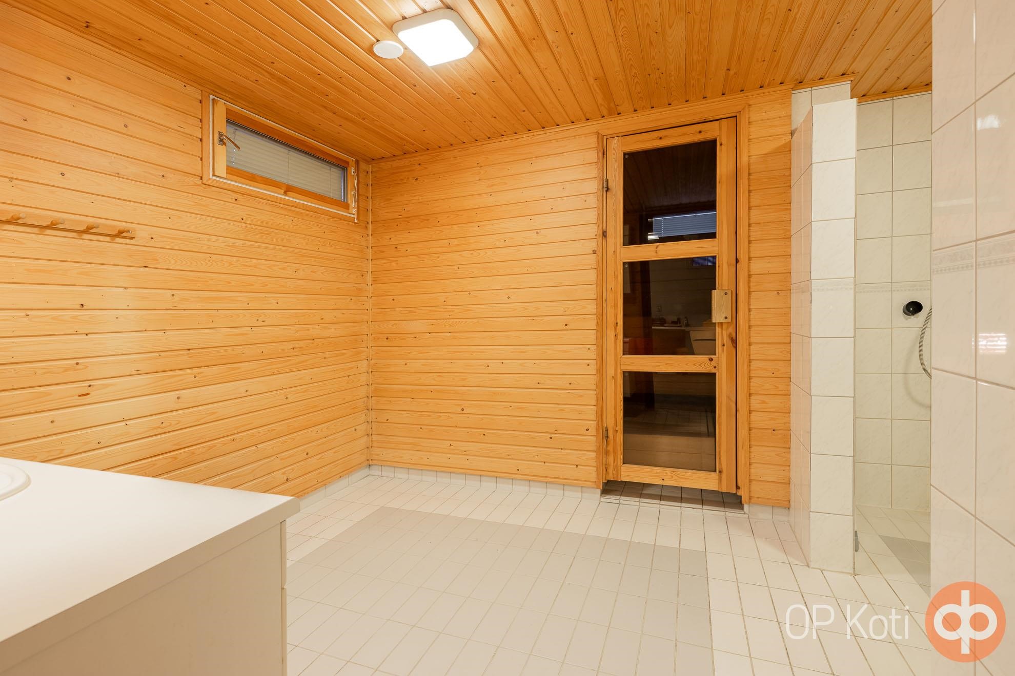 - Sauna, sähkökiuas, kylpyhuone, erillinen wc, suihku 2kpl, peilit, peilikaappi, kaapit, allaskaappi, pesukoneliitäntä, lattialämmitys pesuhuonen ja kodinhoitotila, kiinteät valaisimet.
