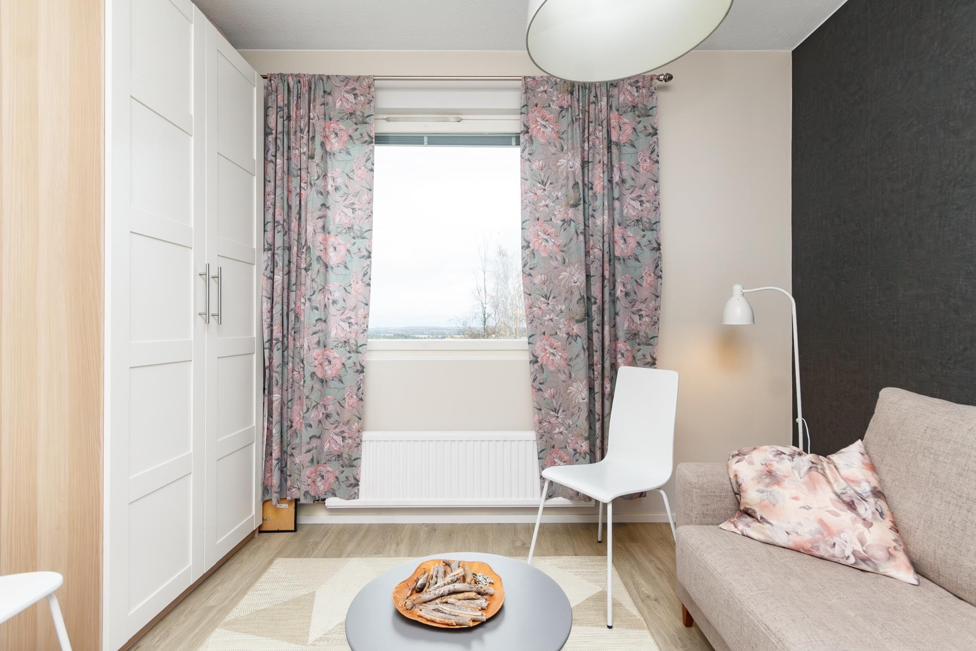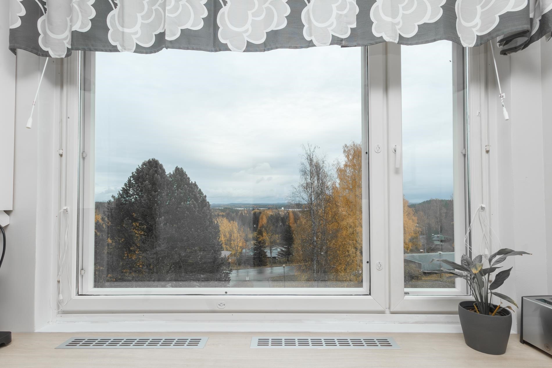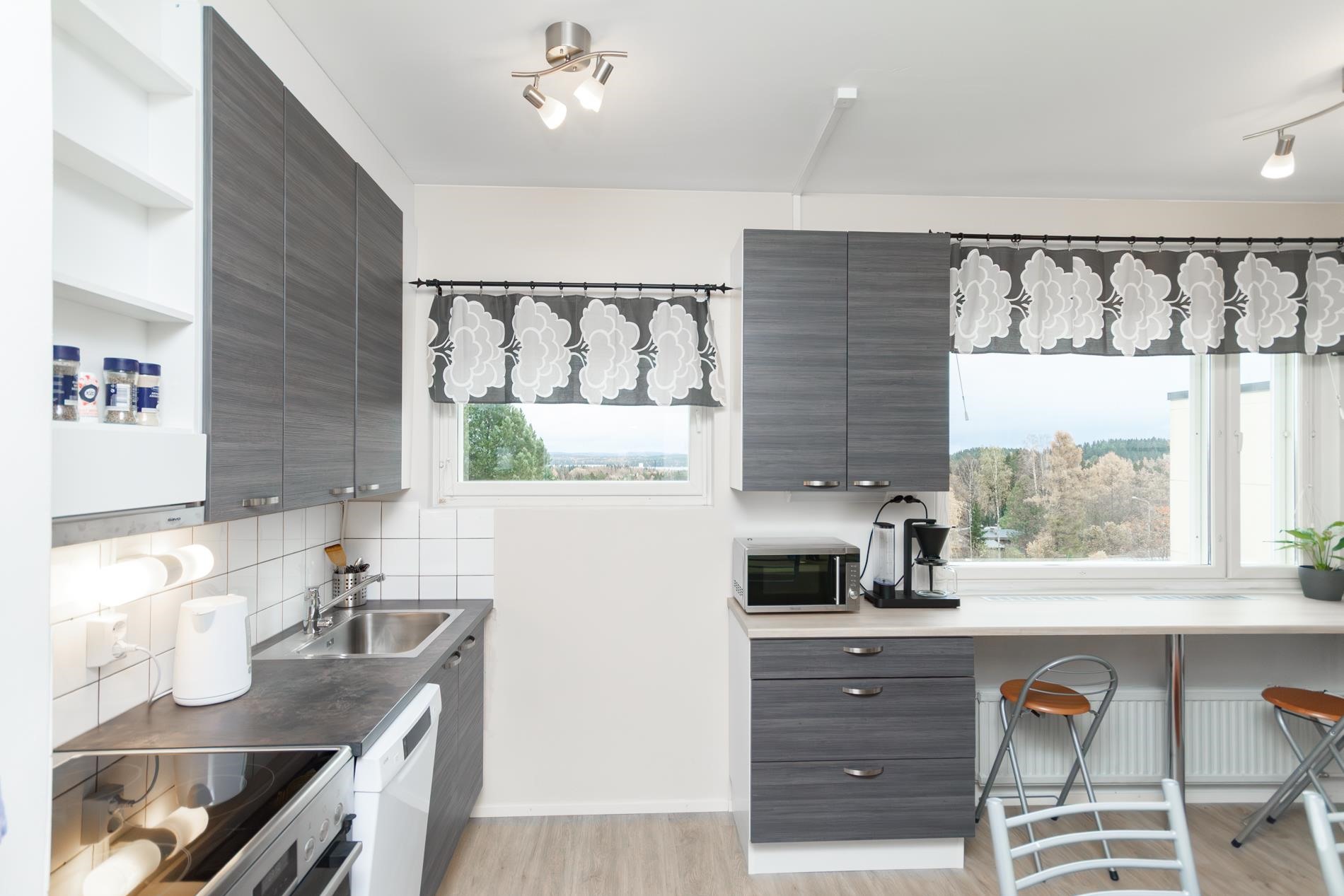 Keittiössä on paikka ruokapöydälle ja runsaasti kaappi- ja laskutilaa sekä komeat maisemat ikkunoista itään päin. Olohuoneesta on käynti lasitetulle parvekkeelle. Isossa ikkunallisessa vaatehuoneessa on tilaa vaatteille ja vaikka pienelle kirjoituspöydälle ja työpisteelle. Kylpyhuoneessa on pyykinpesukone vuokralaisen käytettävissä toiminta-aikansa ajan.