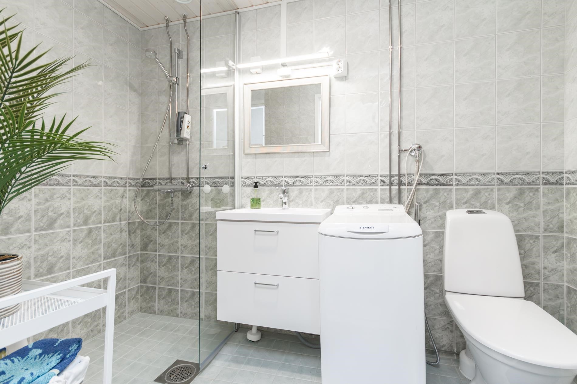 - Kylpyhuone, suihku, suihkuseinä, peilit, allaskaappi, pesukoneliitäntä, lattialämmitys, kiinteät valaisimet. Pyykinpesukone on vuokralaisen käytettävissä toiminta-aikansa ajan.