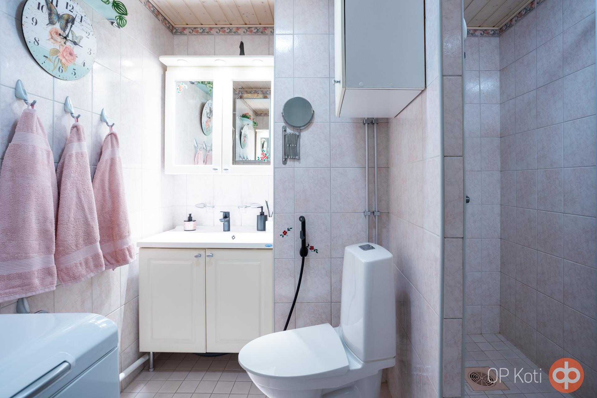 - Kylpyhuone, suihku, suihkukaappi, peilikaappi, allaskaappi, pesukoneliitäntä, kiinteät valaisimet.