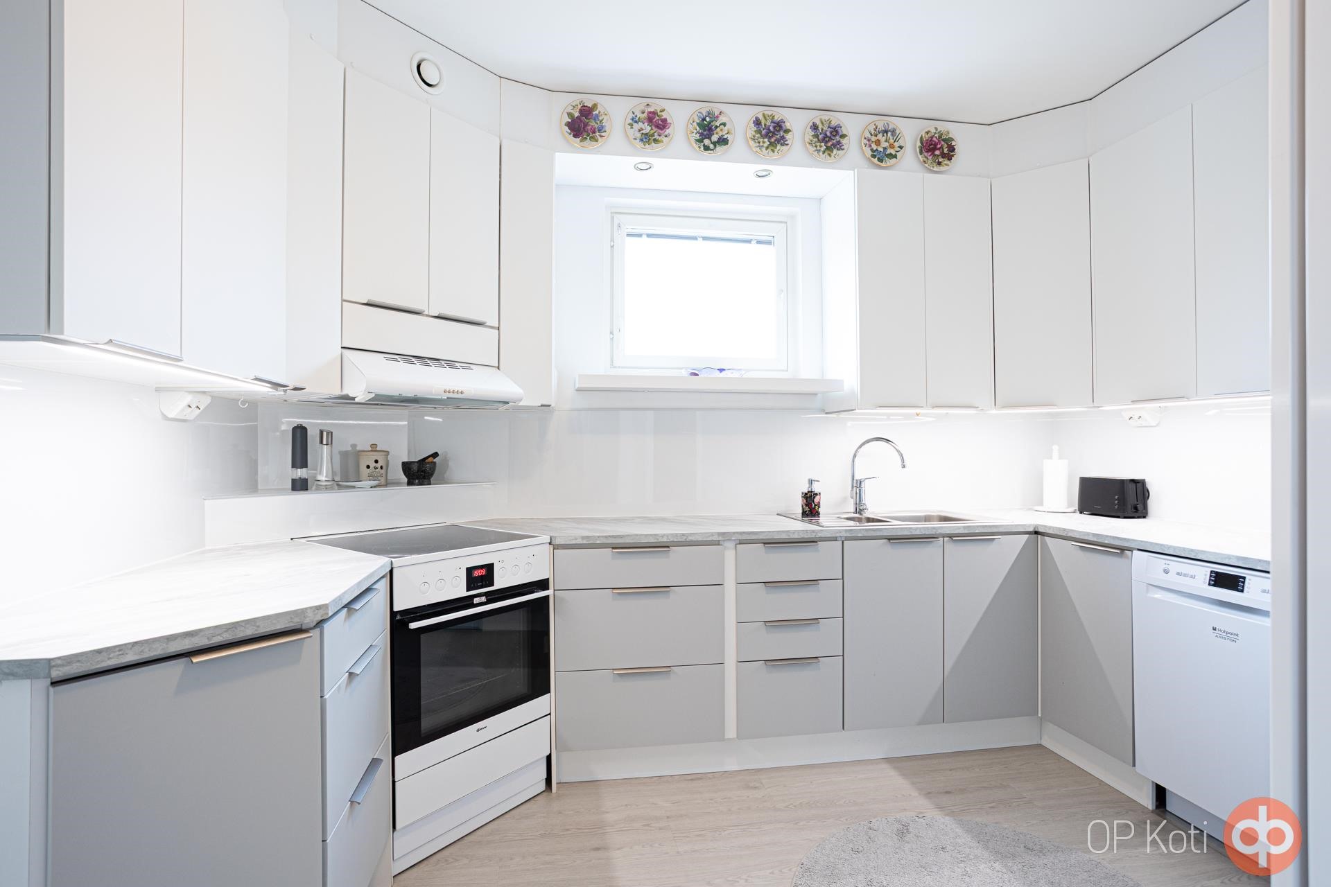 - Jääkaappipakastin, lattialiesi 2022, keraaminen liesi, liesituuletin 2022, astianpesukone, kaapistot, kiinteät valaisimet.