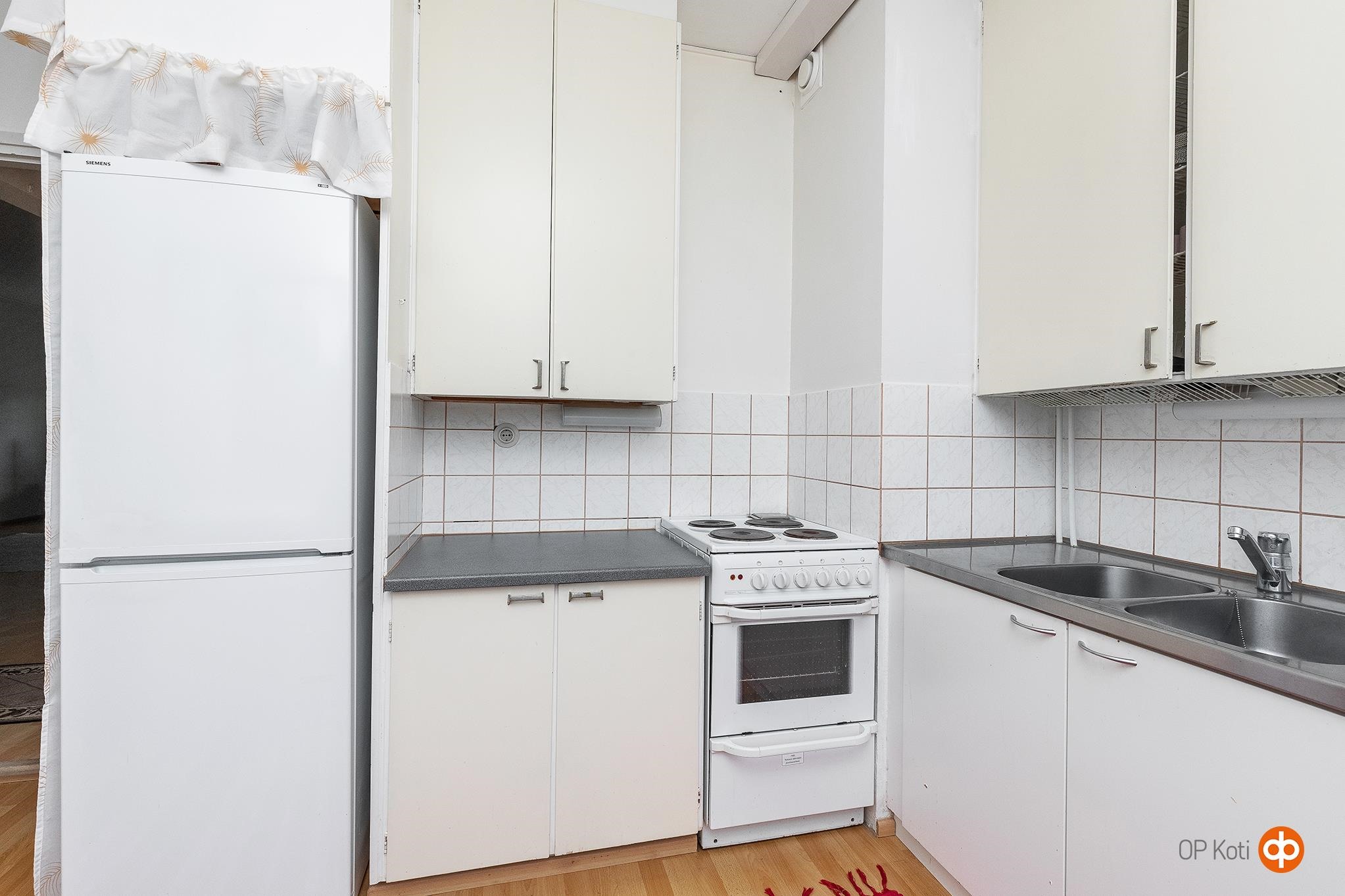 - Jääkaappipakastin, sähköliesi, kaapistot, kiinteät valaisimet, Keittiön tasot: Teräs / laminaatti.