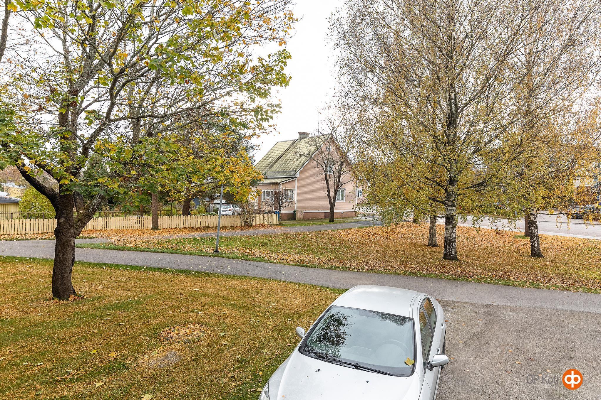 - Läpitalon huoneisto. Makuuhuone ja keittiö takapihan suuntaan. Olohuone ja parveke kadulle lounaaseen.