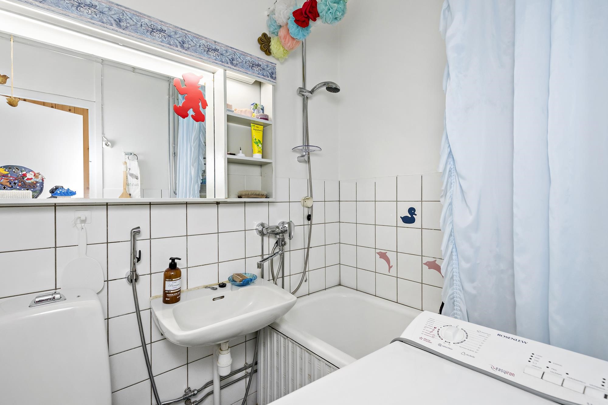 - Kylpyhuone, suihku, amme, peilikaappi, pesukoneliitäntä, kiinteät valaisimet.