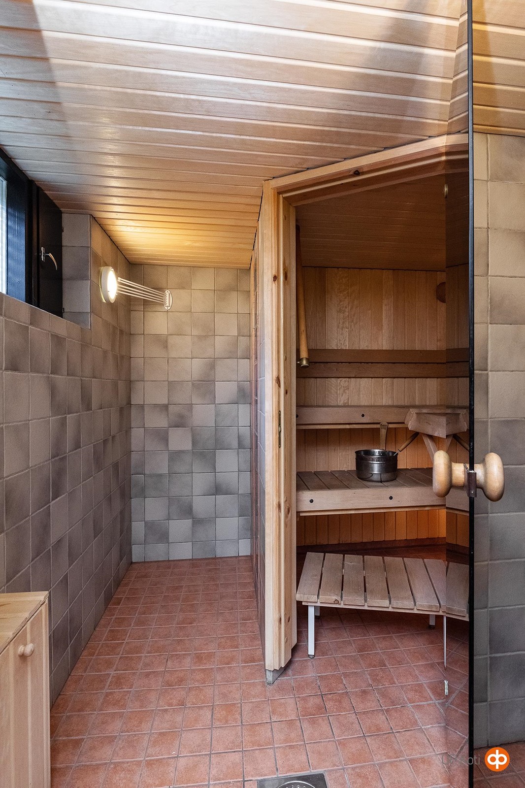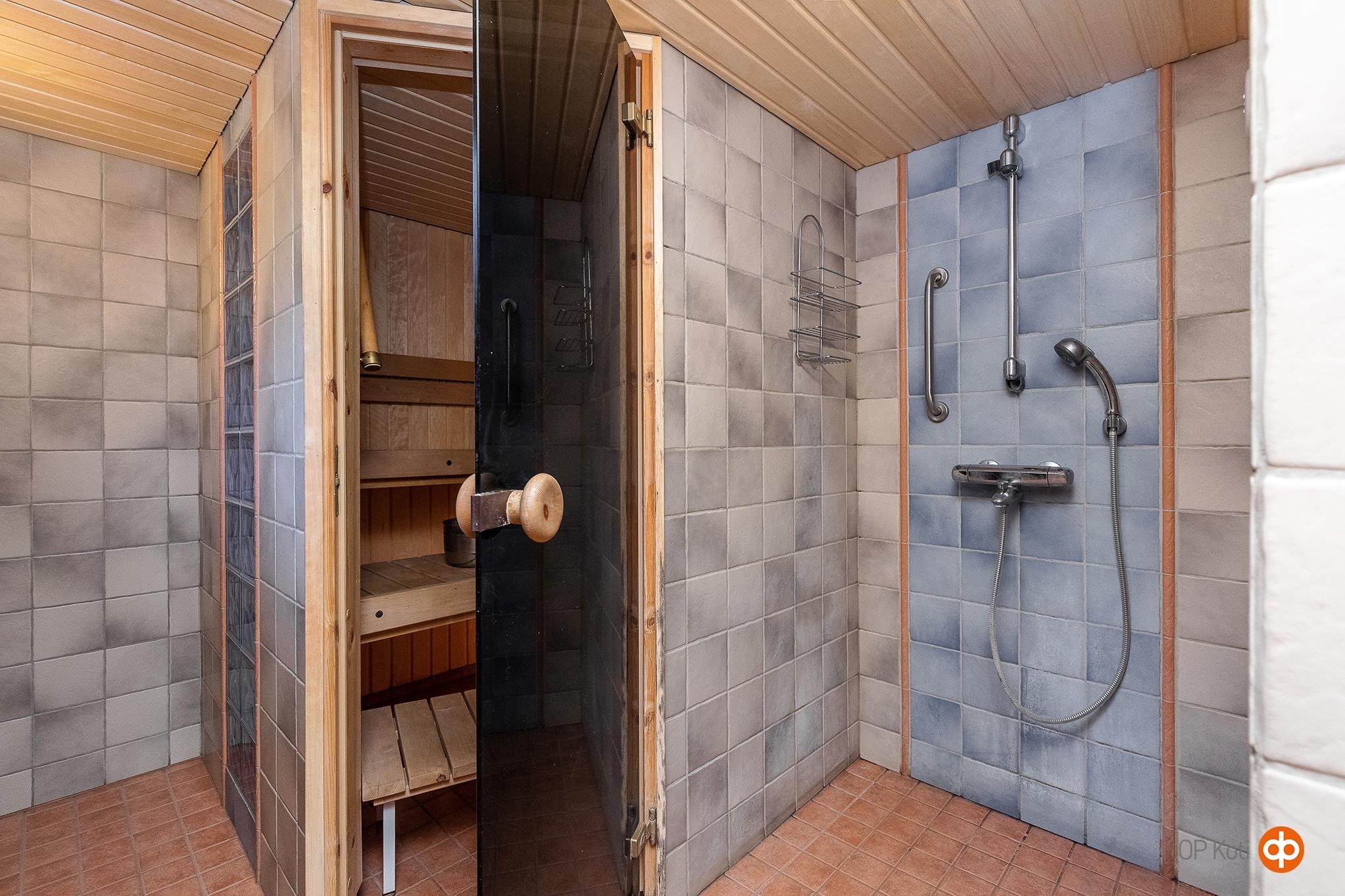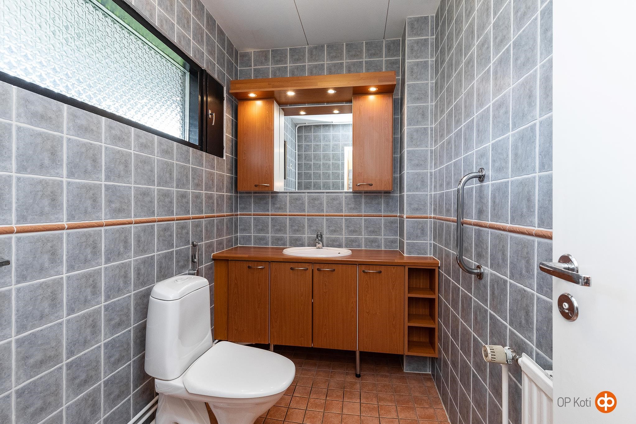 - Sauna, sähkökiuas vuolukivikiuas, kylpyhuone, erillinen wc 2 kpl, ylä- ja alakerrassa, suihku, peilit yläk.wc + kaapit sivuilla + allaskaapit, allaskaappi yläkerran erillinen wc, pesukoneliitäntä yläkerran erillinen wc, lattialämmitys alakerran kph vesikiertoinen, kiinteät valaisimet. Yläkerran asuintilojen yhteydessä tilava erillinen wc, jossa mm. pesukoneliitäntä. Kellarikerroksessa mukavan kokoinen kylpyhuone ja sauna. Kylpyhuoneessa vesikiertoinen lattialämmitys ja ajan vaatimukset täyttävä vesieriste. Kellarikerroksessa lisäksi eriillinen wc. Kaikki pesutilat ovat siistikuntoisia ja remontoitu 2000-luvun alussa. Pesutilojen arvioitu remontti tehty vonna 2004, jolloin käyttövesiputket valmistettu/asennettu.