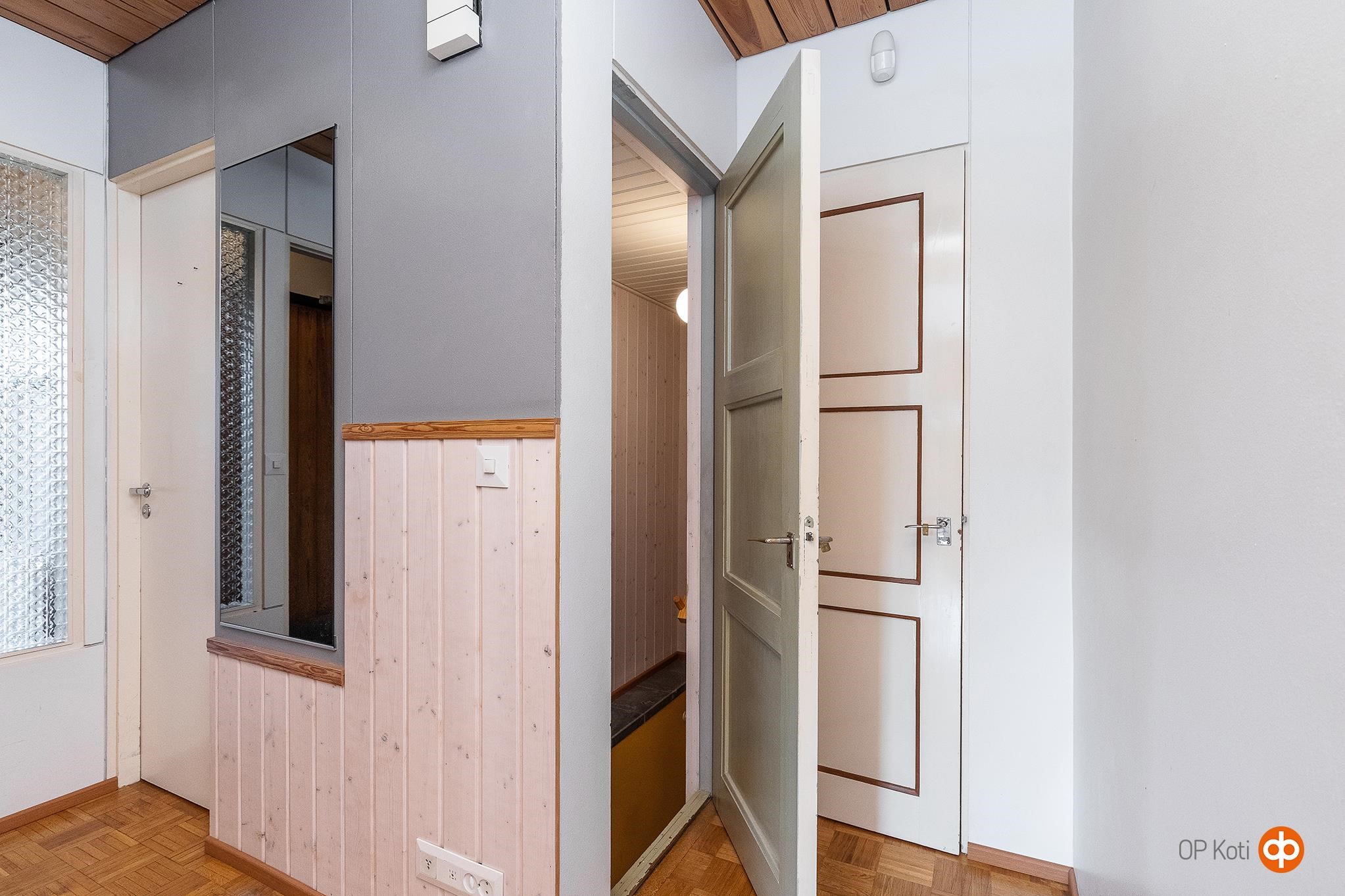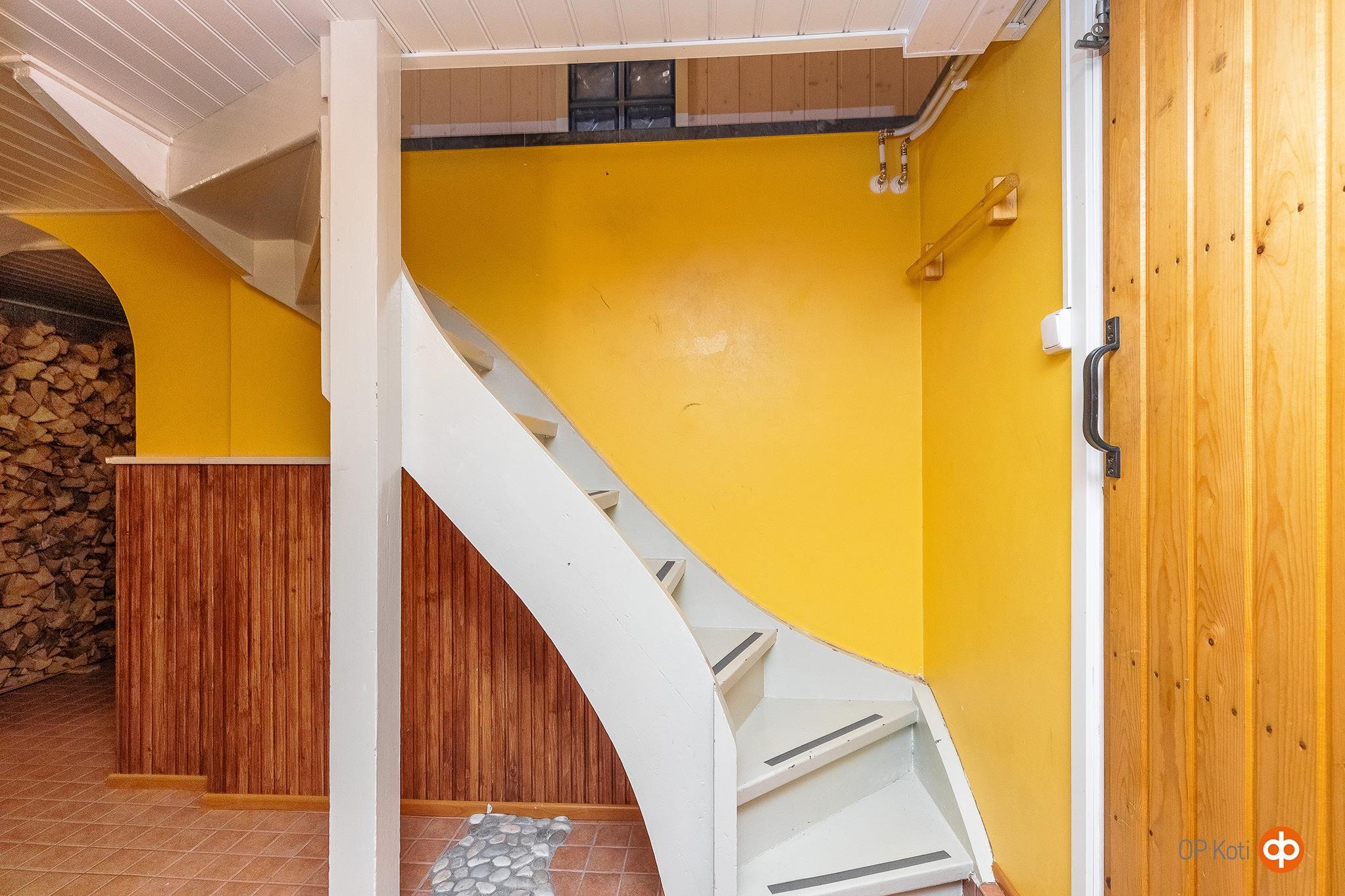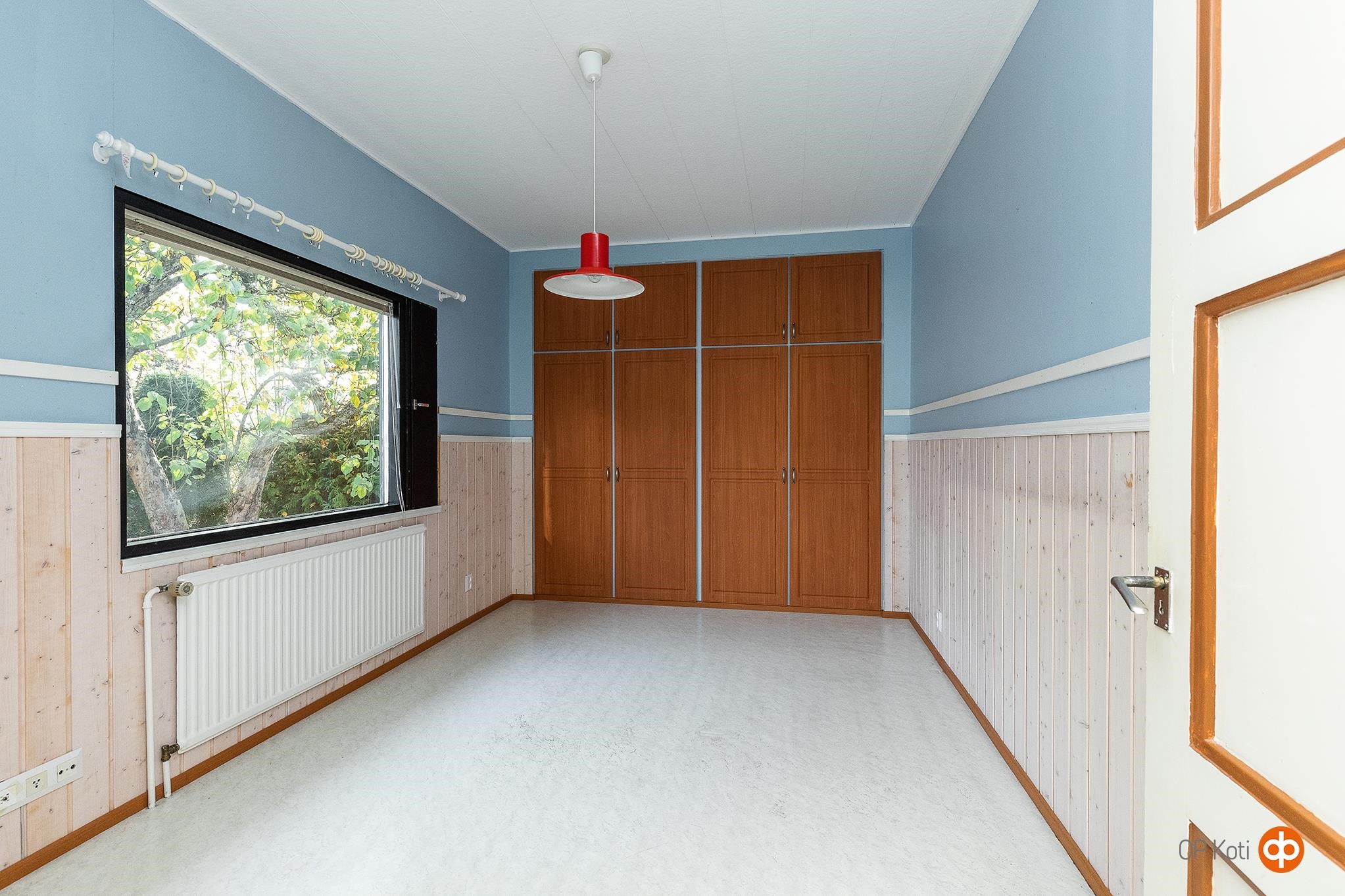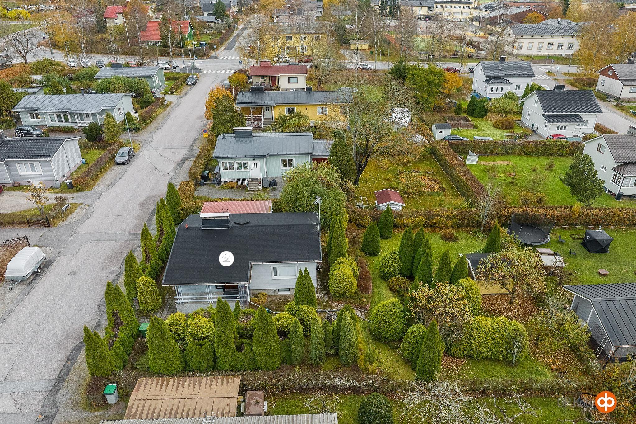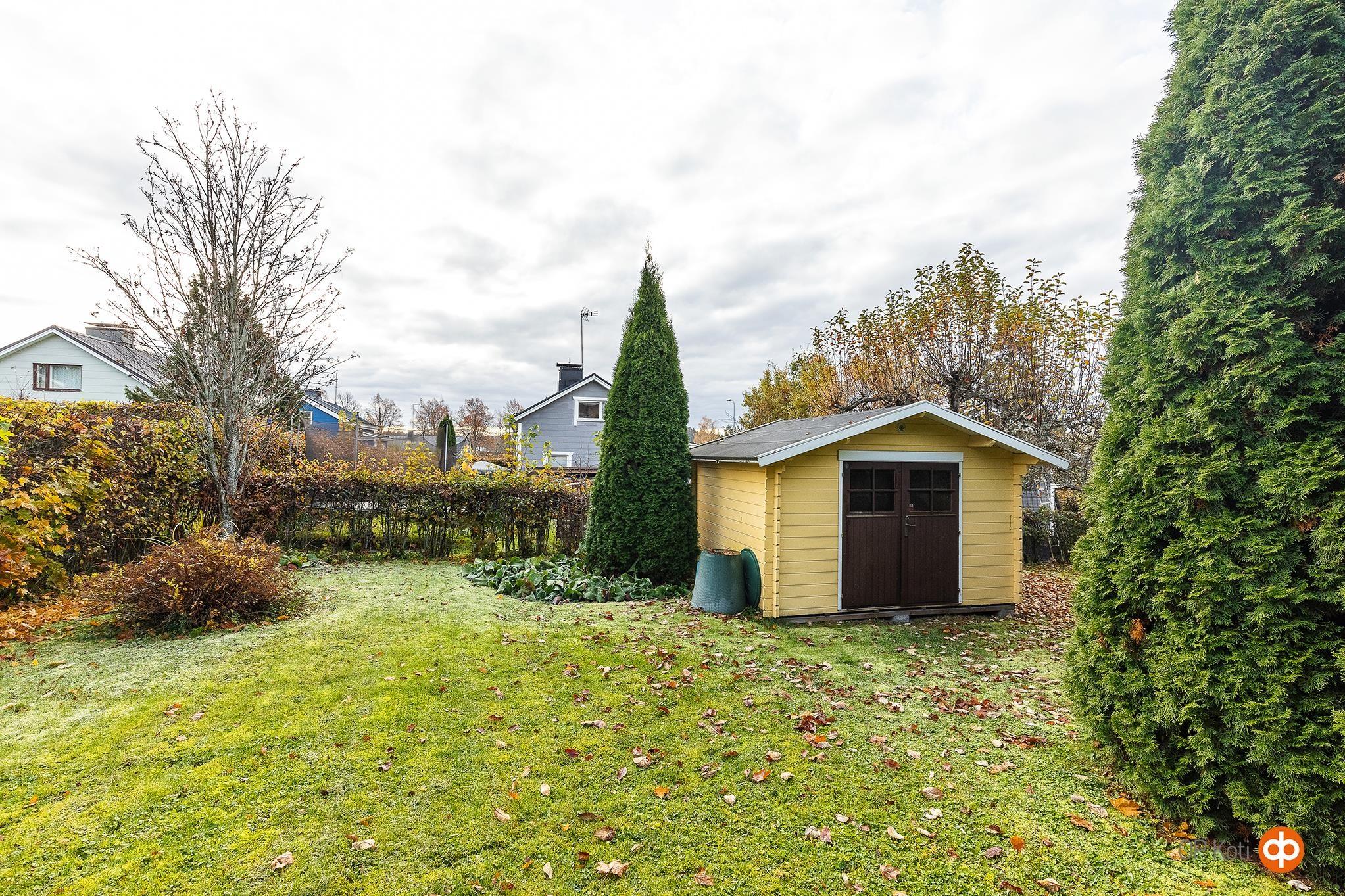 Vuonna 1940 valmistunut ruotsalaistalo, jossa asuintilat kahdessa kerroksessa. Yläkerrassa tilavat olohuone, keittiö ja makuuhuone sekä myöhemmin rakennettu erillinen wc. Yläkerrassa lisäksi avara eteistila ja vaatehuone. Eteistilasta rappuset alakerran asuintiloihin. Kellarikerroksessa tilava huonetila, joka tarvittaessa toimii kodin toisena makuuhuoneena ja ikkunallinen harrastetila, joka muuntuu esim. työtilaksi. Kellarikerroksessa löytyvät myös kylpyhuone ja sauna sekä erillinen wc. Alakerran tiloista talon toinen uloskäynti Kärkänkadun puolelle.