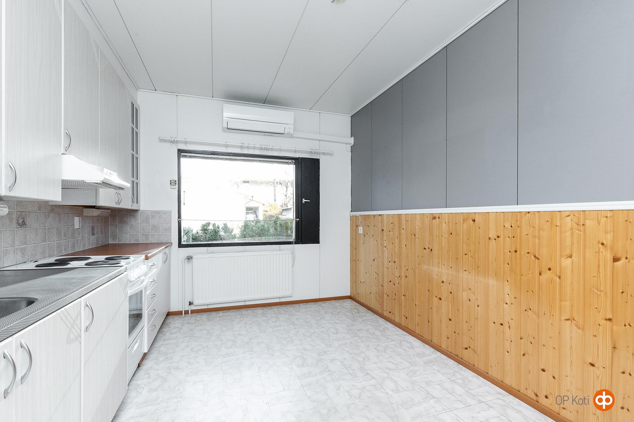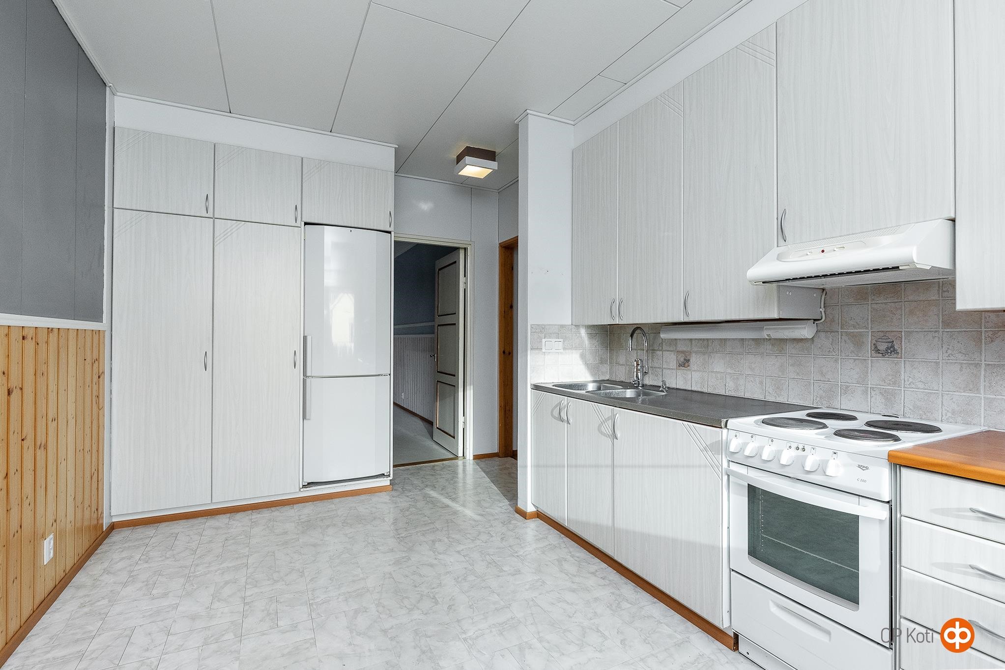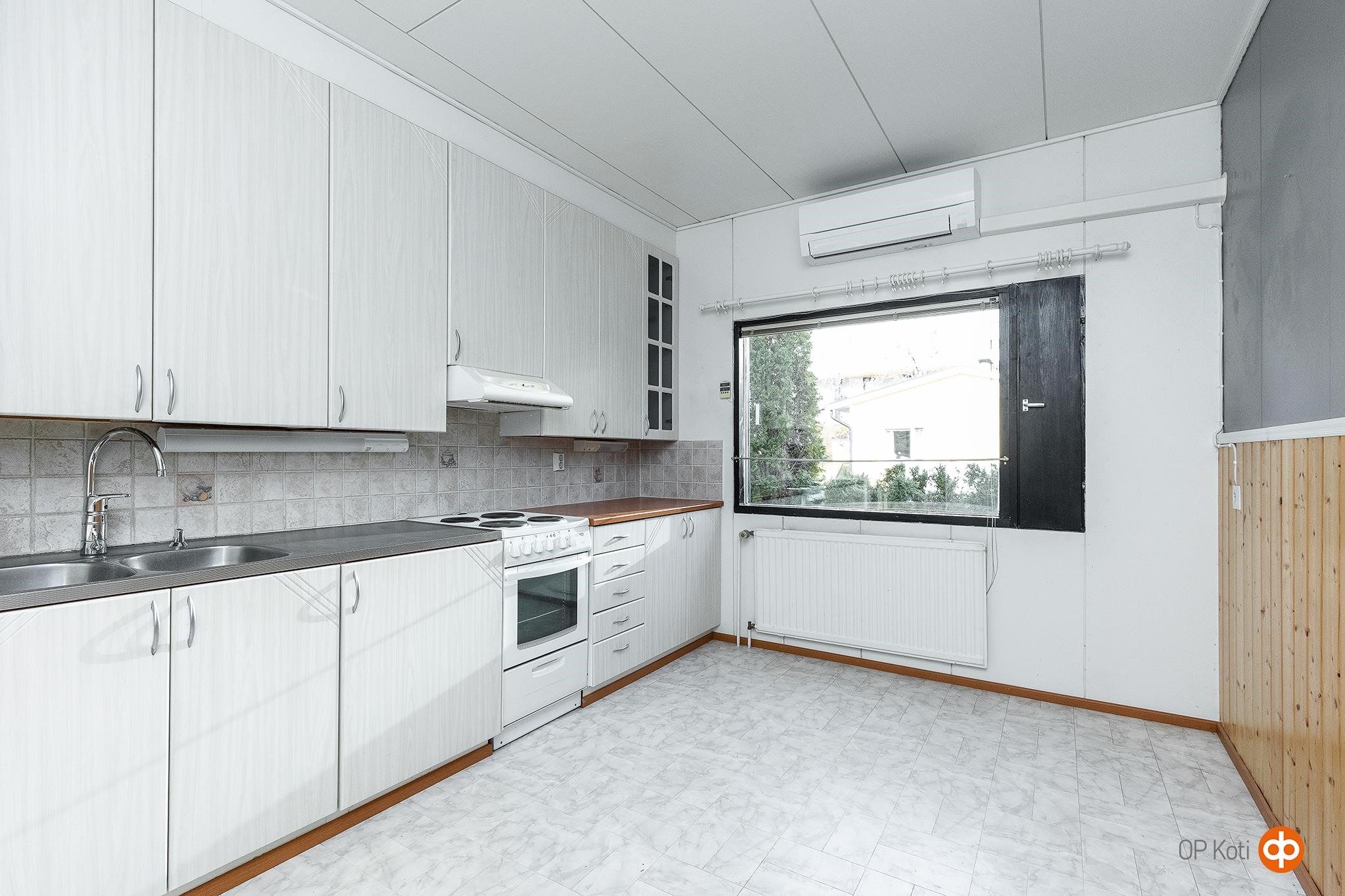 - Jääkaappipakastin, sähköliesi, kaapistot, kiinteät valaisimet. Siistikuntoinen tilava keittiö, joka kaapistojen perusteella uusittu 90-luvun lopulla. Keittiö omana tilanaan erillään olohuoneesta. Mukavasti kaapistoja ja hyvä paikka suuremmallekin ruokapöydälle.